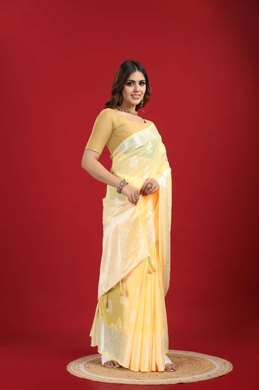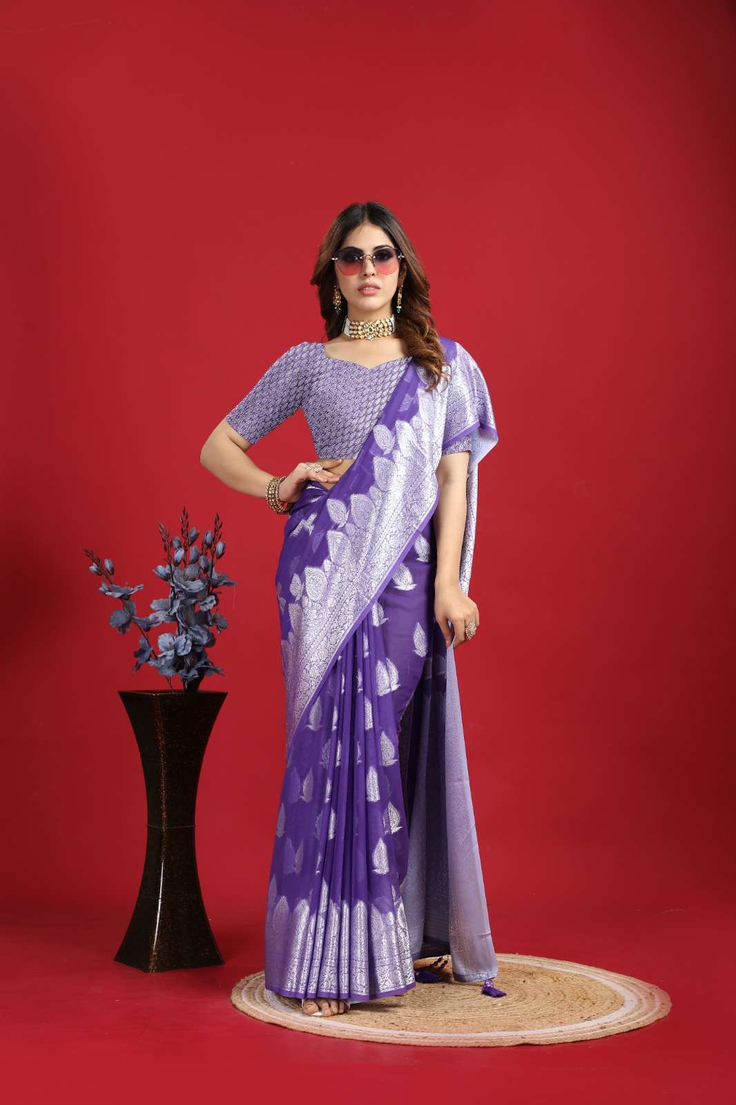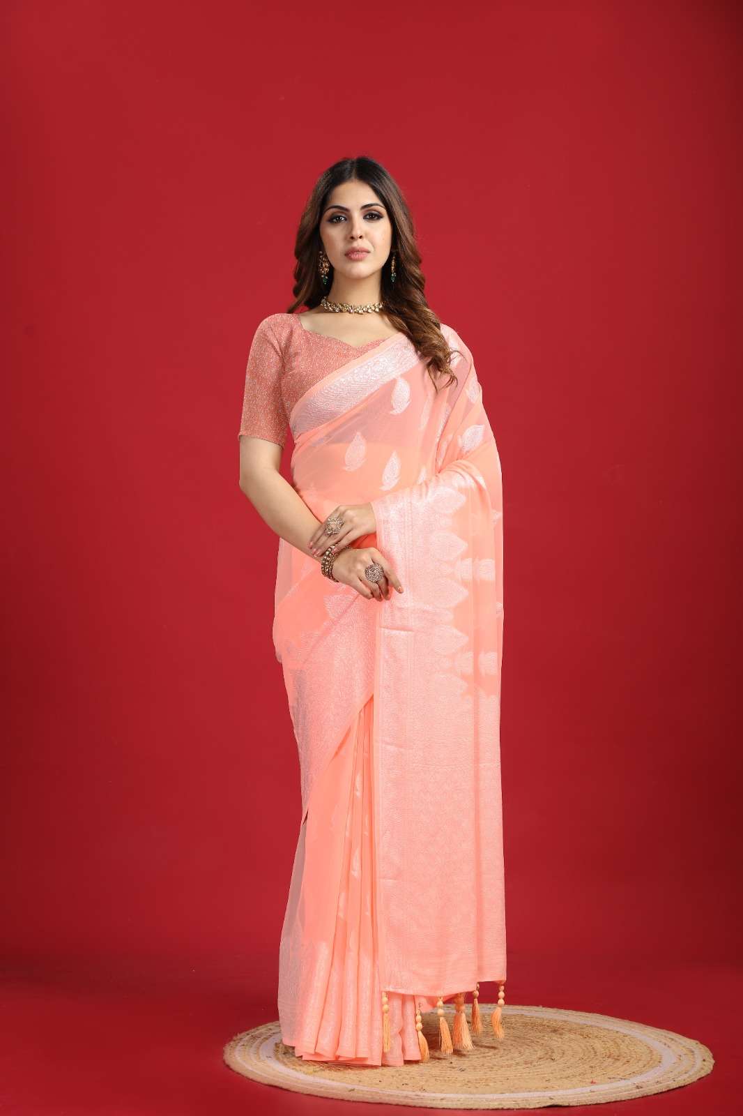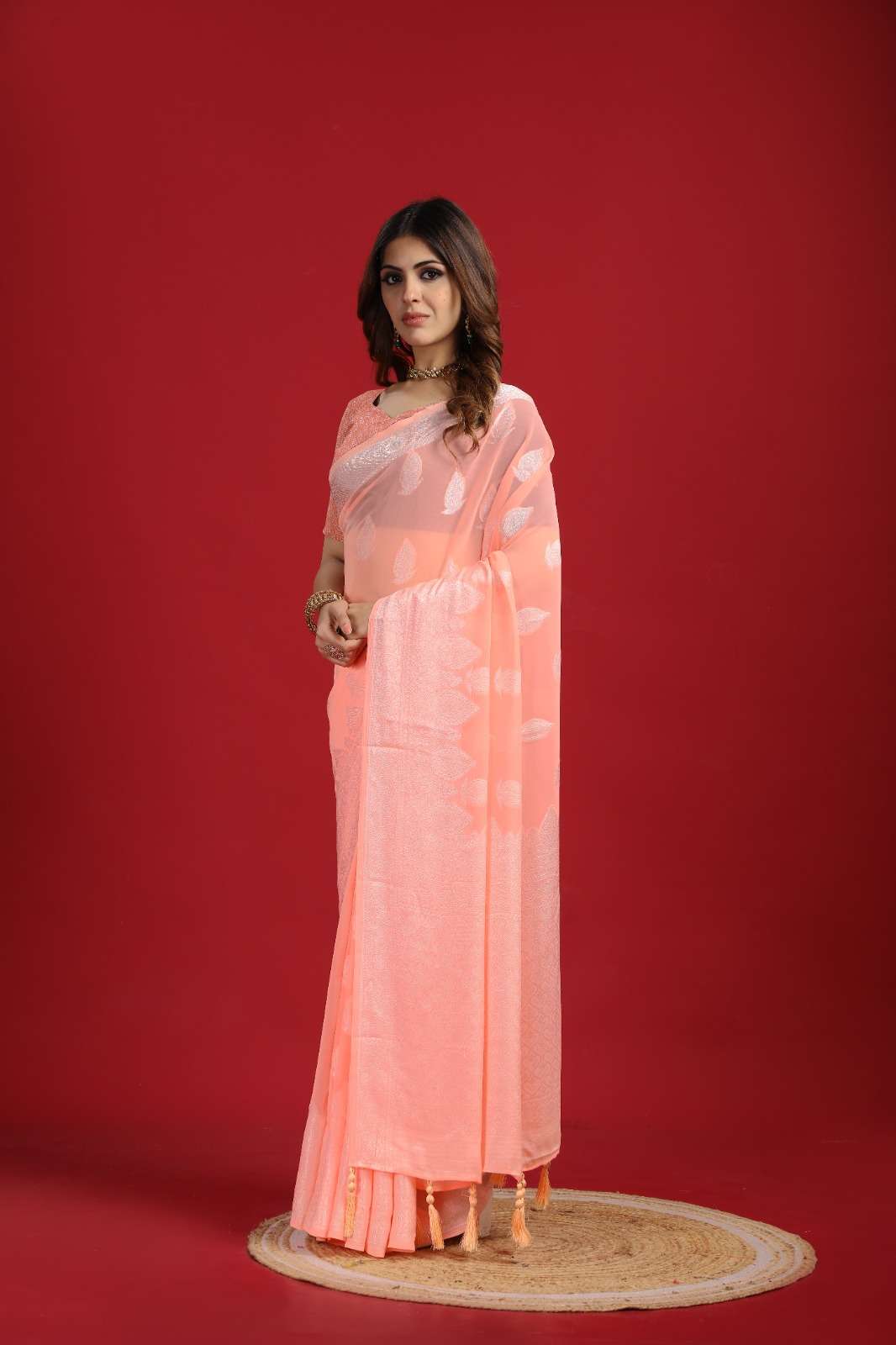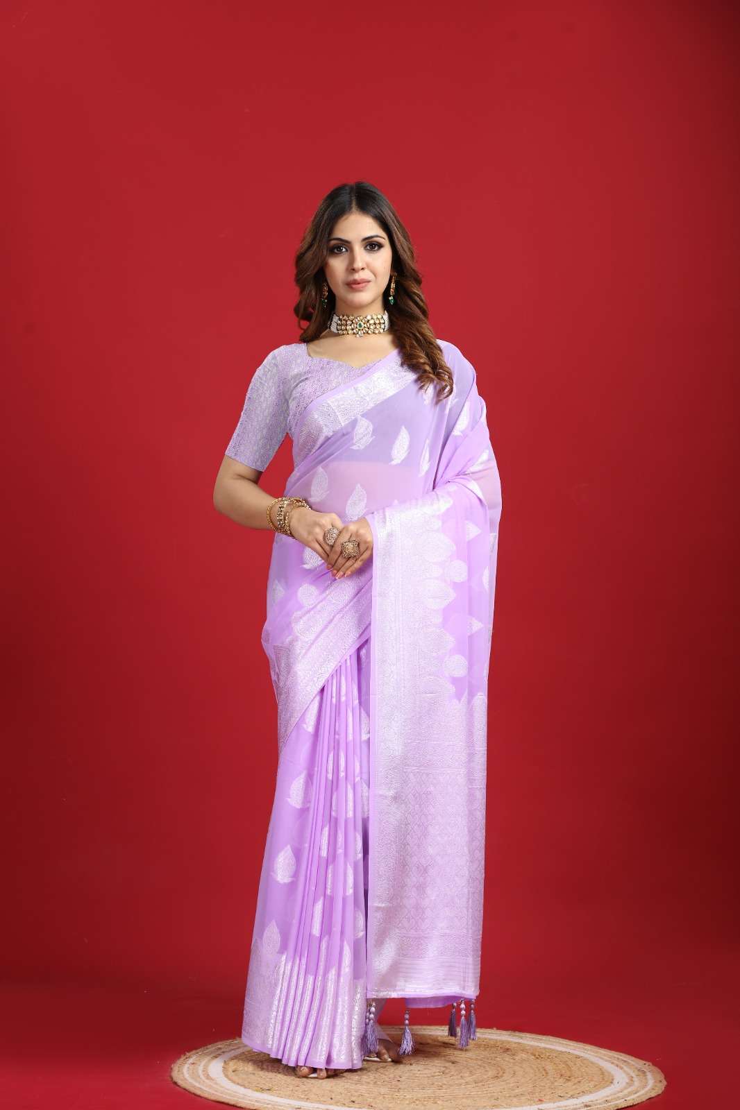 Catalog Name : *Meghna* No of Pcs : 5 Fabric : Georgette Work : Weaving print with weaving zari border with running blouse