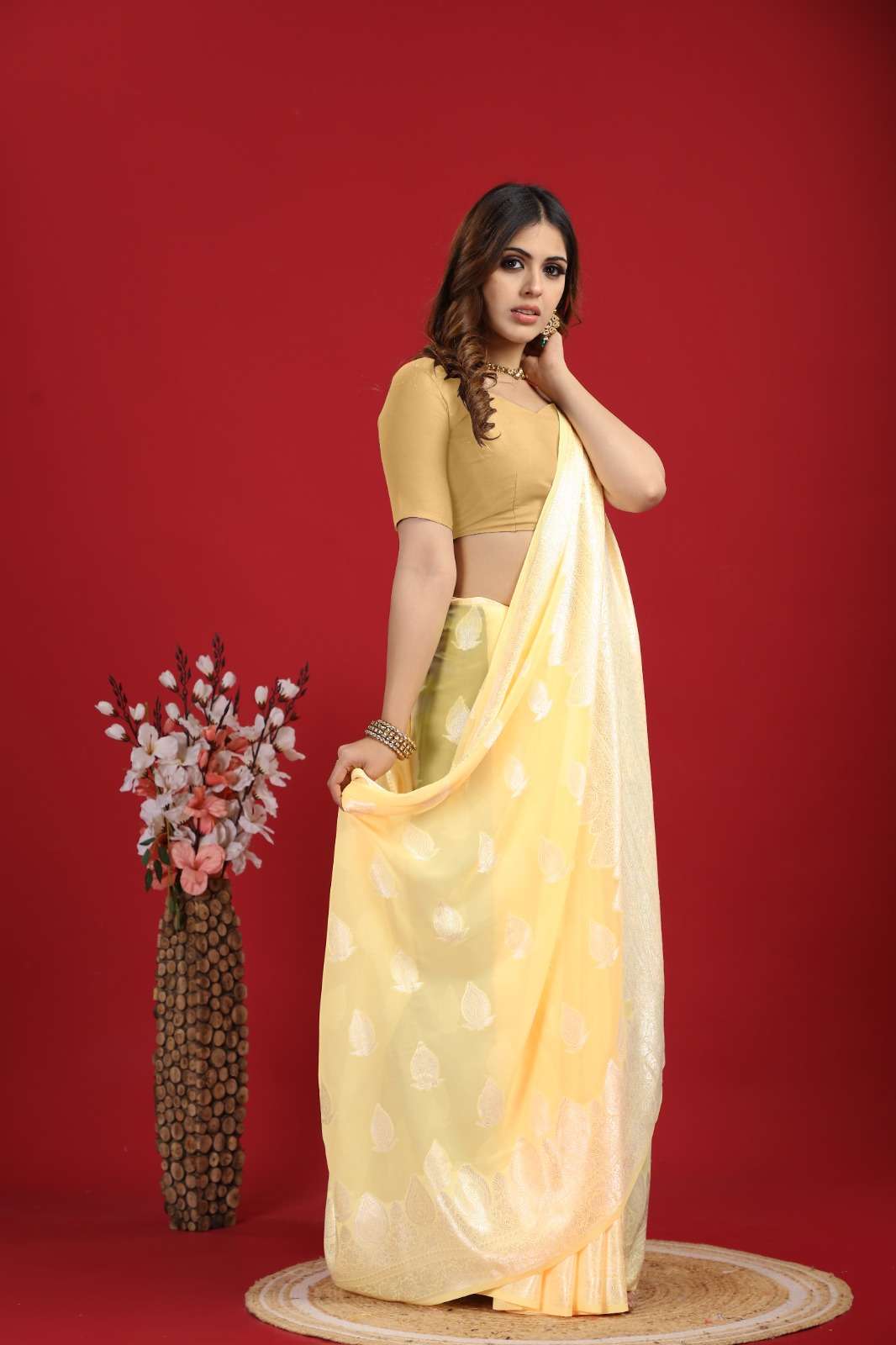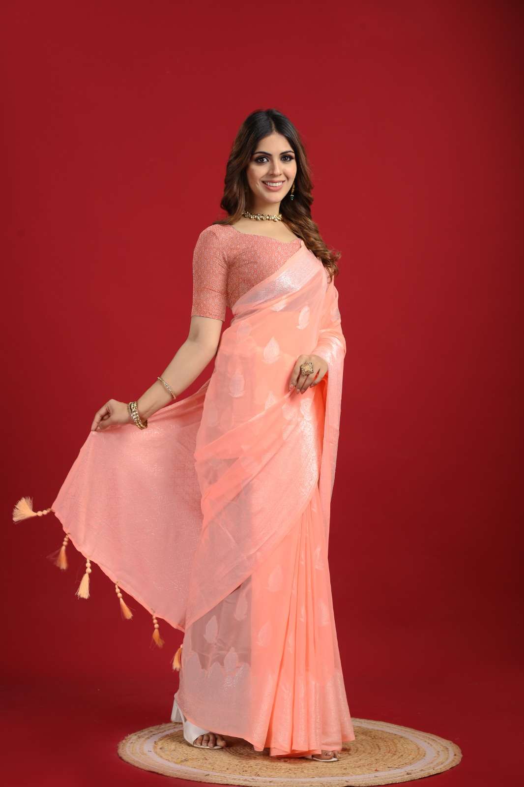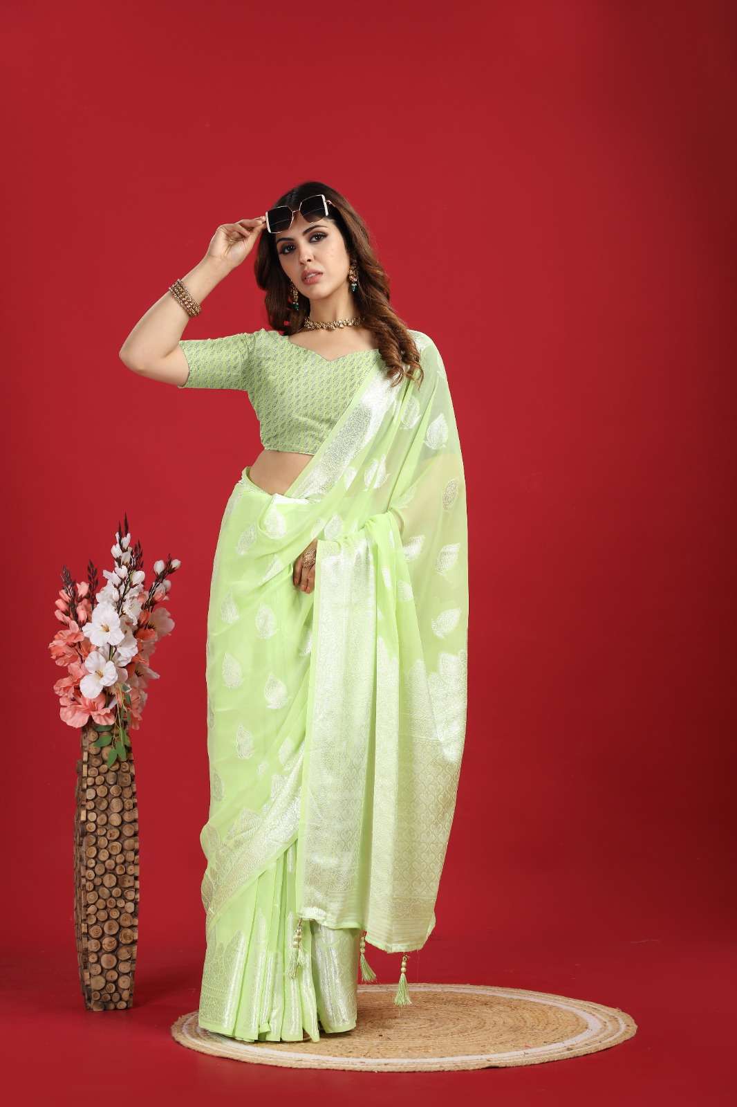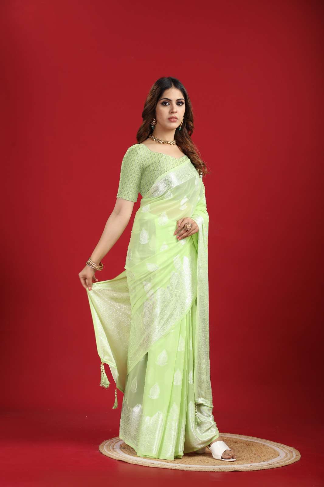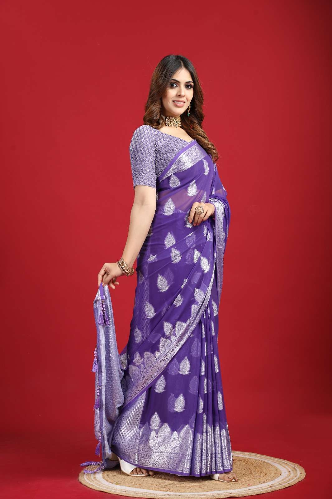 Catalog Name : *Meghna* No of Pcs : 5 Fabric : Georgette Work : Weaving print with weaving zari border with running blouse