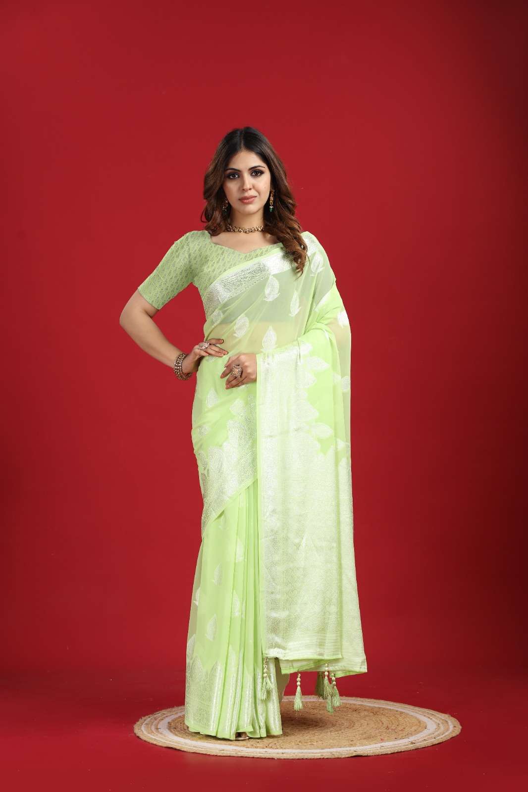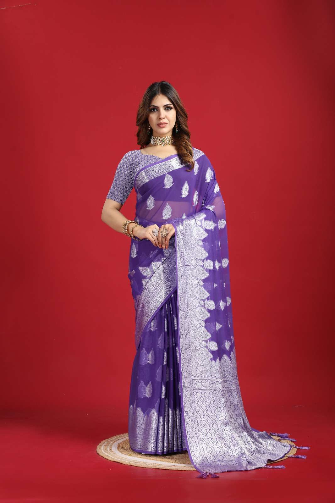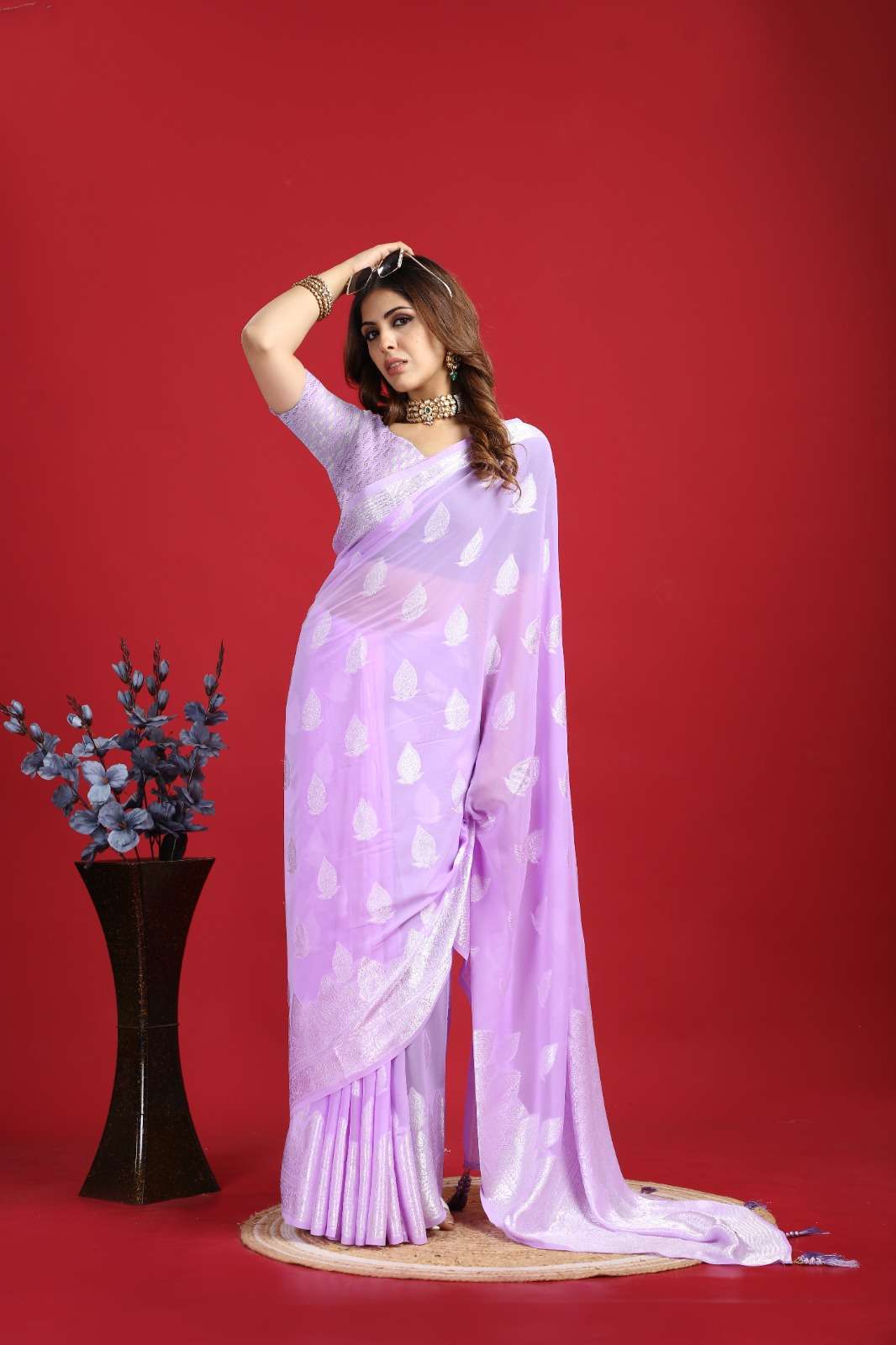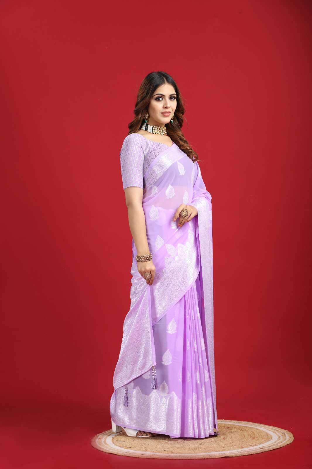 Catalog Name : *Meghna* No of Pcs : 5 Fabric : Georgette Work : Weaving print with weaving zari border with running blouse
