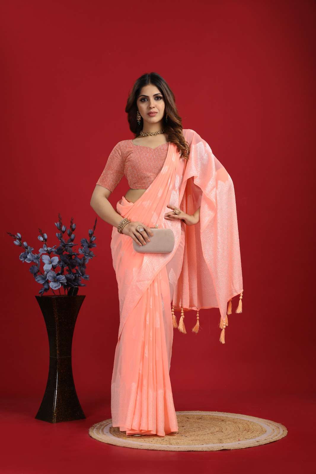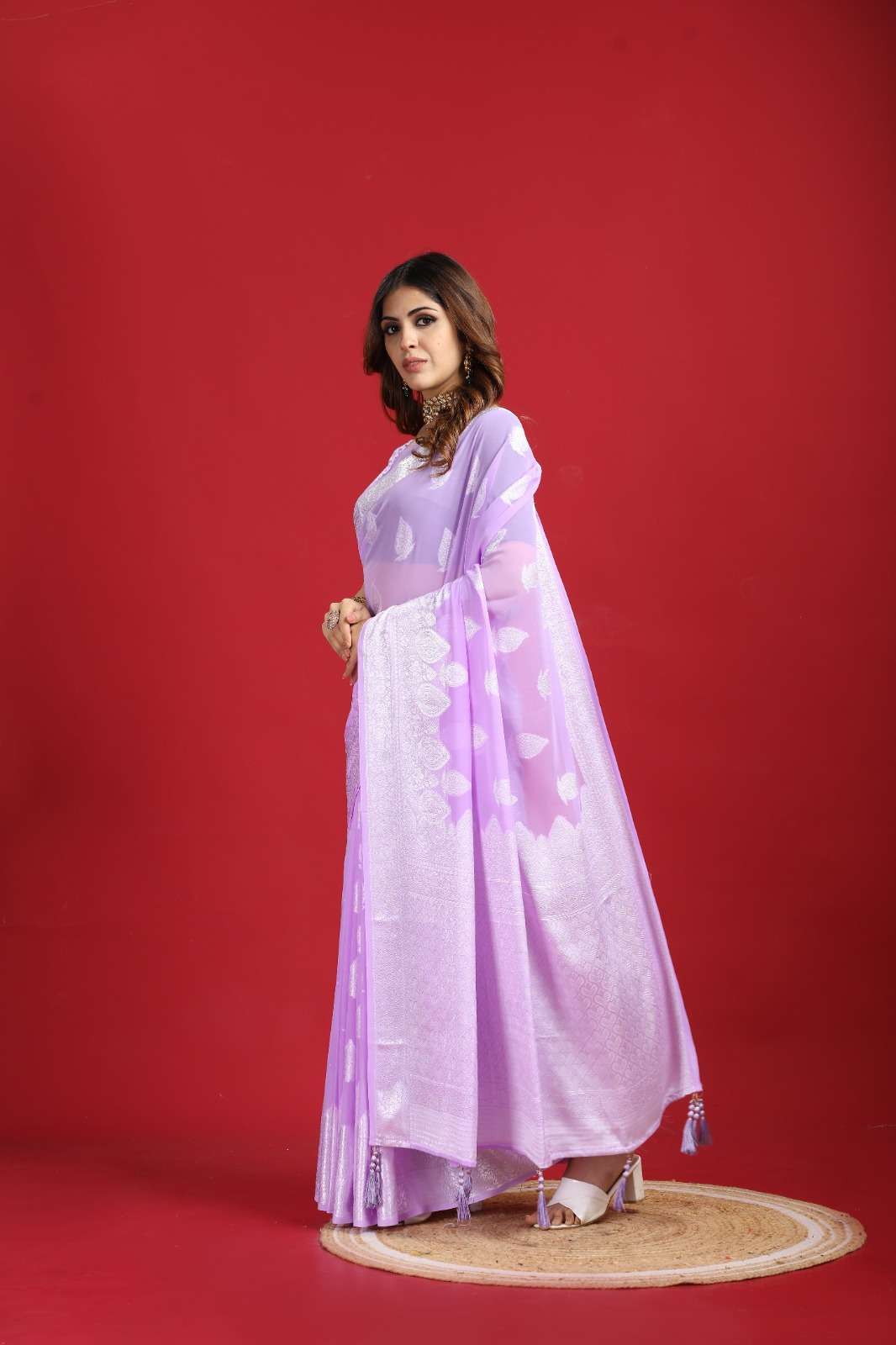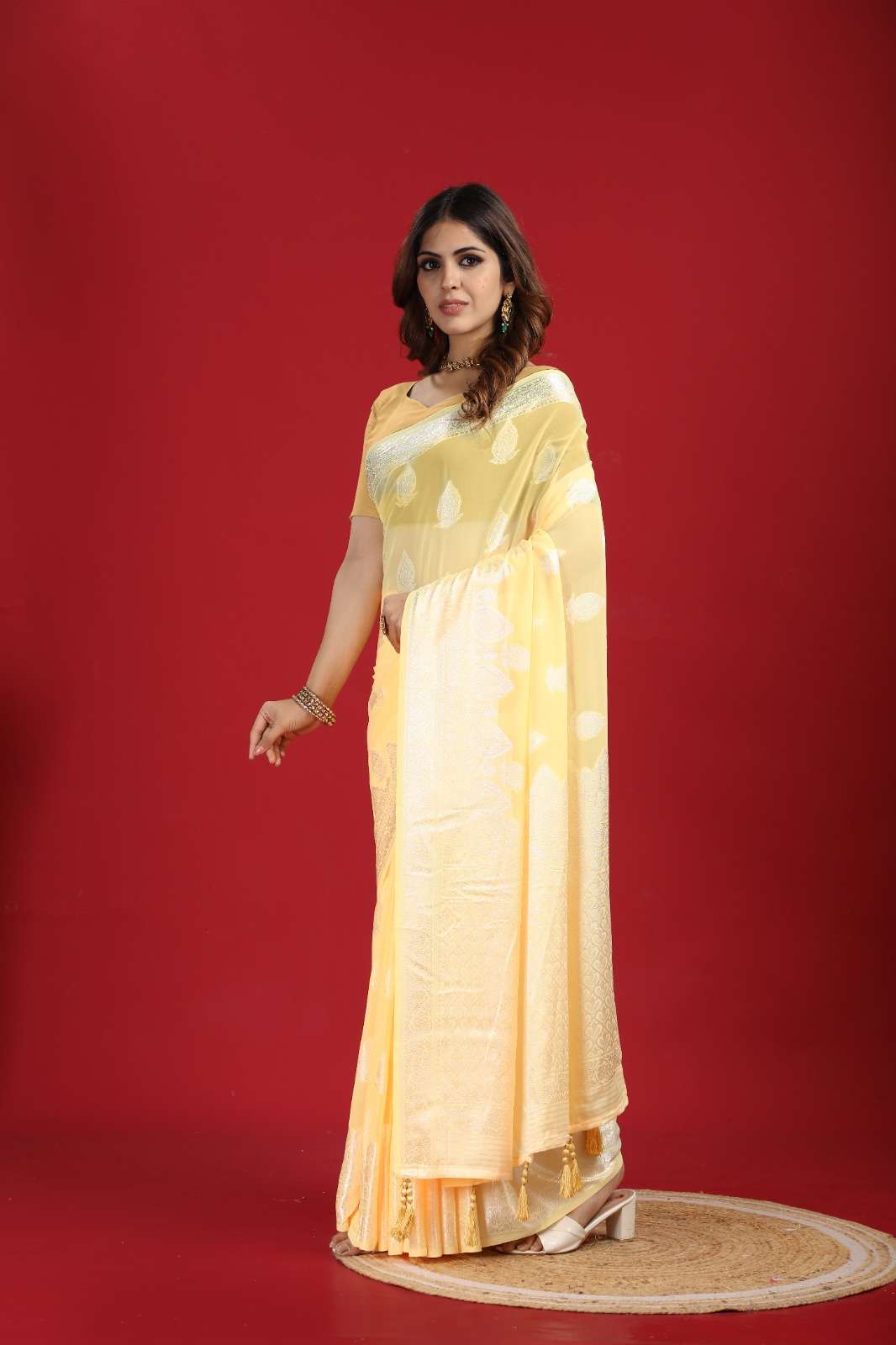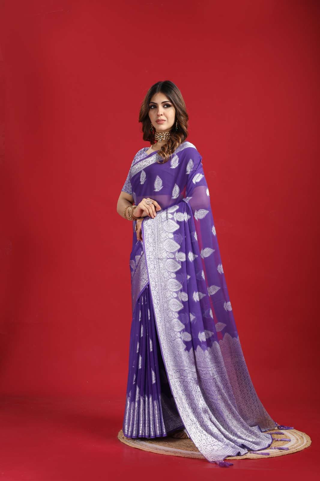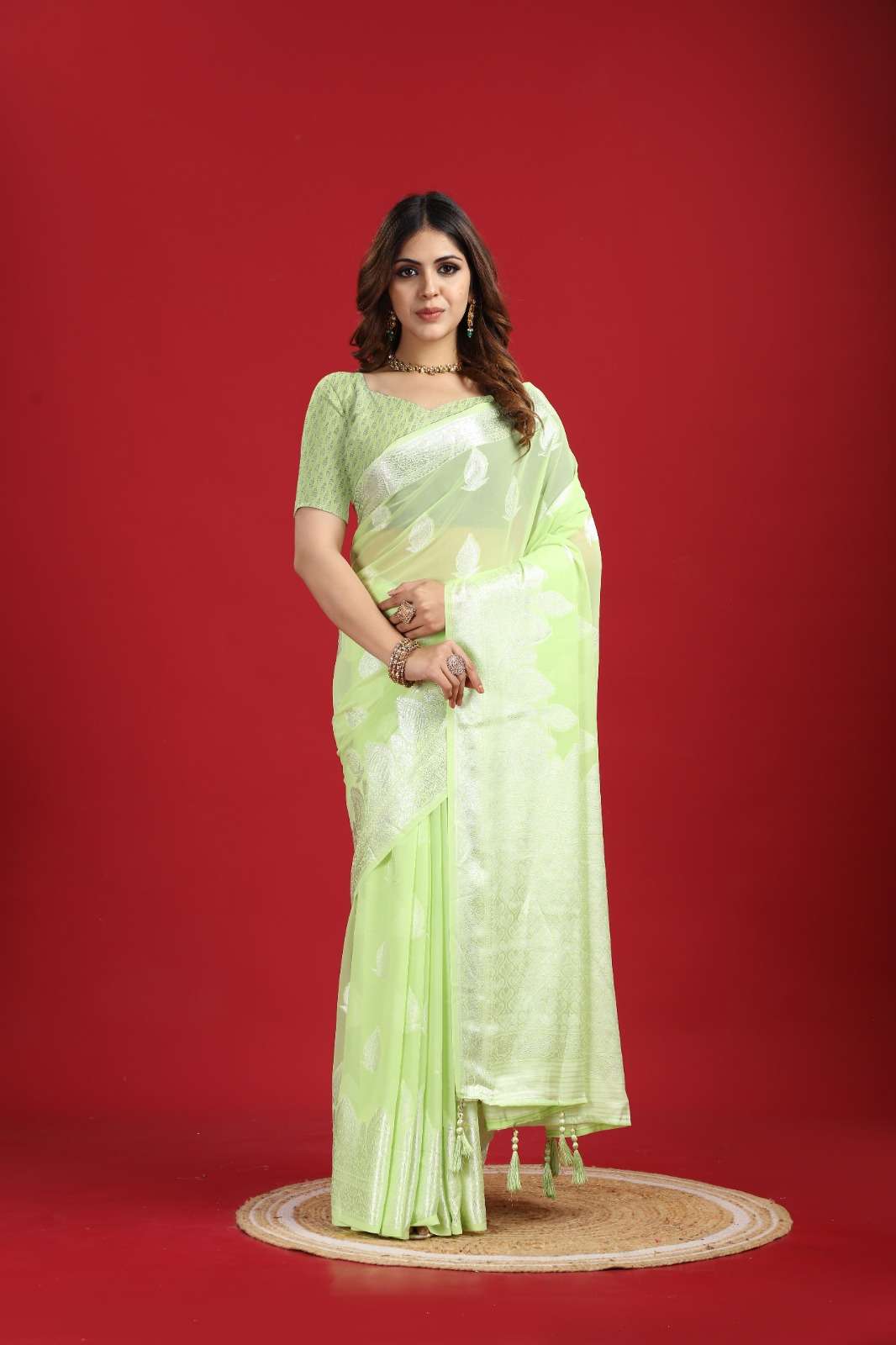 Catalog Name : *Meghna* No of Pcs : 5 Fabric : Georgette Work : Weaving print with weaving zari border with running blouse