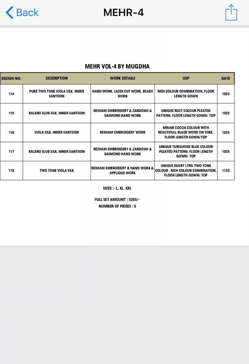 Buy Online Meher Vol 4 By Mugdha Designer Party Wear Gowns Wholesale Supplier Nd Dealer Gujarat 5 Pcs of Full Catalogue at Wholesale Price. Looking for Meher Vol 4 By Mugdha Designer Party Wear Gowns Wholesale Supplier Nd Dealer Gujarat Full Catalouge at Best Price? Buy Now Meher Vol 4 By Mugdha Designer Party Wear Gowns Wholesale Supplier Nd Dealer Gujarat at Wholesale Rate of Rs 0 with Total 5 Pcs from authroized dealer and supplier of MUGDHA Brand. Cost of Each piece is just only Rs 0 which is very low and affordable price to resale the product in your retail store ,This is Surat based Wholesale Supplier & Dealer of MUGDHA Brand. Click on Brand name to Know more about MUGDHA Brand's products.Call or Whatsapp on 9898838984 for booking or enquiry
