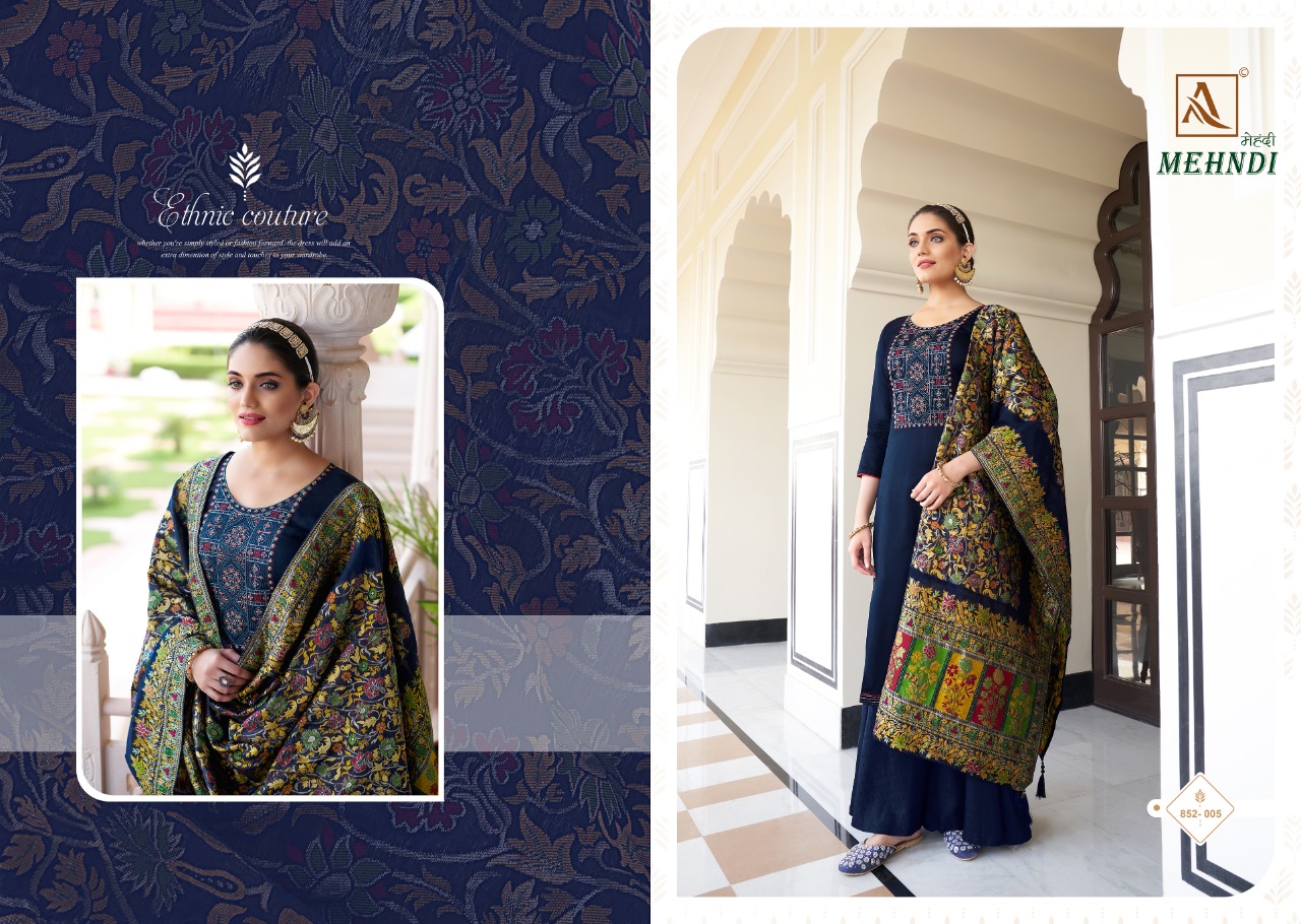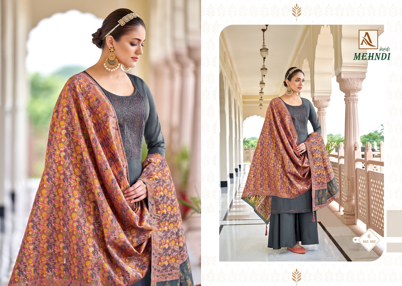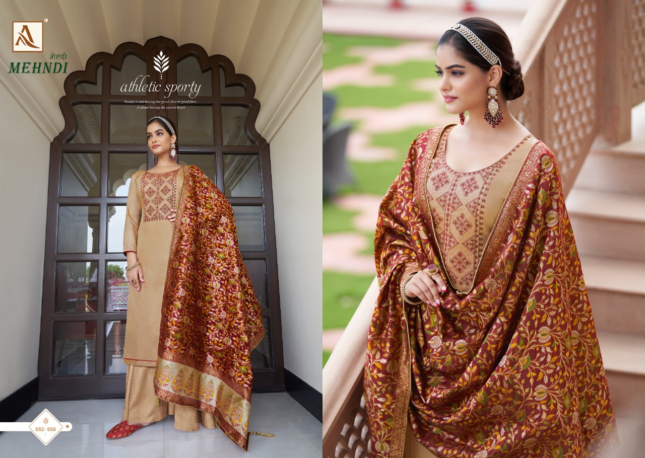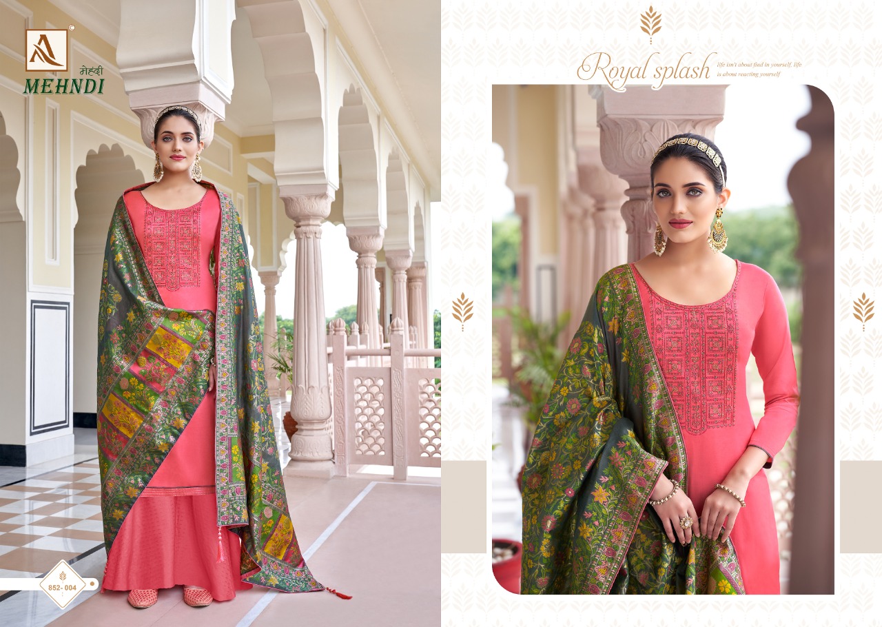 Buy Online Mehndi By Alok Suit Wholesale Supplier Traders In Surat 8 Pcs of Full Catalogue at Wholesale Price. Looking for Mehndi By Alok Suit Wholesale Supplier Traders In Surat Full Catalouge at Best Price? Buy Now Mehndi By Alok Suit Wholesale Supplier Traders In Surat at Wholesale Rate of Rs 7800 with Total 8 Pcs from authroized dealer and supplier of Brand. Cost of Each piece is just only Rs 975 which is very low and affordable price to resale the product in your retail store ,This is Surat based Wholesale Supplier & Dealer of Brand. Click on Brand name to Know more about Brand's products.Call or Whatsapp on 9898838984 for booking or enquiry