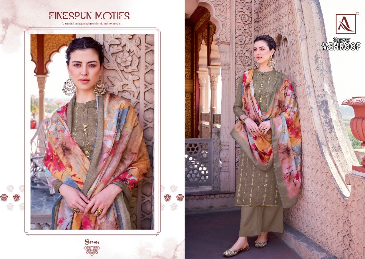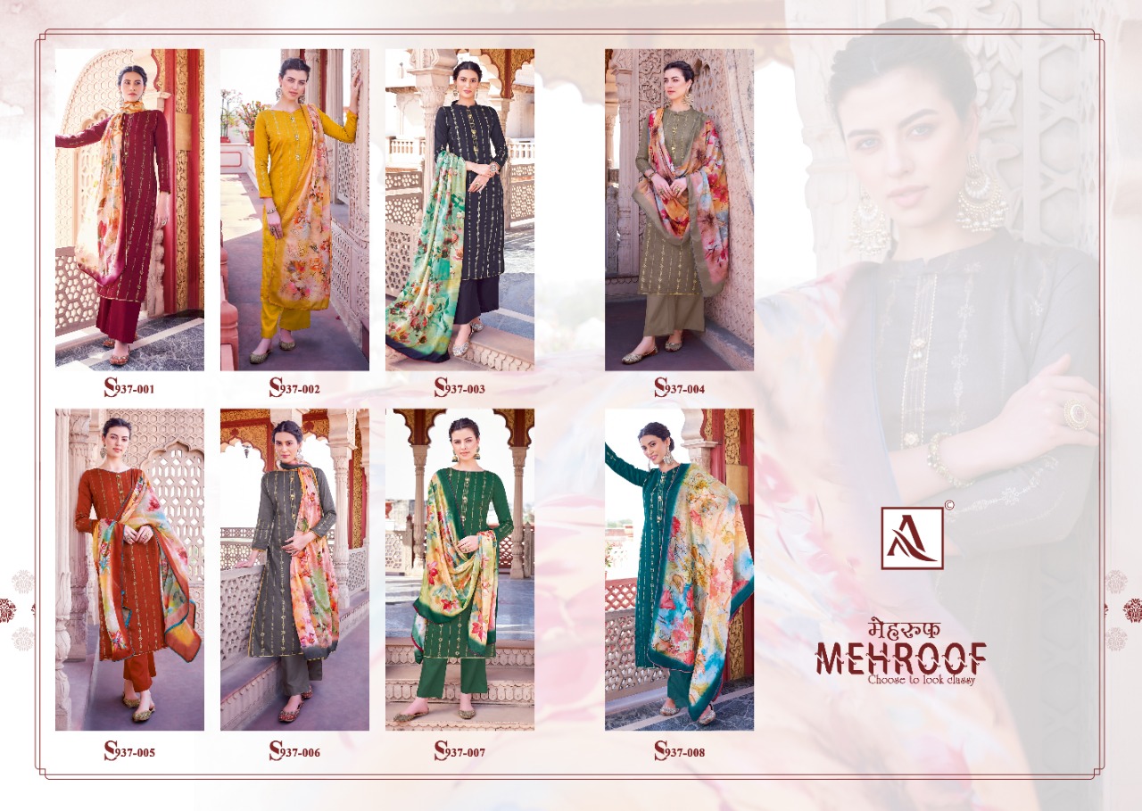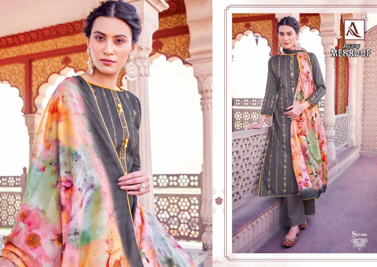 Buy Online Mehroof By Alok Suit Dealer And Exporter Surat Gujarat 8 Pcs of Full Catalogue at Wholesale Price. Looking for Mehroof By Alok Suit Dealer And Exporter Surat Gujarat Full Catalouge at Best Price? Buy Now Mehroof By Alok Suit Dealer And Exporter Surat Gujarat at Wholesale Rate of Rs 6392 with Total 8 Pcs from authroized dealer and supplier of Brand. Cost of Each piece is just only Rs 799 which is very low and affordable price to resale the product in your retail store ,This is Surat based Wholesale Supplier & Dealer of Brand. Click on Brand name to Know more about Brand's products.Call or Whatsapp on 9898838984 for booking or enquiry