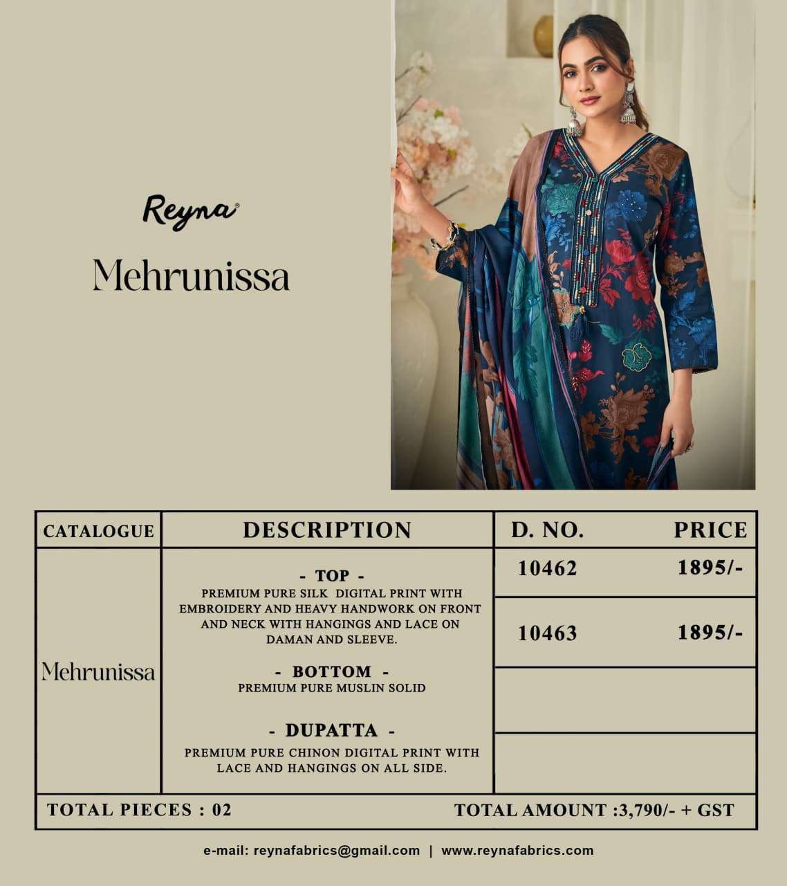 Buy Online MEHRUNISSA 1 by REYNA suit collection manufacturers surat 2 Pcs of Full Catalogue at Wholesale Price. Looking for MEHRUNISSA 1 by REYNA suit collection manufacturers surat Full Catalouge at Best Price? Buy Now MEHRUNISSA 1 by REYNA suit collection manufacturers surat at Wholesale Rate of Rs 3790 with Total 2 Pcs from authroized dealer and supplier of BRAND'S Brand. Cost of Each piece is just only Rs 1895 which is very low and affordable price to resale the product in your retail store ,This is Surat based Wholesale Supplier & Dealer of BRAND'S Brand. Click on Brand name to Know more about BRAND'S Brand's products.Call or Whatsapp on 9898838984 for booking or enquiry