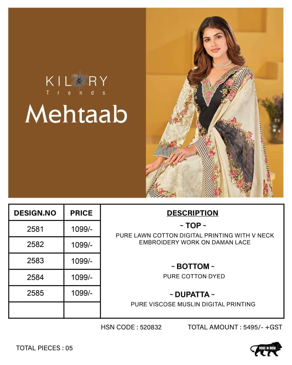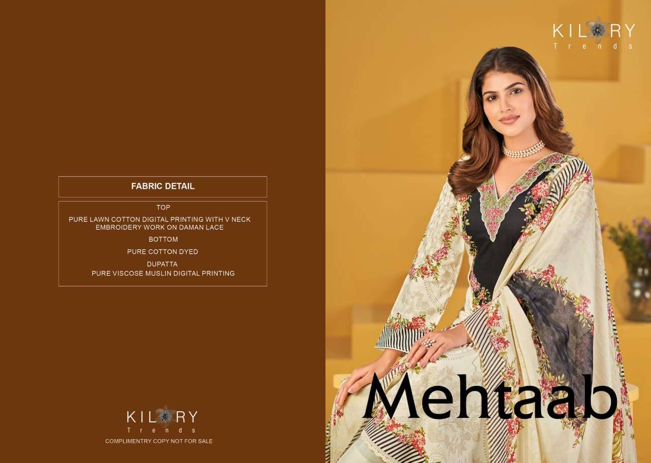 Buy Online MEHTAAB by KILORY TRENDS suit collection manufacturers surat 5 Pcs of Full Catalogue at Wholesale Price. Looking for MEHTAAB by KILORY TRENDS suit collection manufacturers surat Full Catalouge at Best Price? Buy Now MEHTAAB by KILORY TRENDS suit collection manufacturers surat at Wholesale Rate of Rs 5495 with Total 5 Pcs from authroized dealer and supplier of BRAND'S Brand. Cost of Each piece is just only Rs 1099 which is very low and affordable price to resale the product in your retail store ,This is Surat based Wholesale Supplier & Dealer of BRAND'S Brand. Click on Brand name to Know more about BRAND'S Brand's products.Call or Whatsapp on 9898838984 for booking or enquiry