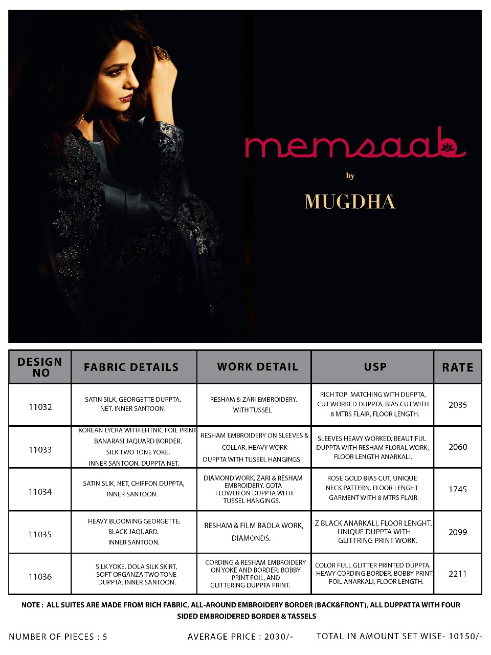 Buy Online Memsaab By Mugdha Series 11032 To 11036 Beautiful Designer Party Wear Suits Wholesale Supplier Gujarat 5 Pcs of Full Catalogue at Wholesale Price. Looking for Memsaab By Mugdha Series 11032 To 11036 Beautiful Designer Party Wear Suits Wholesale Supplier Gujarat Full Catalouge at Best Price? Buy Now Memsaab By Mugdha Series 11032 To 11036 Beautiful Designer Party Wear Suits Wholesale Supplier Gujarat at Wholesale Rate of Rs 10150 with Total 5 Pcs from authroized dealer and supplier of MUGDHA Brand. Cost of Each piece is just only Rs 2030 which is very low and affordable price to resale the product in your retail store ,This is Surat based Wholesale Supplier & Dealer of MUGDHA Brand. Click on Brand name to Know more about MUGDHA Brand's products.Call or Whatsapp on 9898838984 for booking or enquiry