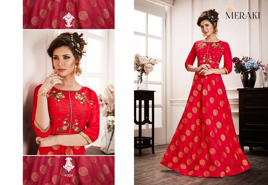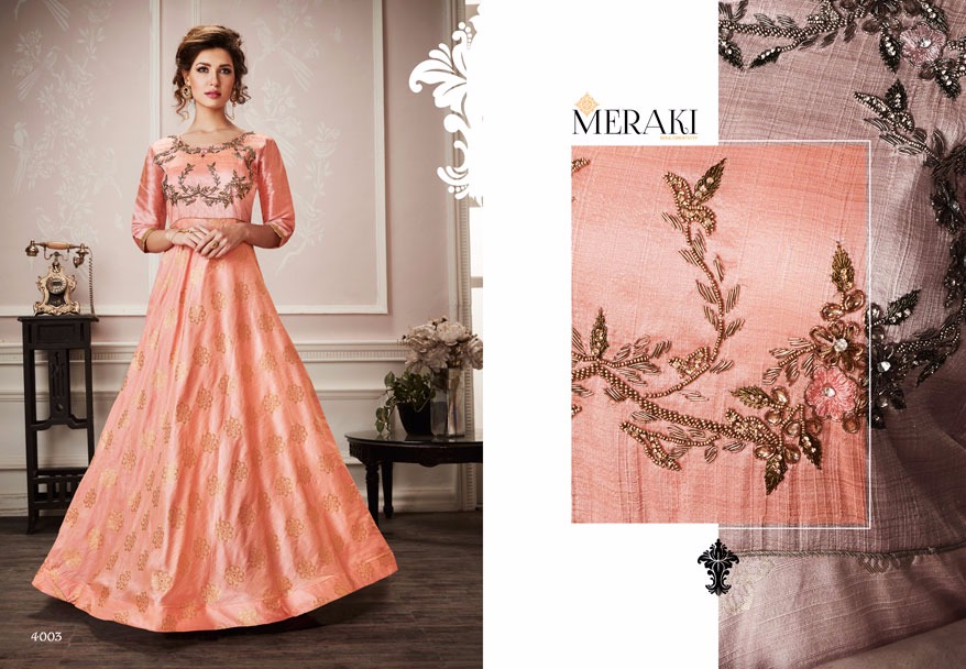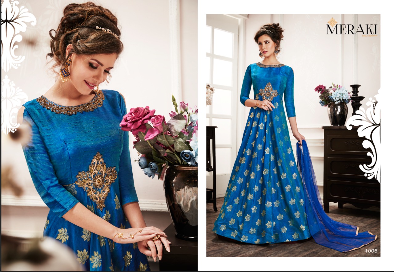 Buy Online Meraki Maher 4001 Series Designer Gown Suit Dealer Surat 6 Pcs of Full Catalogue at Wholesale Price. Looking for Meraki Maher 4001 Series Designer Gown Suit Dealer Surat Full Catalouge at Best Price? Buy Now Meraki Maher 4001 Series Designer Gown Suit Dealer Surat at Wholesale Rate of Rs 10770 with Total 6 Pcs from authroized dealer and supplier of MERAKI Brand. Cost of Each piece is just only Rs 1795 which is very low and affordable price to resale the product in your retail store ,This is Surat based Wholesale Supplier & Dealer of MERAKI Brand. Click on Brand name to Know more about MERAKI Brand's products.Call or Whatsapp on 9898838984 for booking or enquiry