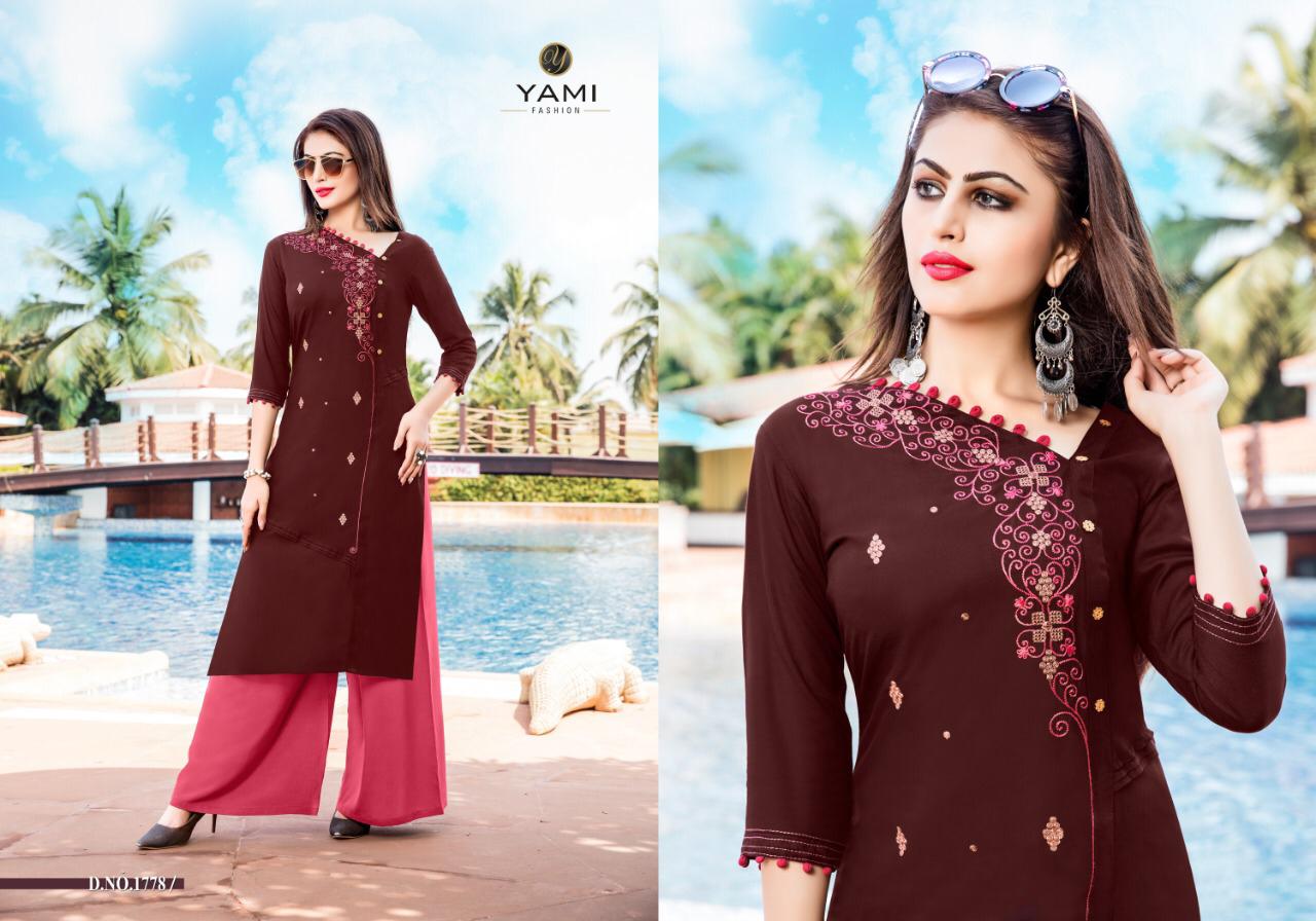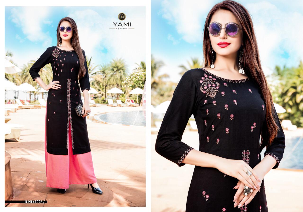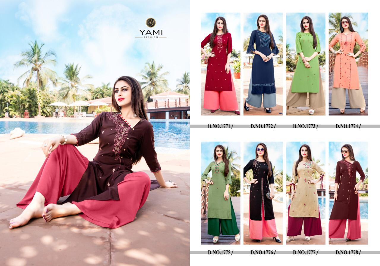 Buy Online Meraki Vol 2 By Yami Fashion Reyon Kurti Plazzo Set Wholesale Supplier And Dealer Surat 8 Pcs of Full Catalogue at Wholesale Price. Looking for Meraki Vol 2 By Yami Fashion Reyon Kurti Plazzo Set Wholesale Supplier And Dealer Surat Full Catalouge at Best Price? Buy Now Meraki Vol 2 By Yami Fashion Reyon Kurti Plazzo Set Wholesale Supplier And Dealer Surat at Wholesale Rate of Rs 6000 with Total 8 Pcs from authroized dealer and supplier of Brand. Cost of Each piece is just only Rs 750 which is very low and affordable price to resale the product in your retail store ,This is Surat based Wholesale Supplier & Dealer of Brand. Click on Brand name to Know more about Brand's products.Call or Whatsapp on 9898838984 for booking or enquiry