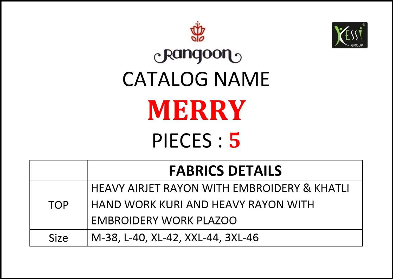 ? Rangoon (Kessi Fabrics Pvt. Ltd.) has launched Catalog name: *MERRY* ? Fabric Details ? ?Top:- HEAVY AIRJET RAYON WITH EMBROIDERY & KHATLI HANDWORK KURTI AND HEAVY RAYON WITH EMBROIDERY WORK PLAZOO ?Total Design:- 5 ?Size;- M, L, XL, XXL, 3XL Rate. 799/- Set to set. GST 5 Percent Extra ?Dispatching 5 to 6 days later ?Booking started from now... ?Order yours soon.... |