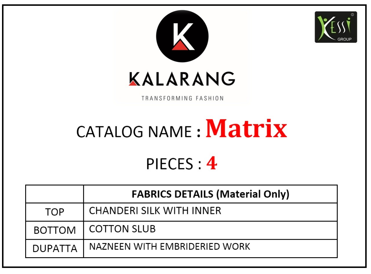 ? *Kalarang.* has launched _Catalog name_ : *Metrix* ? _Fabric Details_ ? ?Top :- Chanderi Silk with Inner ?Bottom:- Cotton Slub ?Dupatta:- Nazneen with Embroidery Work ?Total Design :- 4 ?Dispatching 5 to 6 days later ?Booking started from now... ?Order yours soon... Rate -675 per pcs . Set to set . GST 5 Percent Extra. |