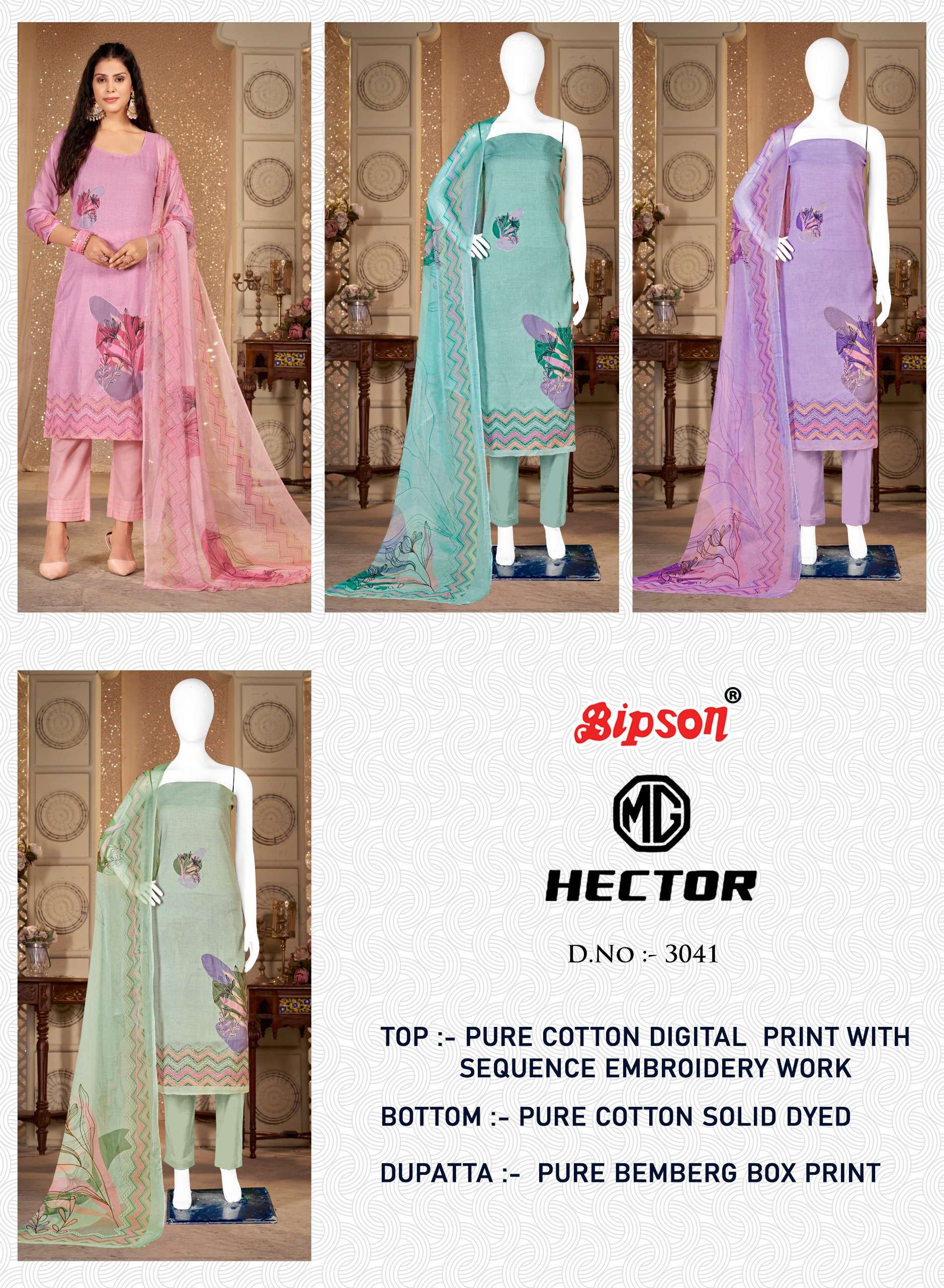 Buy Online MG HECTOR 3041 by BIPSON Pure Cotton Suit collection manufacturer surat 3 Pcs of Full Catalogue at Wholesale Price. Looking for MG HECTOR 3041 by BIPSON Pure Cotton Suit collection manufacturer surat Full Catalouge at Best Price? Buy Now MG HECTOR 3041 by BIPSON Pure Cotton Suit collection manufacturer surat at Wholesale Rate of Rs 2475 with Total 3 Pcs from authroized dealer and supplier of BRAND'S Brand. Cost of Each piece is just only Rs 825 which is very low and affordable price to resale the product in your retail store ,This is Surat based Wholesale Supplier & Dealer of BRAND'S Brand. Click on Brand name to Know more about BRAND'S Brand's products.Call or Whatsapp on 9898838984 for booking or enquiry