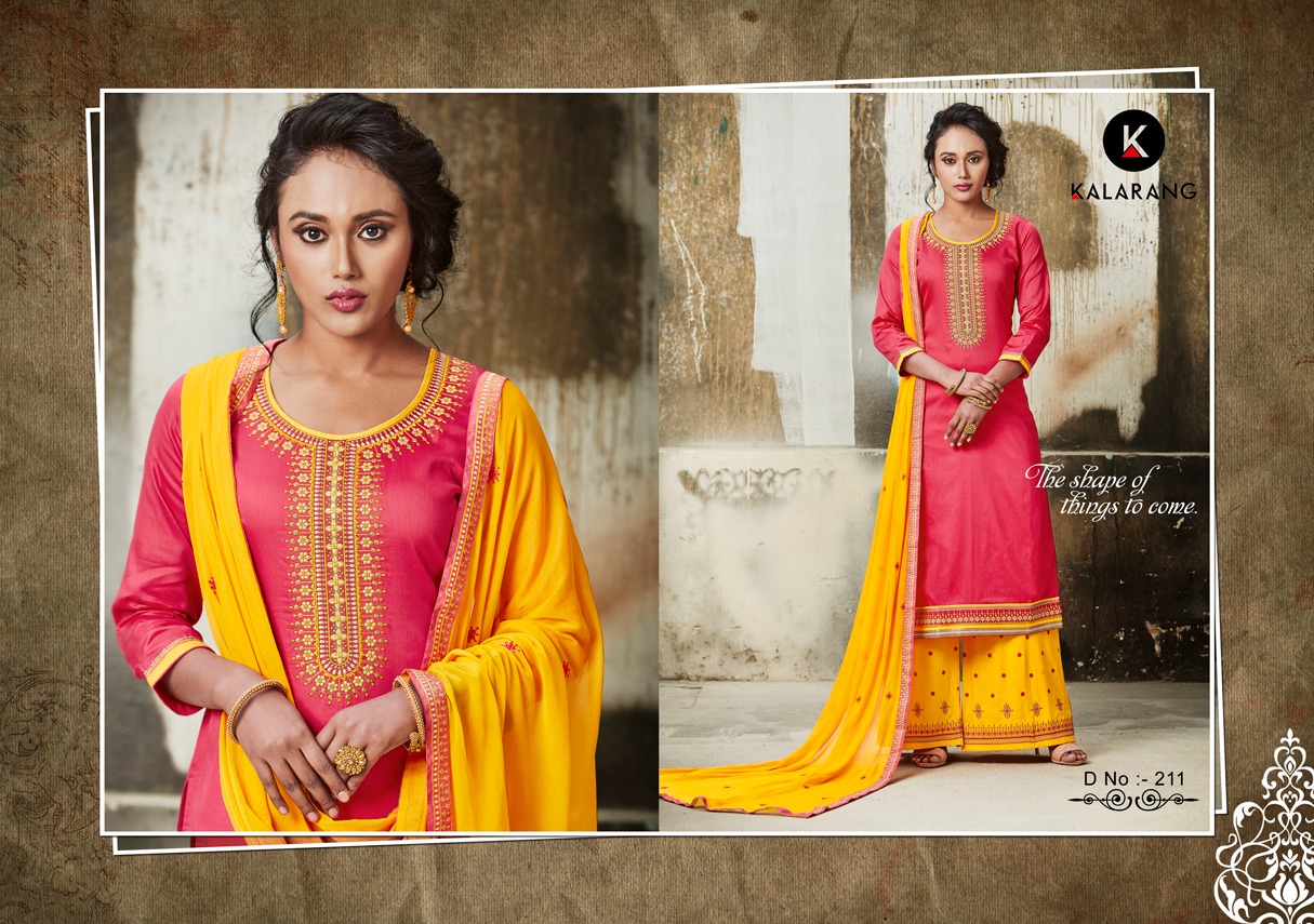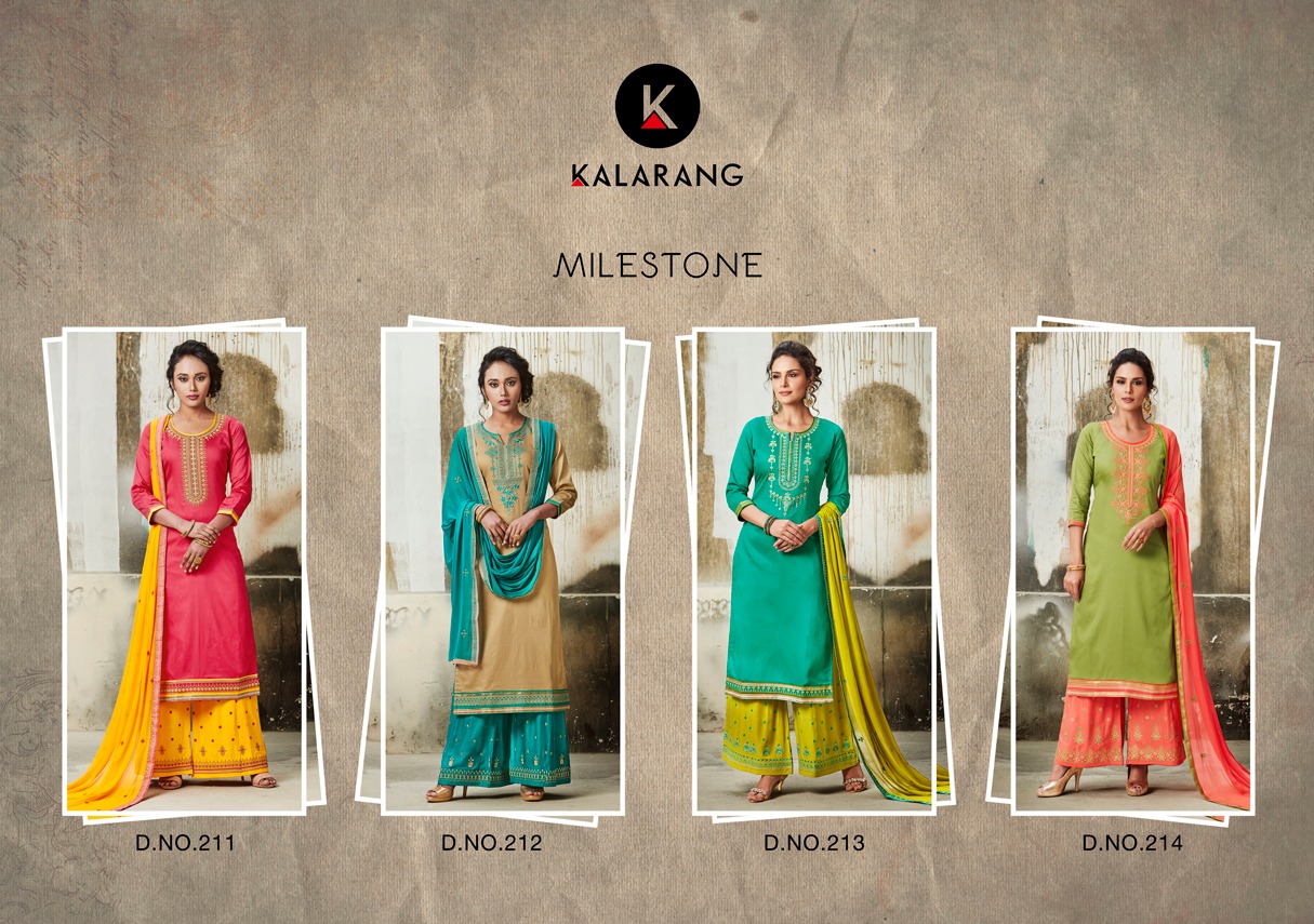 ? *Kalarang.* has launched _Catalog name_ : *Milestone* ? _Fabric Details_ ? ?Top :- JAM SILK COTTON WITH WORK ?Bottom:- COTTON SLUB WITH WORK ?Dupatta:- Nazneen with Work ?Total Design :- 4 ?Dispatching 5 to 6 days later ?Booking started from now... ?Order yours soon.... Rate -799 per pcs . Set to set . GST 5 Percent Extra. |