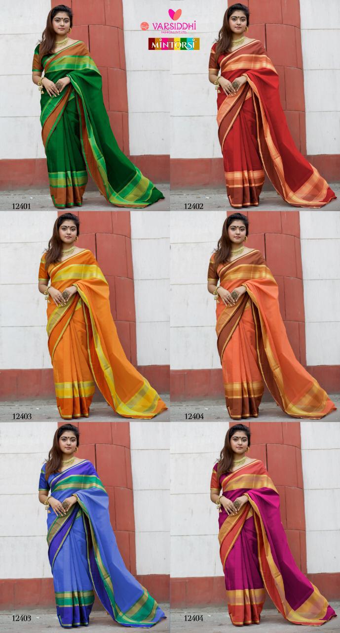 Buy Online Mintorsi Series 12401 To 12406 Cotton Silk Sarees Set And Single Wholesale Supplier Gujarat 6 Pcs of Full Catalogue at Wholesale Price. Looking for Mintorsi Series 12401 To 12406 Cotton Silk Sarees Set And Single Wholesale Supplier Gujarat Full Catalouge at Best Price? Buy Now Mintorsi Series 12401 To 12406 Cotton Silk Sarees Set And Single Wholesale Supplier Gujarat at Wholesale Rate of Rs 3000 with Total 6 Pcs from authroized dealer and supplier of Brand. Cost of Each piece is just only Rs 500 which is very low and affordable price to resale the product in your retail store ,This is Surat based Wholesale Supplier & Dealer of Brand. Click on Brand name to Know more about Brand's products.Call or Whatsapp on 9898838984 for booking or enquiry