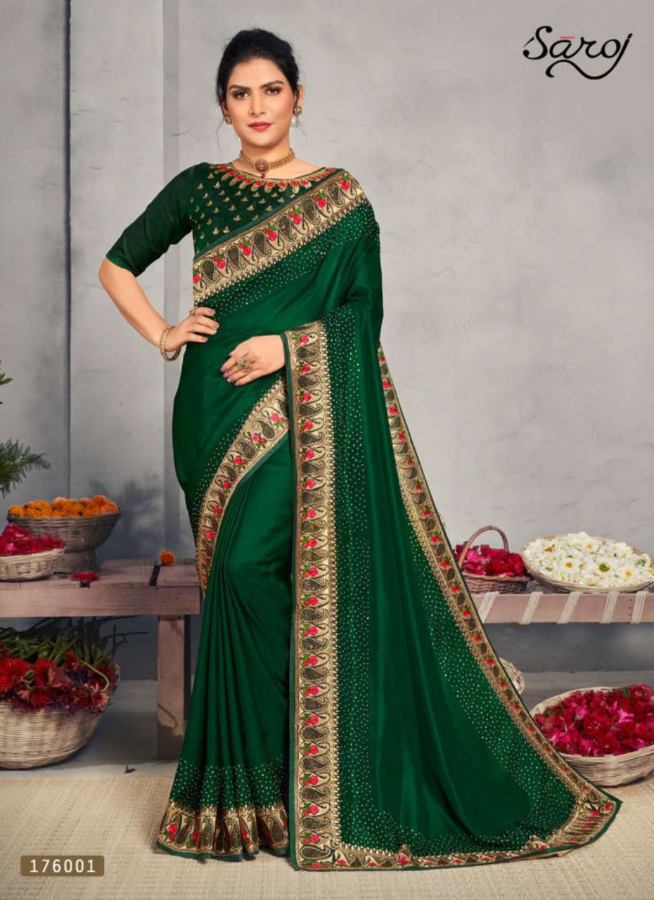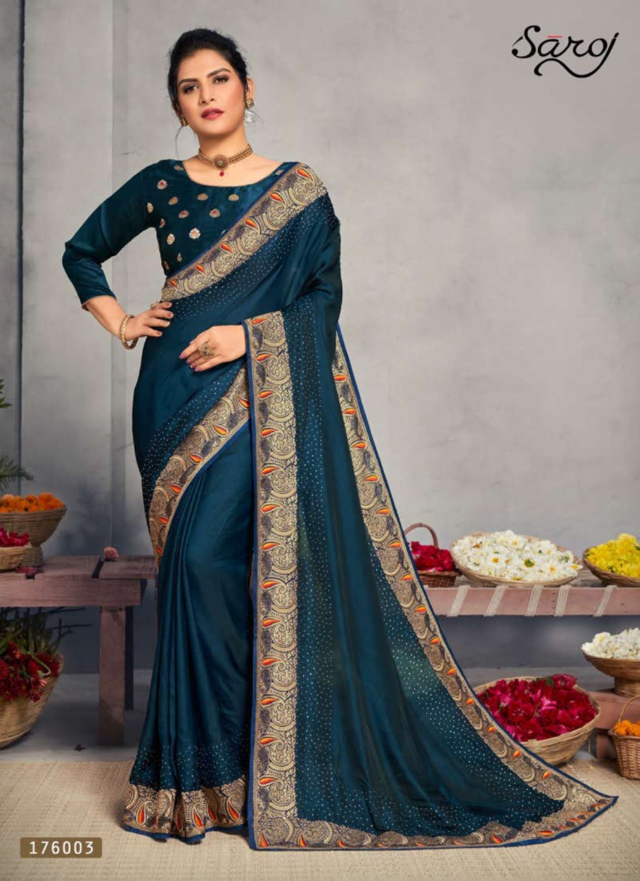 Brand - Saroj . *Miracle * Rate- 1470 per pcs. Set to set GST 5 Percent Extra Fabric: Heavy Satin Rangoli Silk with full Swaroski and Work on Border. Blouse: Silk. 6 Design in set . Delivery 2 days |