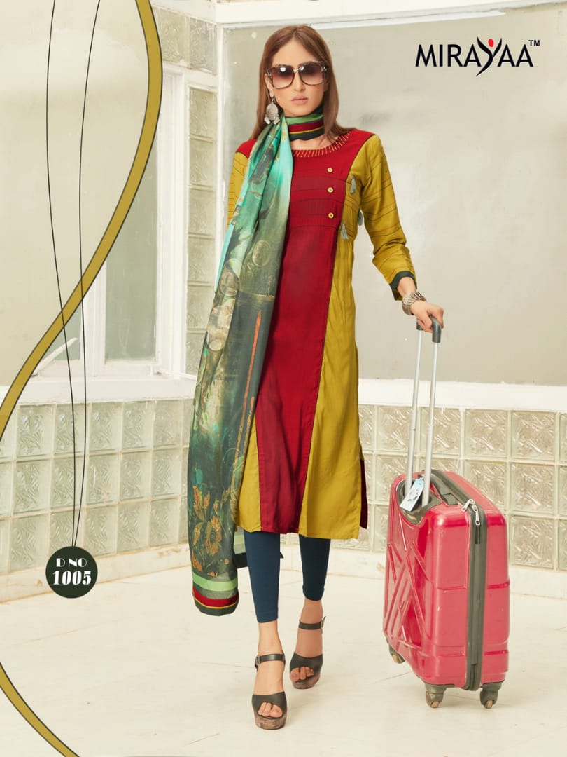 Buy Online Mirayaa Banno Rani 1001 Series Reyon Kurti Wholesaler Surat 6 Pcs of Full Catalogue at Wholesale Price. Looking for Mirayaa Banno Rani 1001 Series Reyon Kurti Wholesaler Surat Full Catalouge at Best Price? Buy Now Mirayaa Banno Rani 1001 Series Reyon Kurti Wholesaler Surat at Wholesale Rate of Rs 4710 with Total 6 Pcs from authroized dealer and supplier of Mirayaa Brand. Cost of Each piece is just only Rs 785 which is very low and affordable price to resale the product in your retail store ,This is Surat based Wholesale Supplier & Dealer of Mirayaa Brand. Click on Brand name to Know more about Mirayaa Brand's products.Call or Whatsapp on 9898838984 for booking or enquiry