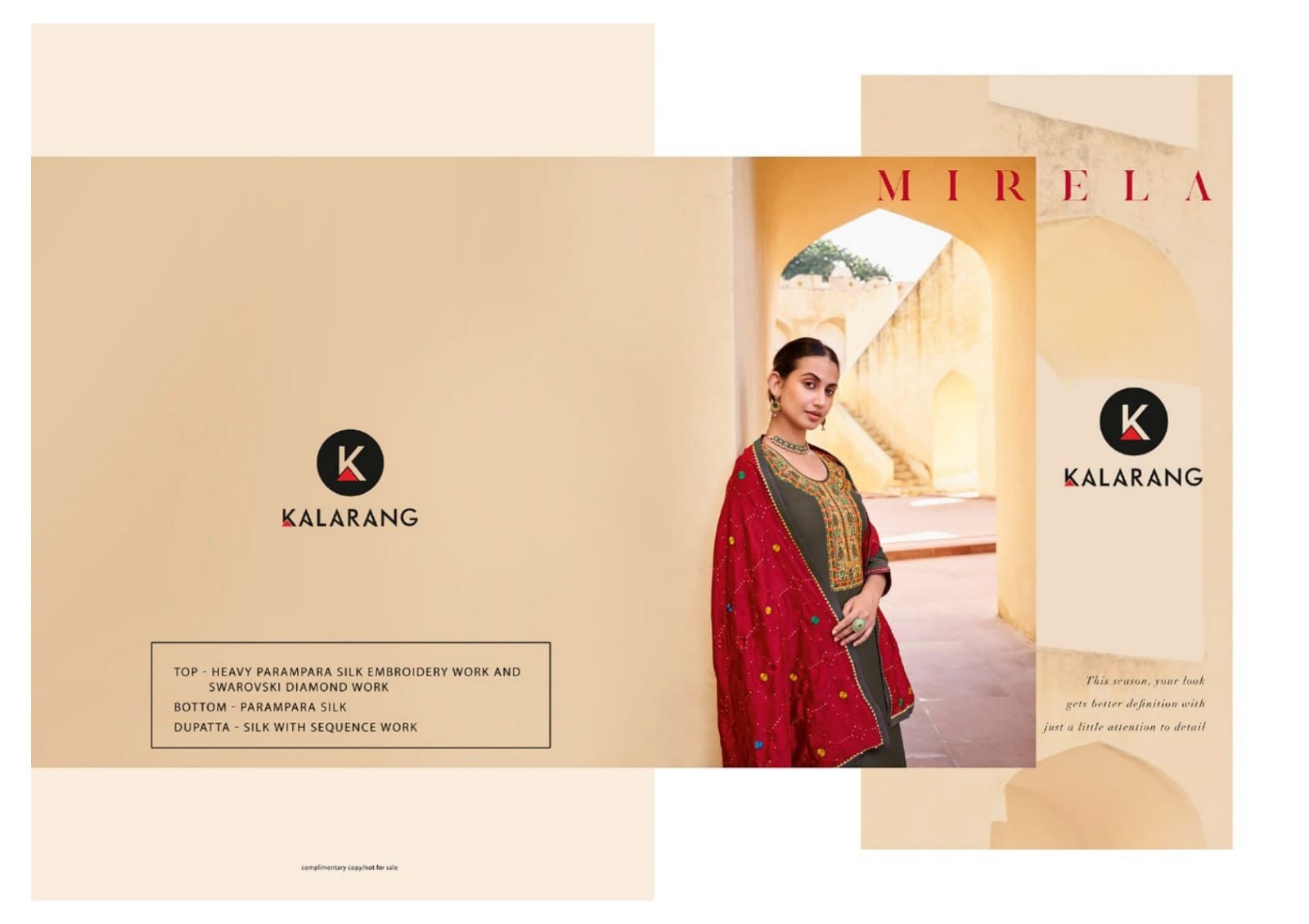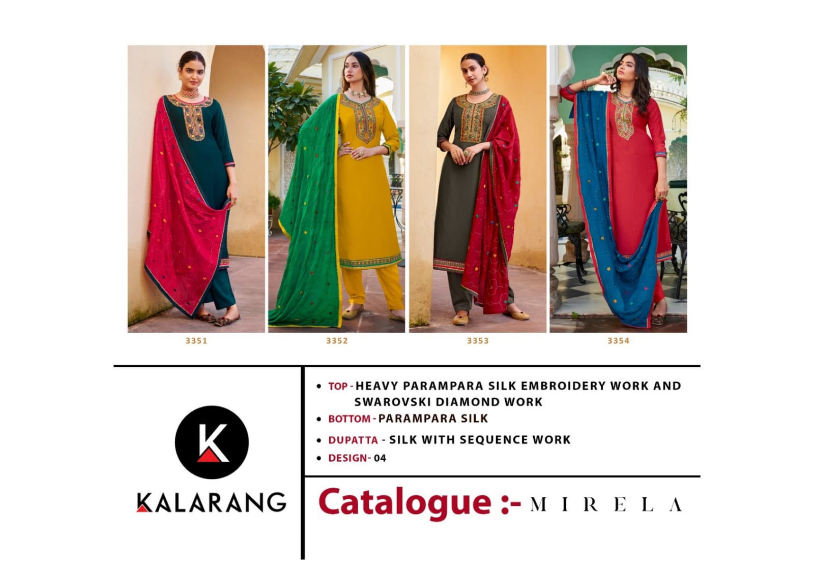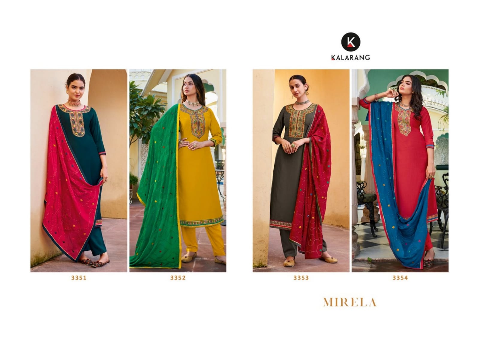 Buy Online Mirela By Kalarang Dealer From India 4 Pcs of Full Catalogue at Wholesale Price. Looking for Mirela By Kalarang Dealer From India Full Catalouge at Best Price? Buy Now Mirela By Kalarang Dealer From India at Wholesale Rate of Rs 3300 with Total 4 Pcs from authroized dealer and supplier of KALARANG Brand. Cost of Each piece is just only Rs 825 which is very low and affordable price to resale the product in your retail store ,This is Surat based Wholesale Supplier & Dealer of KALARANG Brand. Click on Brand name to Know more about KALARANG Brand's products.Call or Whatsapp on 9898838984 for booking or enquiry