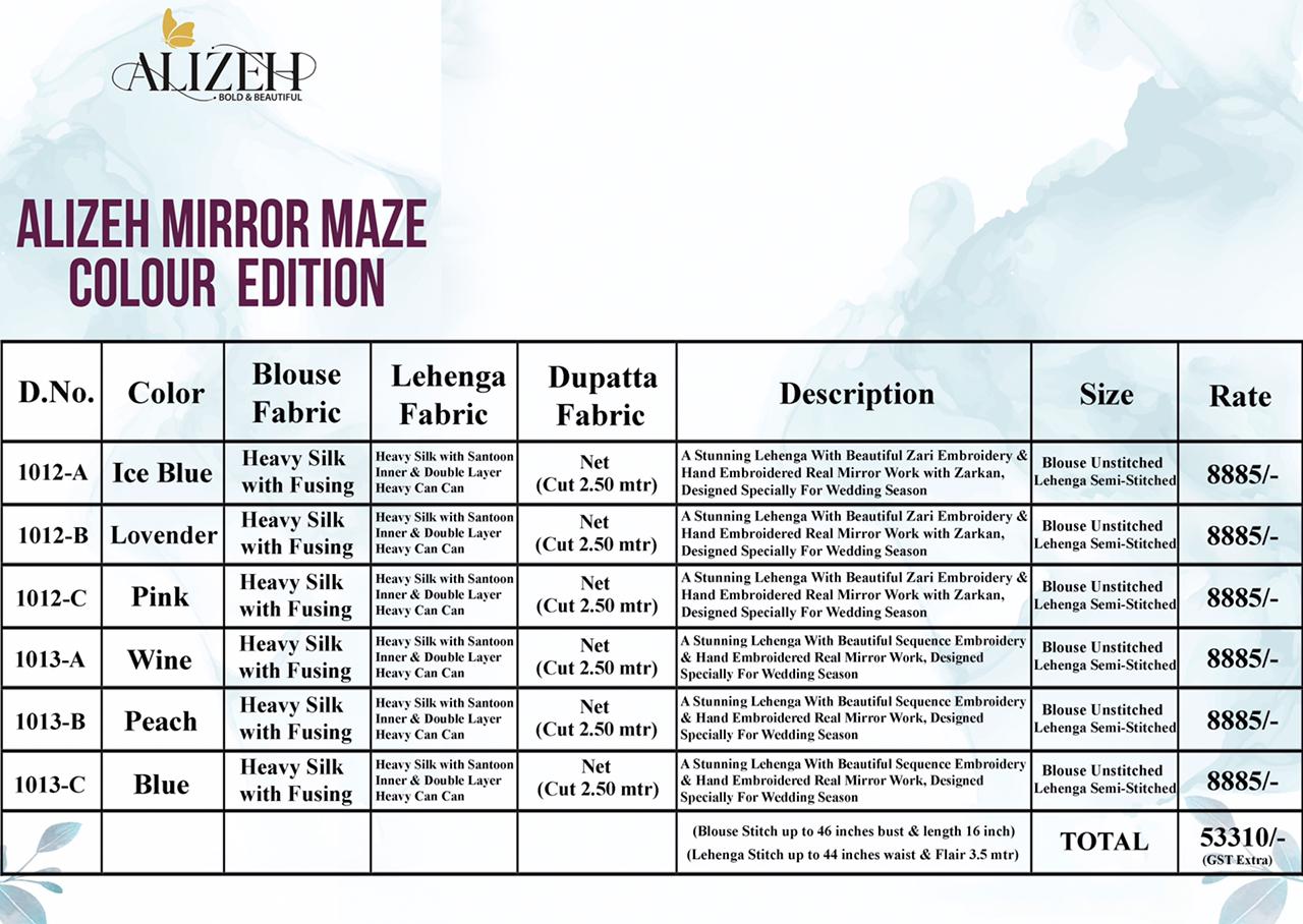 Buy Online Mirror Maze Colour Edition By Alizeh Single And Set Stockiest And Supplier From Surat 6 Pcs of Full Catalogue at Wholesale Price. Looking for Mirror Maze Colour Edition By Alizeh Single And Set Stockiest And Supplier From Surat Full Catalouge at Best Price? Buy Now Mirror Maze Colour Edition By Alizeh Single And Set Stockiest And Supplier From Surat at Wholesale Rate of Rs 53310 with Total 6 Pcs from authroized dealer and supplier of Brand. Cost of Each piece is just only Rs 8885 which is very low and affordable price to resale the product in your retail store ,This is Surat based Wholesale Supplier & Dealer of Brand. Click on Brand name to Know more about Brand's products.Call or Whatsapp on 9898838984 for booking or enquiry