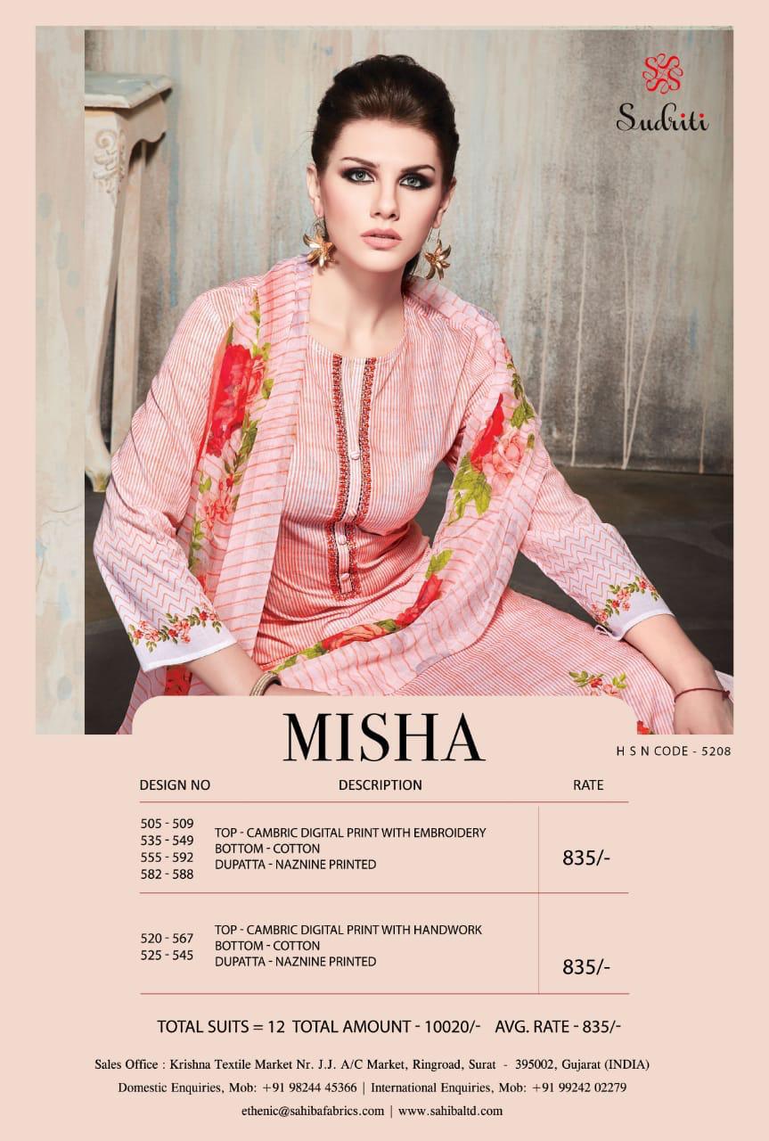 Buy Online Misha By Sahiba Sudriti Cambric Digital Printed Suits Wholesale Supplier Gujarat 12 Pcs of Full Catalogue at Wholesale Price. Looking for Misha By Sahiba Sudriti Cambric Digital Printed Suits Wholesale Supplier Gujarat Full Catalouge at Best Price? Buy Now Misha By Sahiba Sudriti Cambric Digital Printed Suits Wholesale Supplier Gujarat at Wholesale Rate of Rs 10020 with Total 12 Pcs from authroized dealer and supplier of SUDRITI Brand. Cost of Each piece is just only Rs 835 which is very low and affordable price to resale the product in your retail store ,This is Surat based Wholesale Supplier & Dealer of SUDRITI Brand. Click on Brand name to Know more about SUDRITI Brand's products.Call or Whatsapp on 9898838984 for booking or enquiry