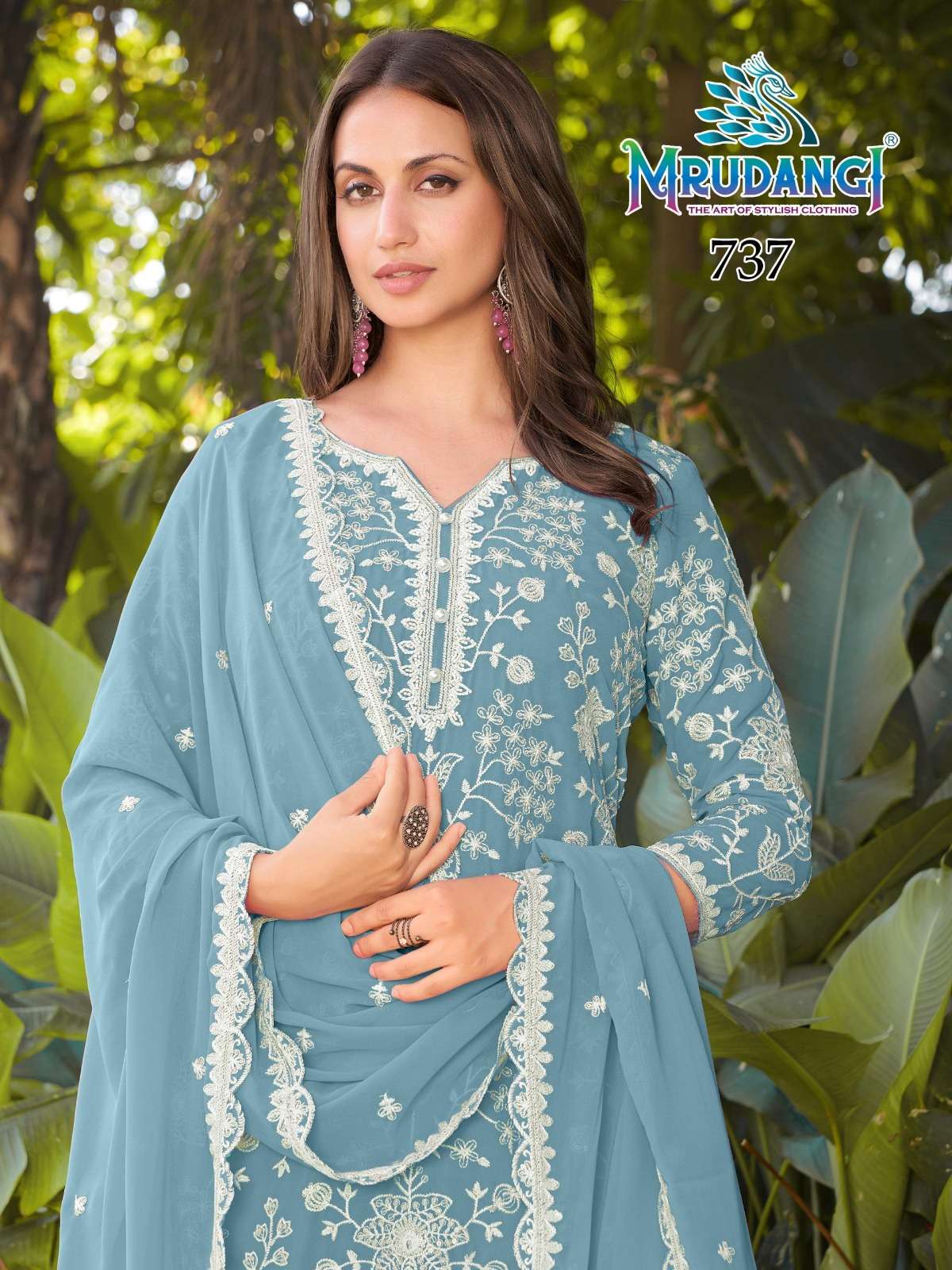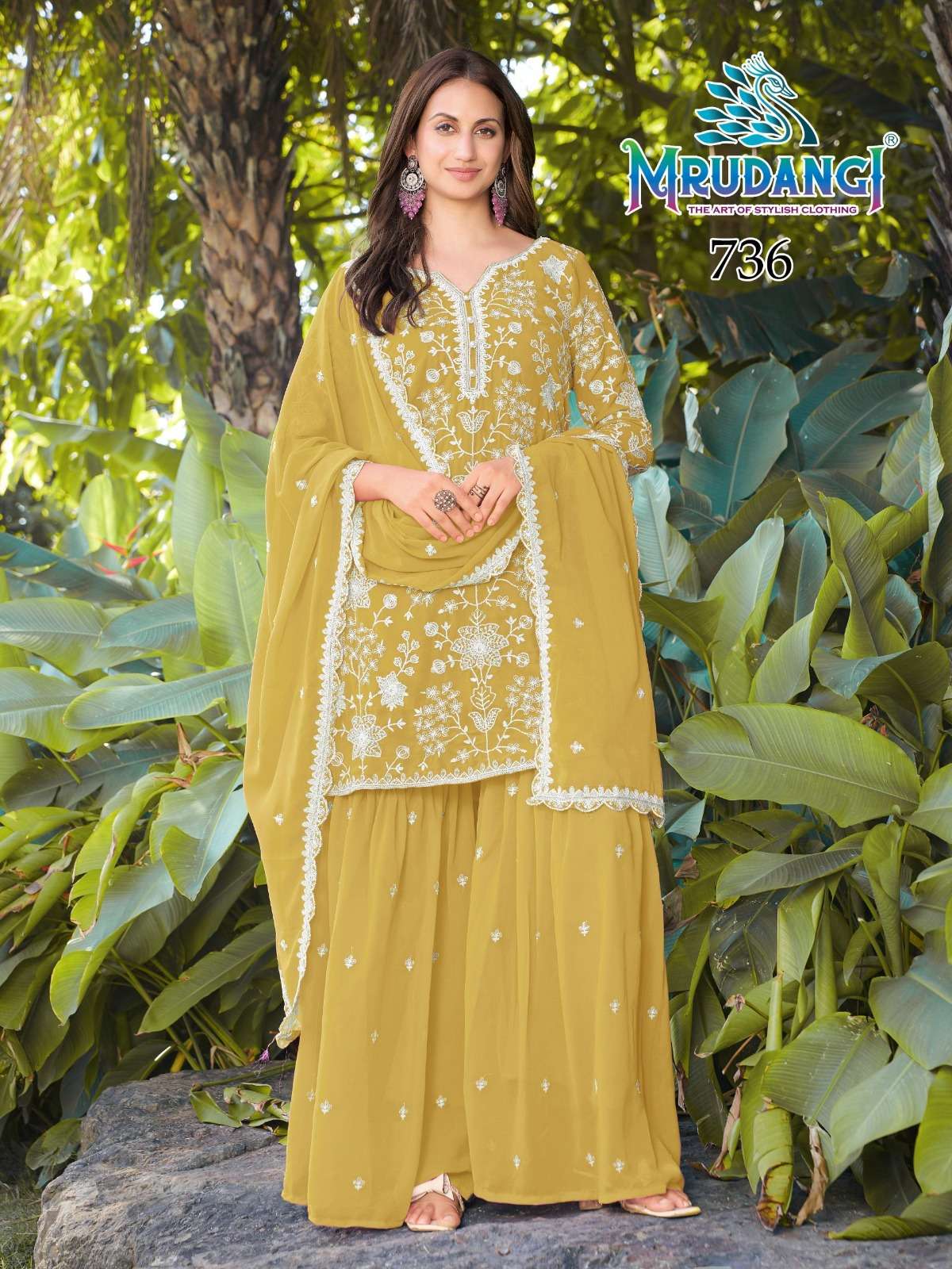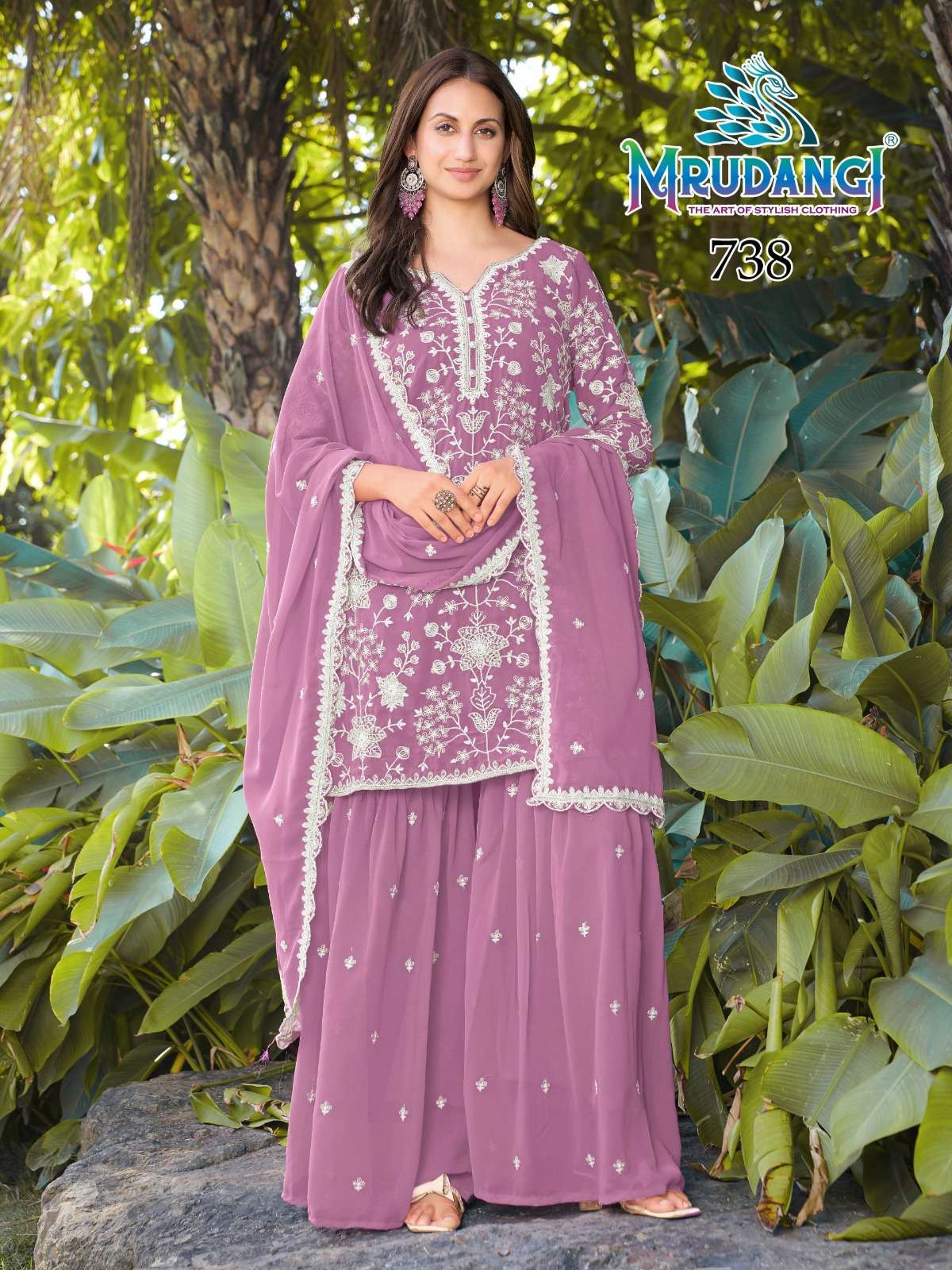 PRESENT NEW CATLOG BRAND - MRUDANGI©️ CATALOG - MISHA (3 PCS) SERIES – 736 TO 738 FABRIC - REAL PREMIUM GEORGETTE ( HEAVY EMBROIDERED BEADS & SEQUENCE WORK TOP WITH SHARARA PANT AND DUPATTA ) SIZE:-S,M,L,XL,XXL PRICE - 2299/- per pcs GST 5% EXTRA |