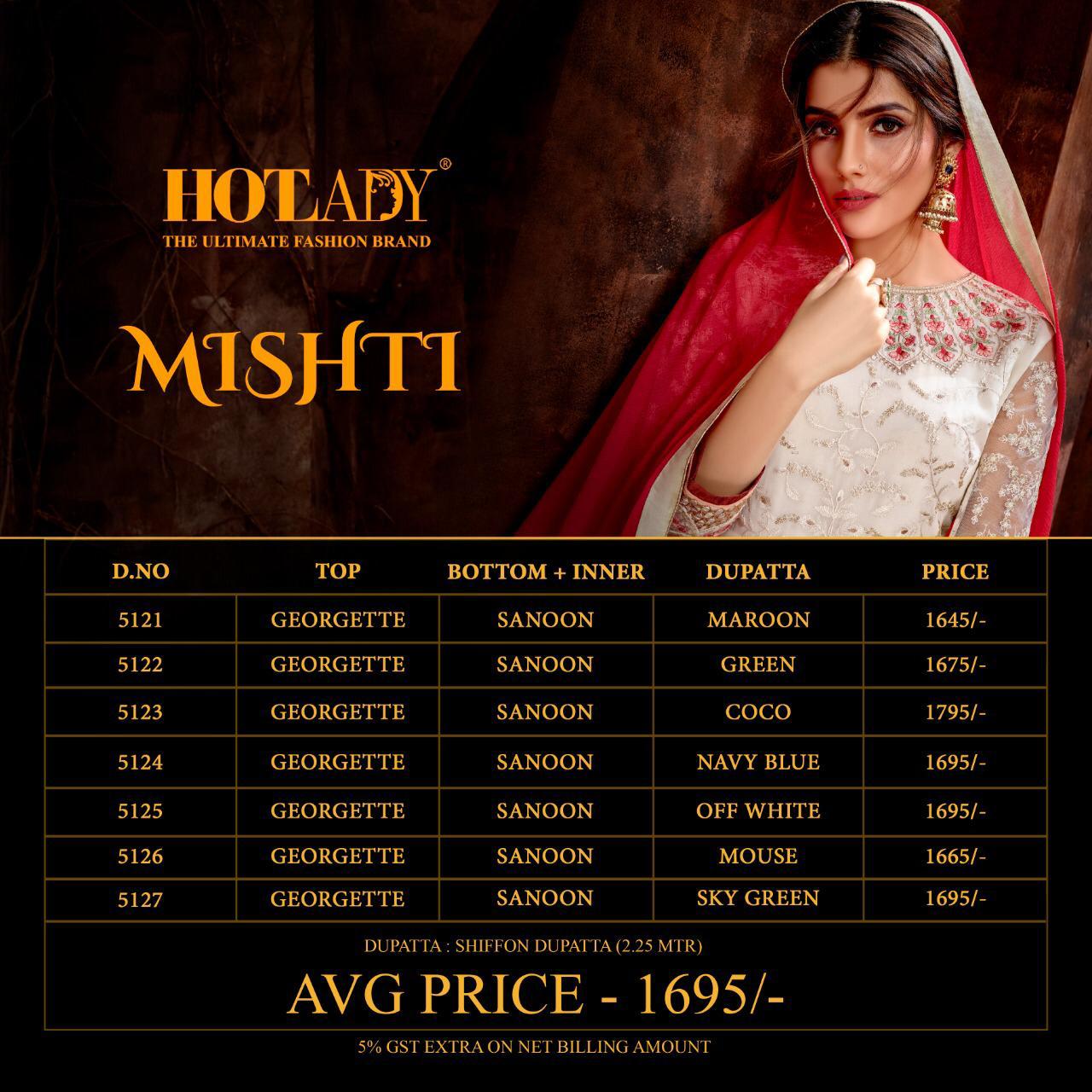 Buy Online Mishti By Hotlady Series 5121 To 5127 Designer Party Wear Suits Wholesale Supplier India 7 Pcs of Full Catalogue at Wholesale Price. Looking for Mishti By Hotlady Series 5121 To 5127 Designer Party Wear Suits Wholesale Supplier India Full Catalouge at Best Price? Buy Now Mishti By Hotlady Series 5121 To 5127 Designer Party Wear Suits Wholesale Supplier India at Wholesale Rate of Rs 11865 with Total 7 Pcs from authroized dealer and supplier of HOTLADY Brand. Cost of Each piece is just only Rs 1695 which is very low and affordable price to resale the product in your retail store ,This is Surat based Wholesale Supplier & Dealer of HOTLADY Brand. Click on Brand name to Know more about HOTLADY Brand's products.Call or Whatsapp on 9898838984 for booking or enquiry
