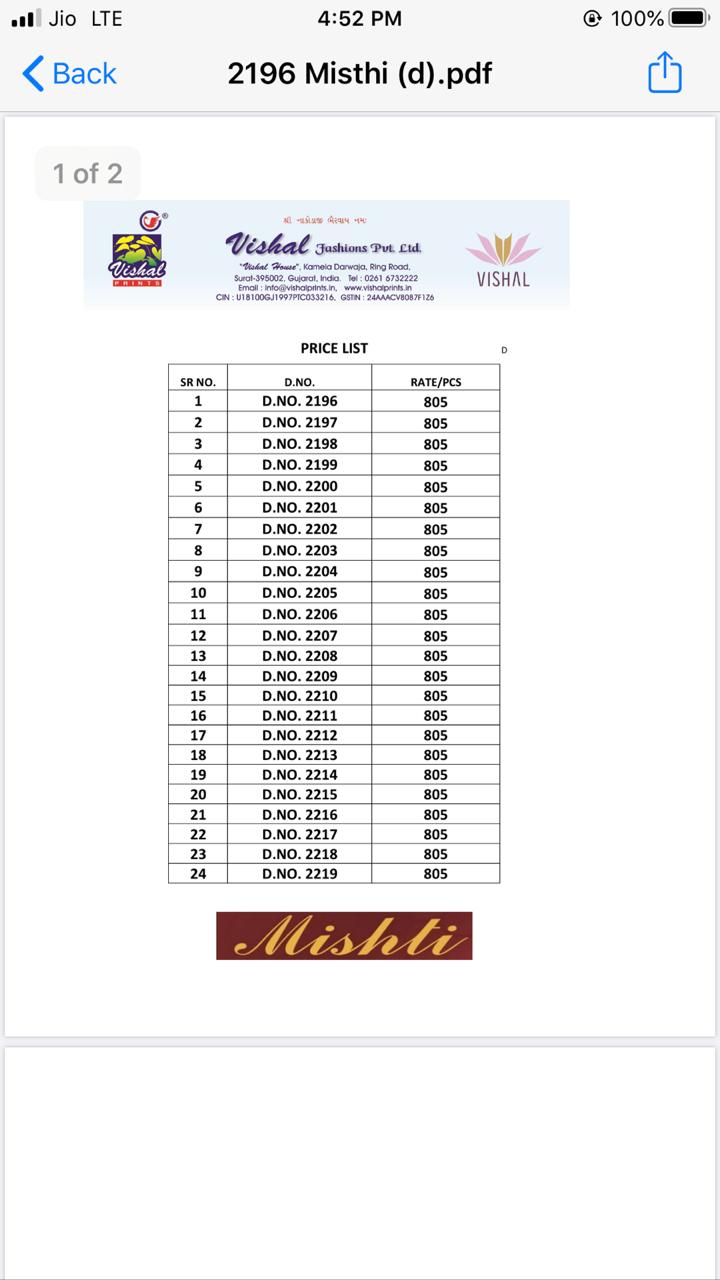 Buy Online Mishti By Vishal Fashion Manufacturer Traders Surat Gujrat 24 Pcs of Full Catalogue at Wholesale Price. Looking for Mishti By Vishal Fashion Manufacturer Traders Surat Gujrat Full Catalouge at Best Price? Buy Now Mishti By Vishal Fashion Manufacturer Traders Surat Gujrat at Wholesale Rate of Rs 19320 with Total 24 Pcs from authroized dealer and supplier of VISHAL Brand. Cost of Each piece is just only Rs 805 which is very low and affordable price to resale the product in your retail store ,This is Surat based Wholesale Supplier & Dealer of VISHAL Brand. Click on Brand name to Know more about VISHAL Brand's products.Call or Whatsapp on 9898838984 for booking or enquiry