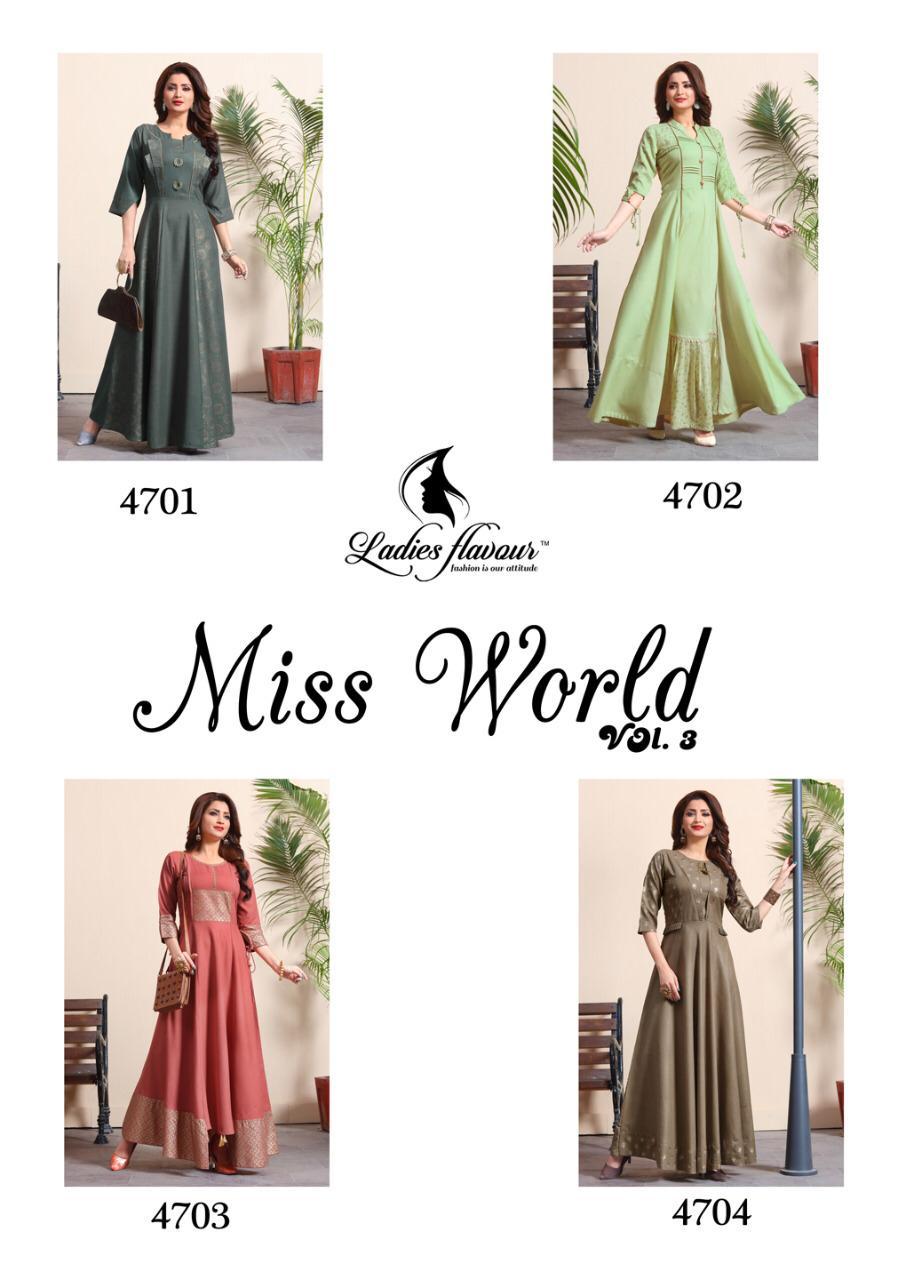 Buy Online Miss World Vol 3 By Ladies Flavour Designer Party Wear Kurtis Wholesale Supplier Surat 4 Pcs of Full Catalogue at Wholesale Price. Looking for Miss World Vol 3 By Ladies Flavour Designer Party Wear Kurtis Wholesale Supplier Surat Full Catalouge at Best Price? Buy Now Miss World Vol 3 By Ladies Flavour Designer Party Wear Kurtis Wholesale Supplier Surat at Wholesale Rate of Rs 2700 with Total 4 Pcs from authroized dealer and supplier of Ladies Flavour Brand. Cost of Each piece is just only Rs 675 which is very low and affordable price to resale the product in your retail store ,This is Surat based Wholesale Supplier & Dealer of Ladies Flavour Brand. Click on Brand name to Know more about Ladies Flavour Brand's products.Call or Whatsapp on 9898838984 for booking or enquiry