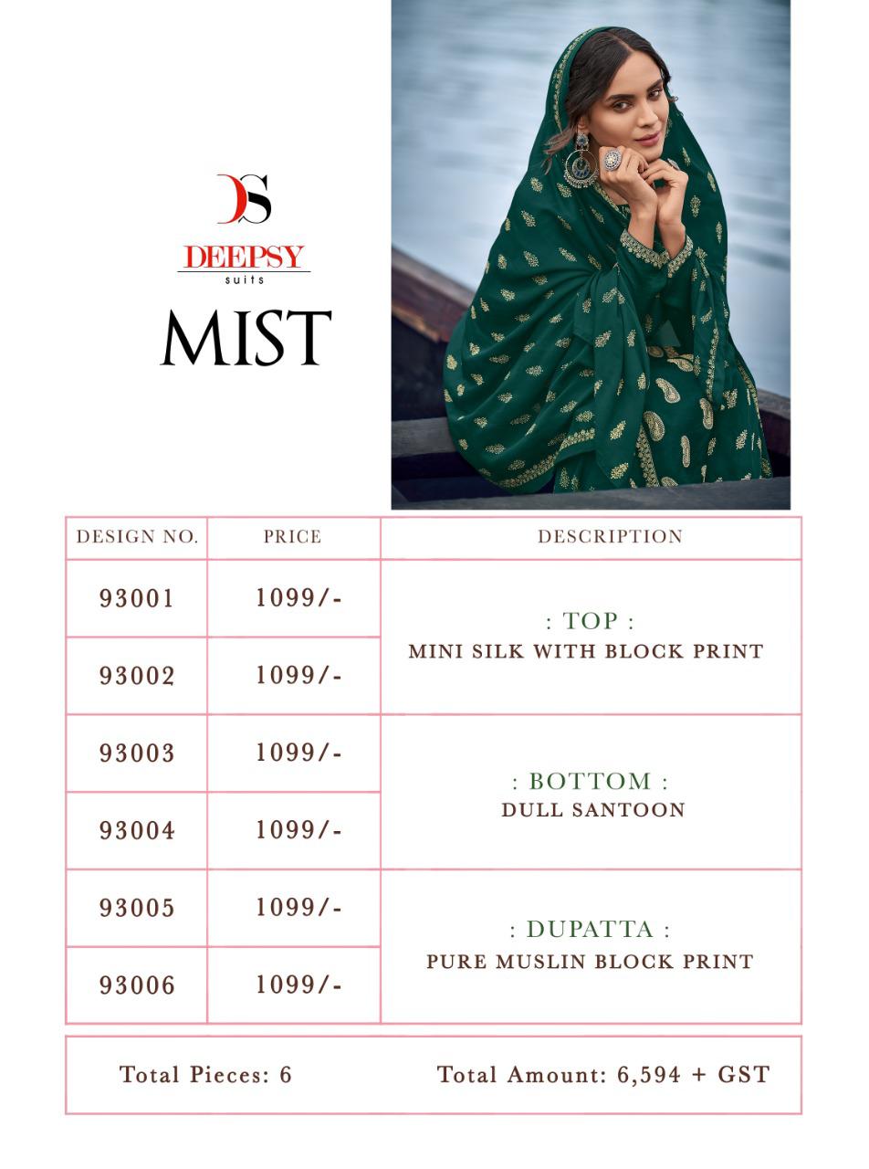 Buy Online Mist By Deepsy Suits Manufacturer Traders Surat 6 Pcs of Full Catalogue at Wholesale Price. Looking for Mist By Deepsy Suits Manufacturer Traders Surat Full Catalouge at Best Price? Buy Now Mist By Deepsy Suits Manufacturer Traders Surat at Wholesale Rate of Rs 6594 with Total 6 Pcs from authroized dealer and supplier of DEEPSY Brand. Cost of Each piece is just only Rs 1099 which is very low and affordable price to resale the product in your retail store ,This is Surat based Wholesale Supplier & Dealer of DEEPSY Brand. Click on Brand name to Know more about DEEPSY Brand's products.Call or Whatsapp on 9898838984 for booking or enquiry