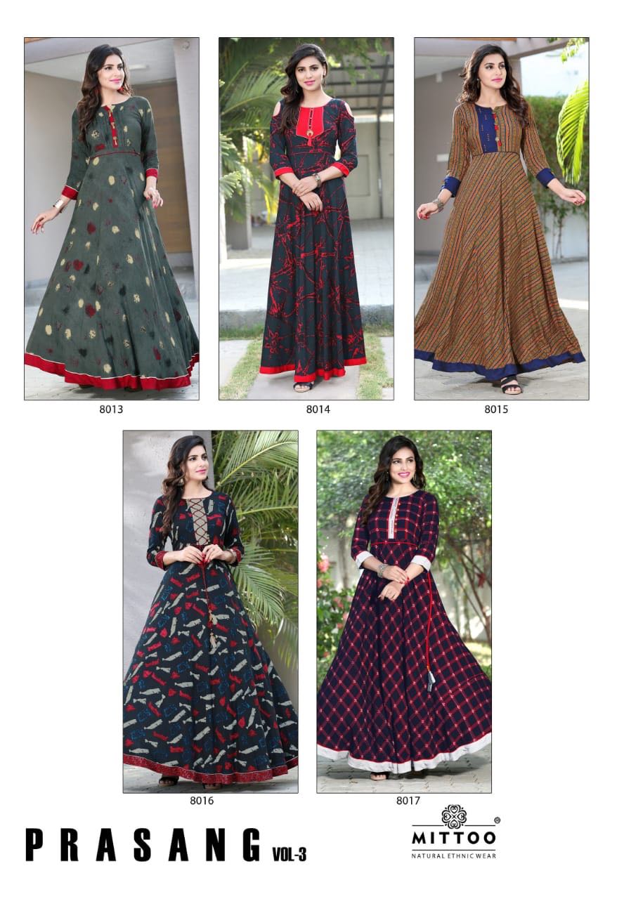 Buy Online Mittoo Prasang Vol 3 8013 Series Fancy Reyon Kurti Catlog Wholesale Dealer And Supplier Surat 5 Pcs of Full Catalogue at Wholesale Price. Looking for Mittoo Prasang Vol 3 8013 Series Fancy Reyon Kurti Catlog Wholesale Dealer And Supplier Surat Full Catalouge at Best Price? Buy Now Mittoo Prasang Vol 3 8013 Series Fancy Reyon Kurti Catlog Wholesale Dealer And Supplier Surat at Wholesale Rate of Rs 4225 with Total 5 Pcs from authroized dealer and supplier of MITTOO Brand. Cost of Each piece is just only Rs 845 which is very low and affordable price to resale the product in your retail store ,This is Surat based Wholesale Supplier & Dealer of MITTOO Brand. Click on Brand name to Know more about MITTOO Brand's products.Call or Whatsapp on 9898838984 for booking or enquiry