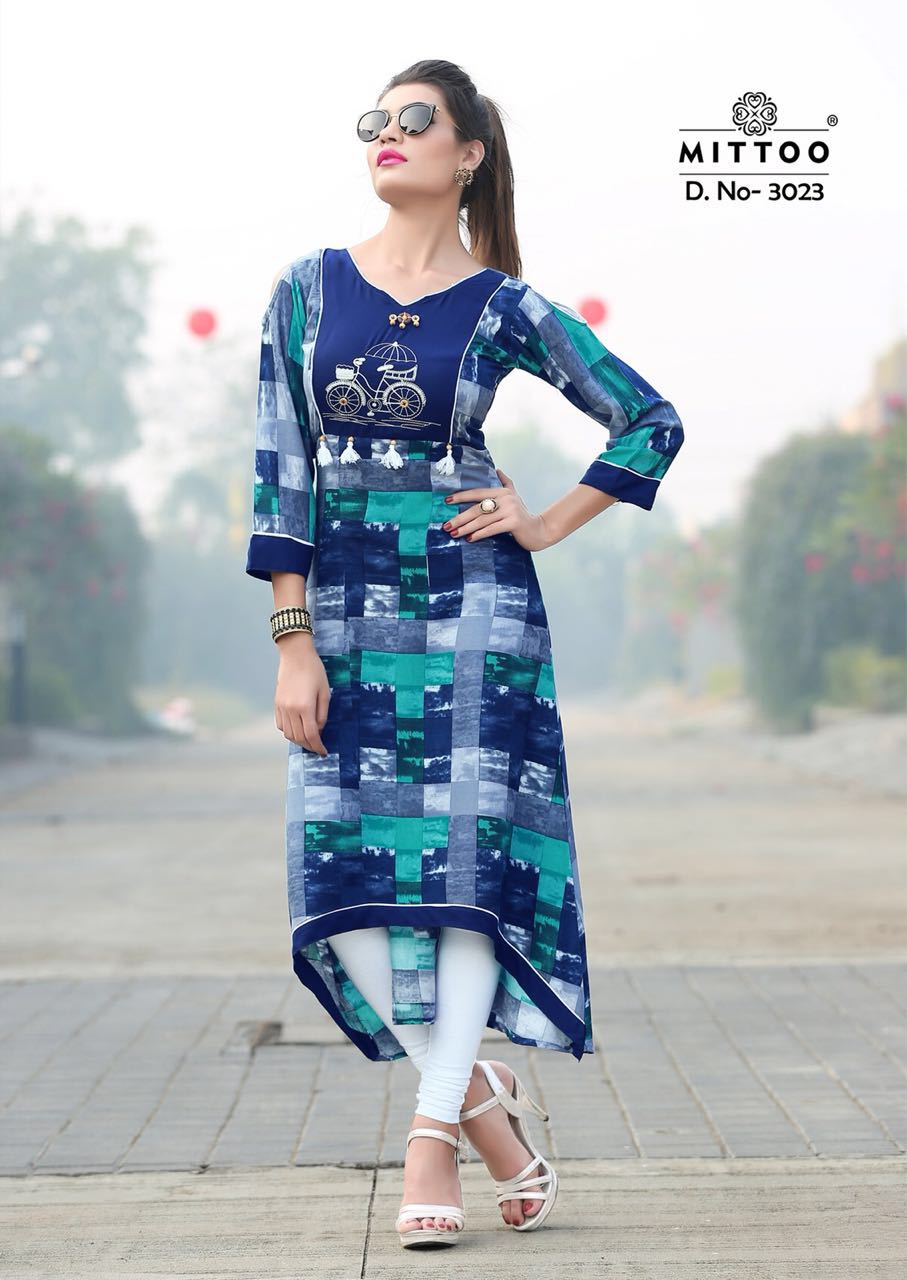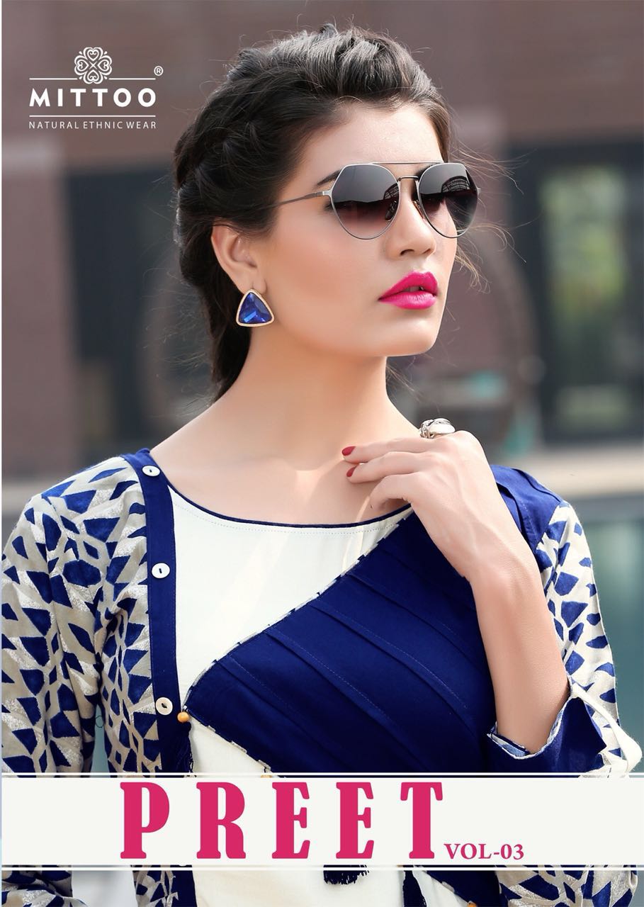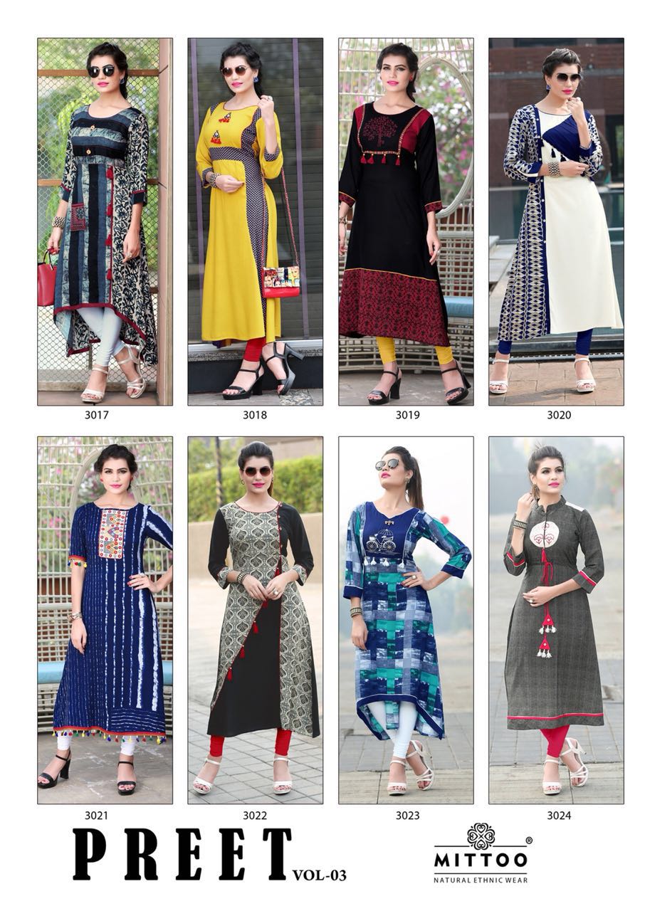 Buy Online Mittoo Preet Vol 3 3017 To 3024 Series Reyon Printed Kurties 8 Pcs of Full Catalogue at Wholesale Price. Looking for Mittoo Preet Vol 3 3017 To 3024 Series Reyon Printed Kurties Full Catalouge at Best Price? Buy Now Mittoo Preet Vol 3 3017 To 3024 Series Reyon Printed Kurties at Wholesale Rate of Rs 4400 with Total 8 Pcs from authroized dealer and supplier of MITTOO Brand. Cost of Each piece is just only Rs 550 which is very low and affordable price to resale the product in your retail store ,This is Surat based Wholesale Supplier & Dealer of MITTOO Brand. Click on Brand name to Know more about MITTOO Brand's products.Call or Whatsapp on 9898838984 for booking or enquiry