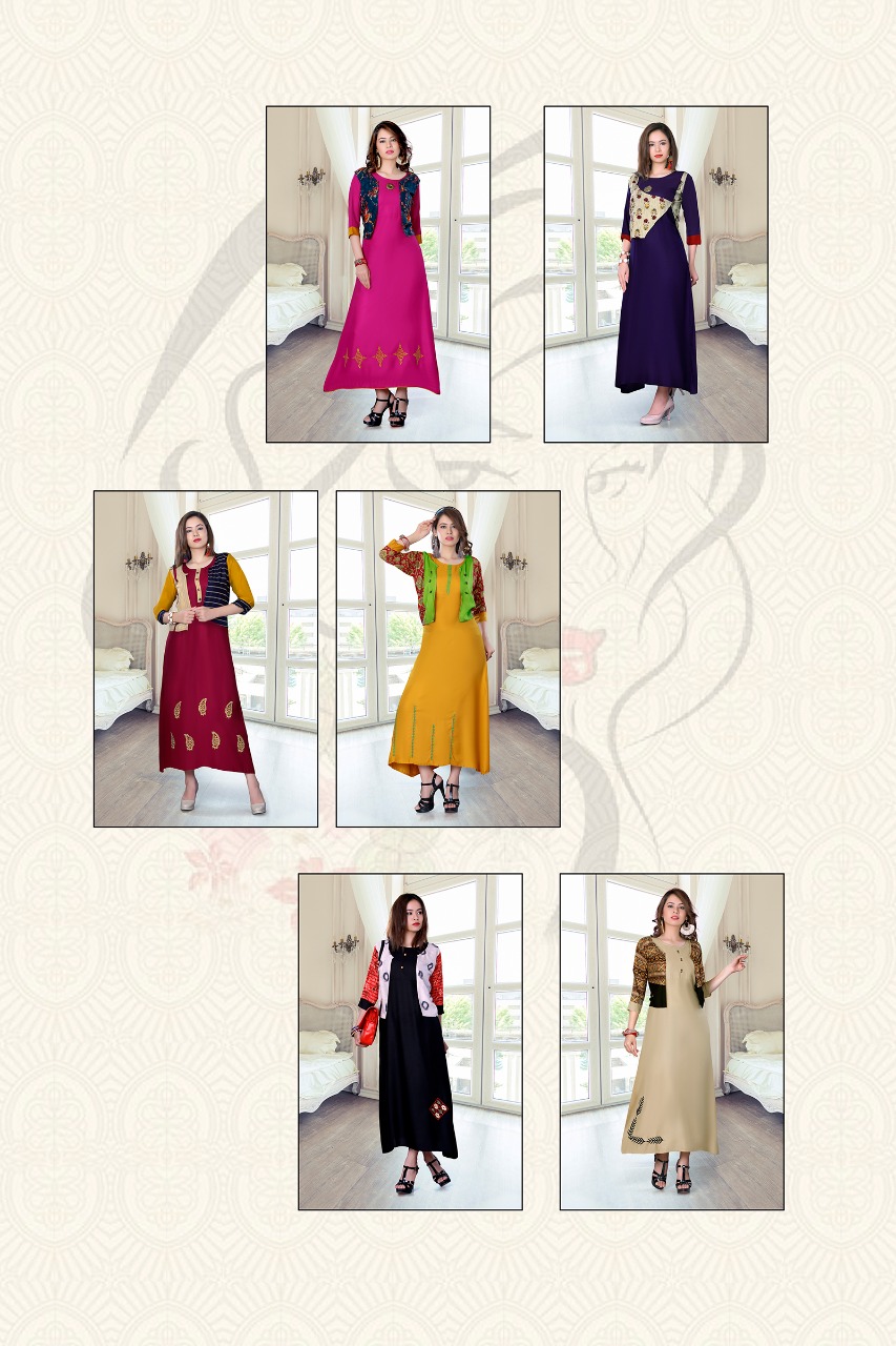 Buy Online Mj Star Designer Reyon Kurti With Koti Catlog Wholesale Dealer And Supplier Surat 6 Pcs of Full Catalogue at Wholesale Price. Looking for Mj Star Designer Reyon Kurti With Koti Catlog Wholesale Dealer And Supplier Surat Full Catalouge at Best Price? Buy Now Mj Star Designer Reyon Kurti With Koti Catlog Wholesale Dealer And Supplier Surat at Wholesale Rate of Rs 3564 with Total 6 Pcs from authroized dealer and supplier of Mj Brand. Cost of Each piece is just only Rs 594 which is very low and affordable price to resale the product in your retail store ,This is Surat based Wholesale Supplier & Dealer of Mj Brand. Click on Brand name to Know more about Mj Brand's products.Call or Whatsapp on 9898838984 for booking or enquiry
