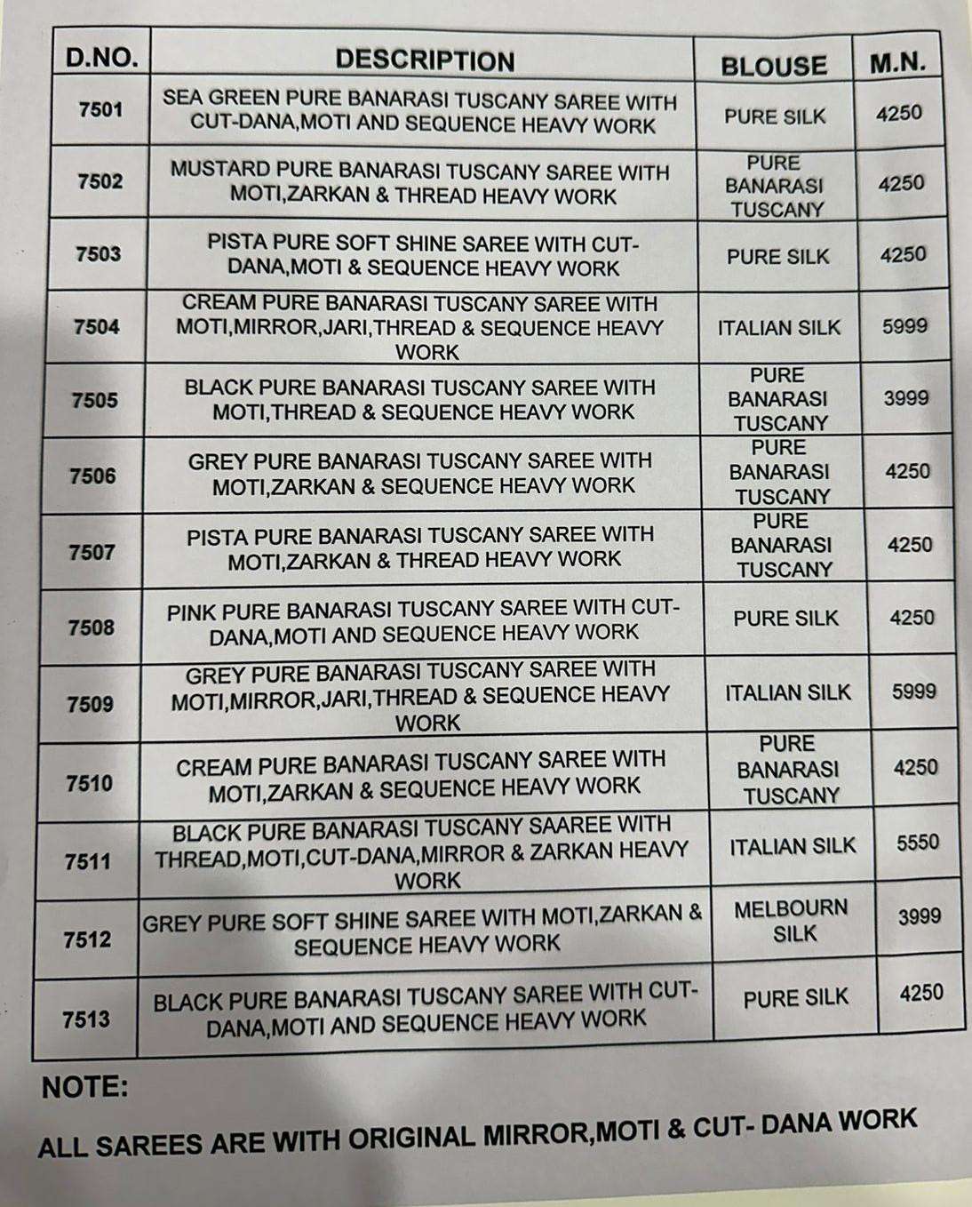 Buy Online Mn 7500 Designer Saree Series 7501 to 7513 By Attached Party Wear saree collection manufacturer surat 13 Pcs of Full Catalogue at Wholesale Price. Looking for Mn 7500 Designer Saree Series 7501 to 7513 By Attached Party Wear saree collection manufacturer surat Full Catalouge at Best Price? Buy Now Mn 7500 Designer Saree Series 7501 to 7513 By Attached Party Wear saree collection manufacturer surat at Wholesale Rate of Rs 0 with Total 13 Pcs from authroized dealer and supplier of MN SAREES Brand. Cost of Each piece is just only Rs 0 which is very low and affordable price to resale the product in your retail store ,This is Surat based Wholesale Supplier & Dealer of MN SAREES Brand. Click on Brand name to Know more about MN SAREES Brand's products.Call or Whatsapp on 9898838984 for booking or enquiry
