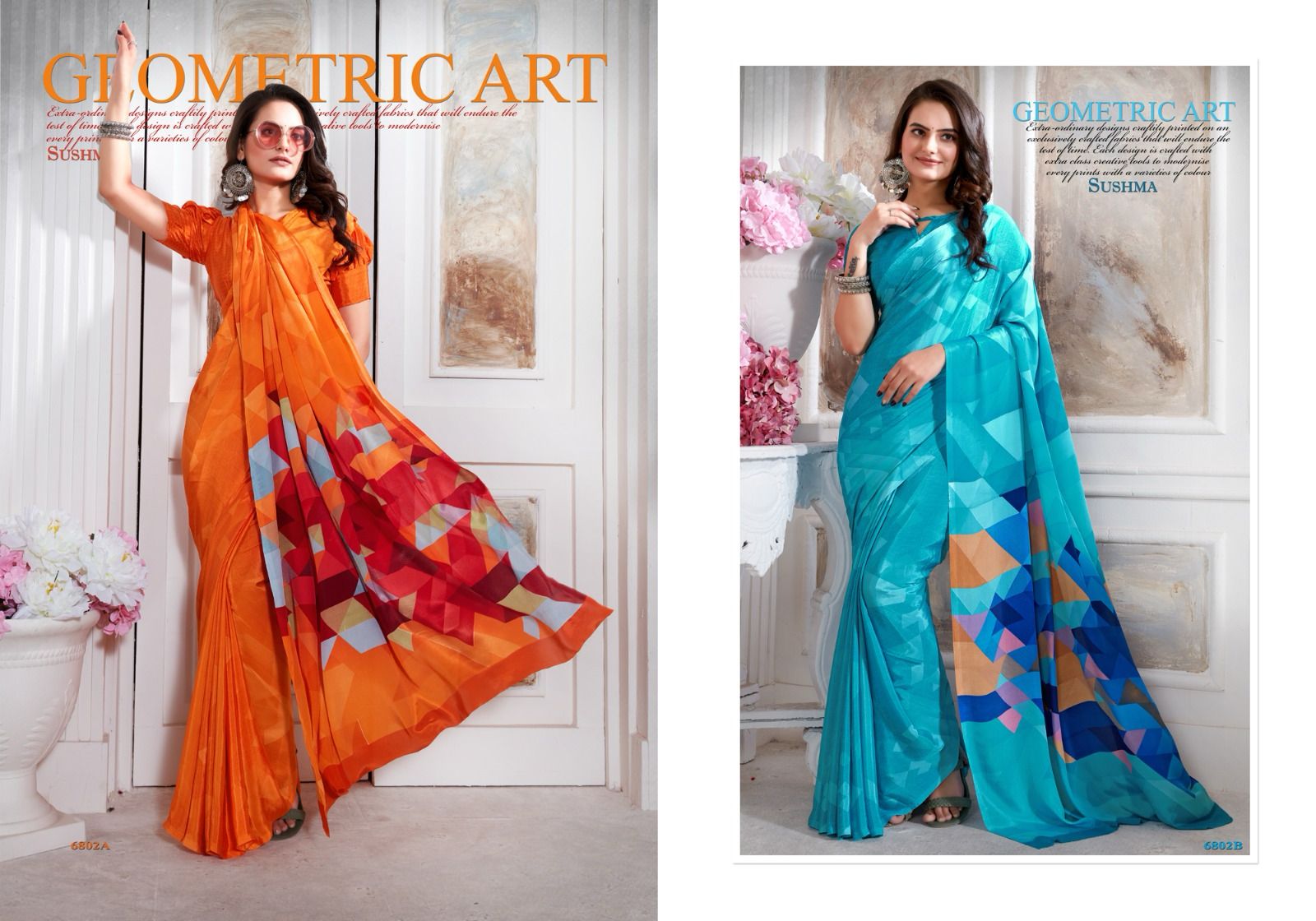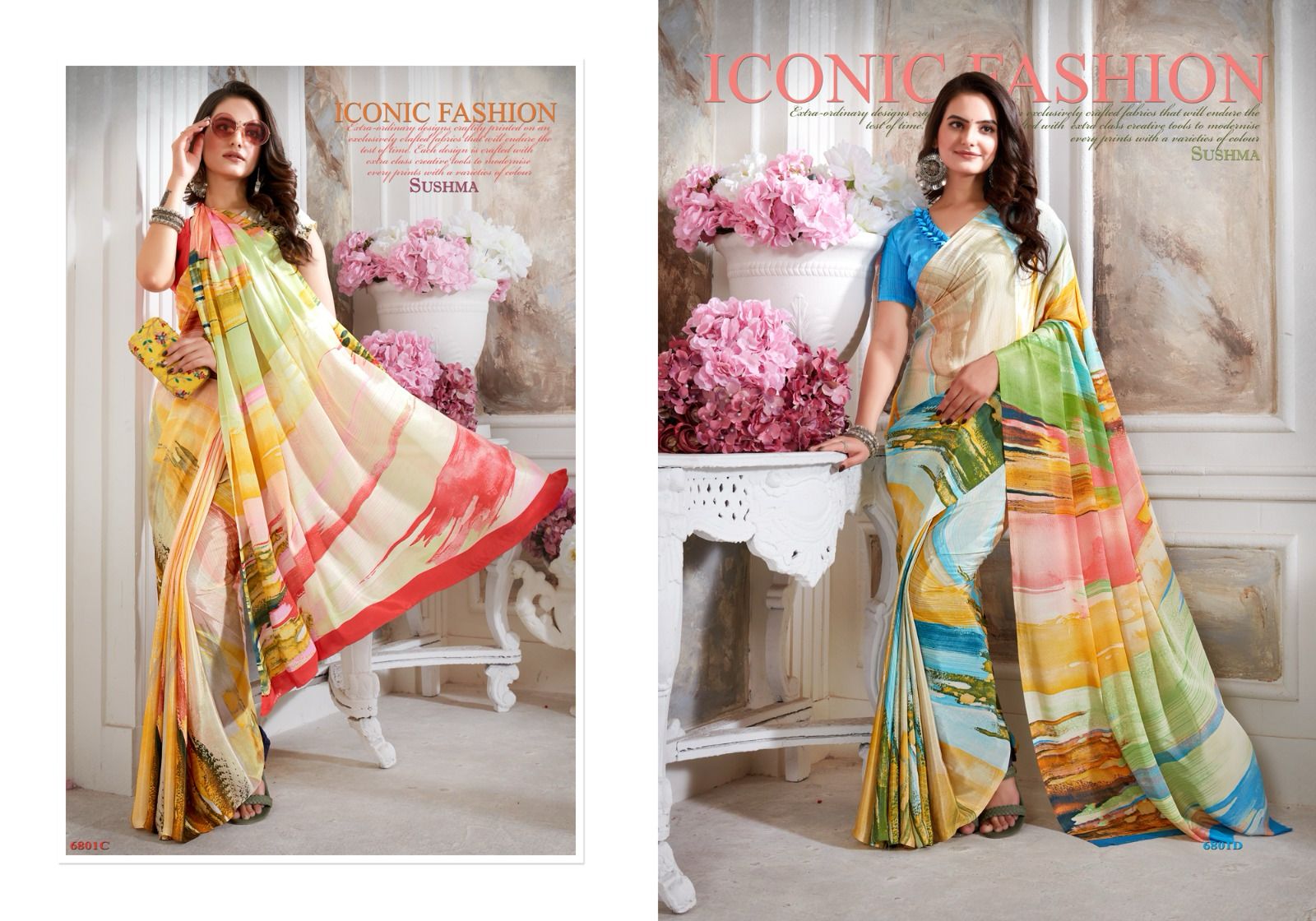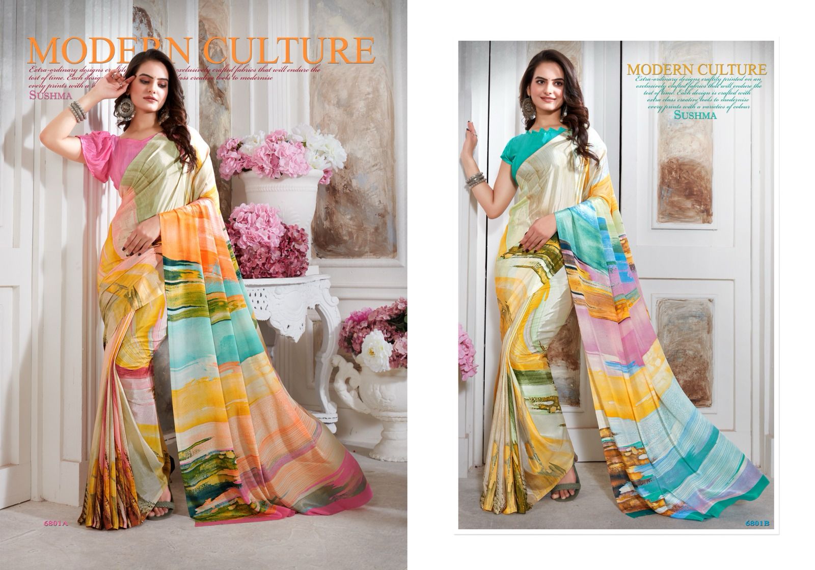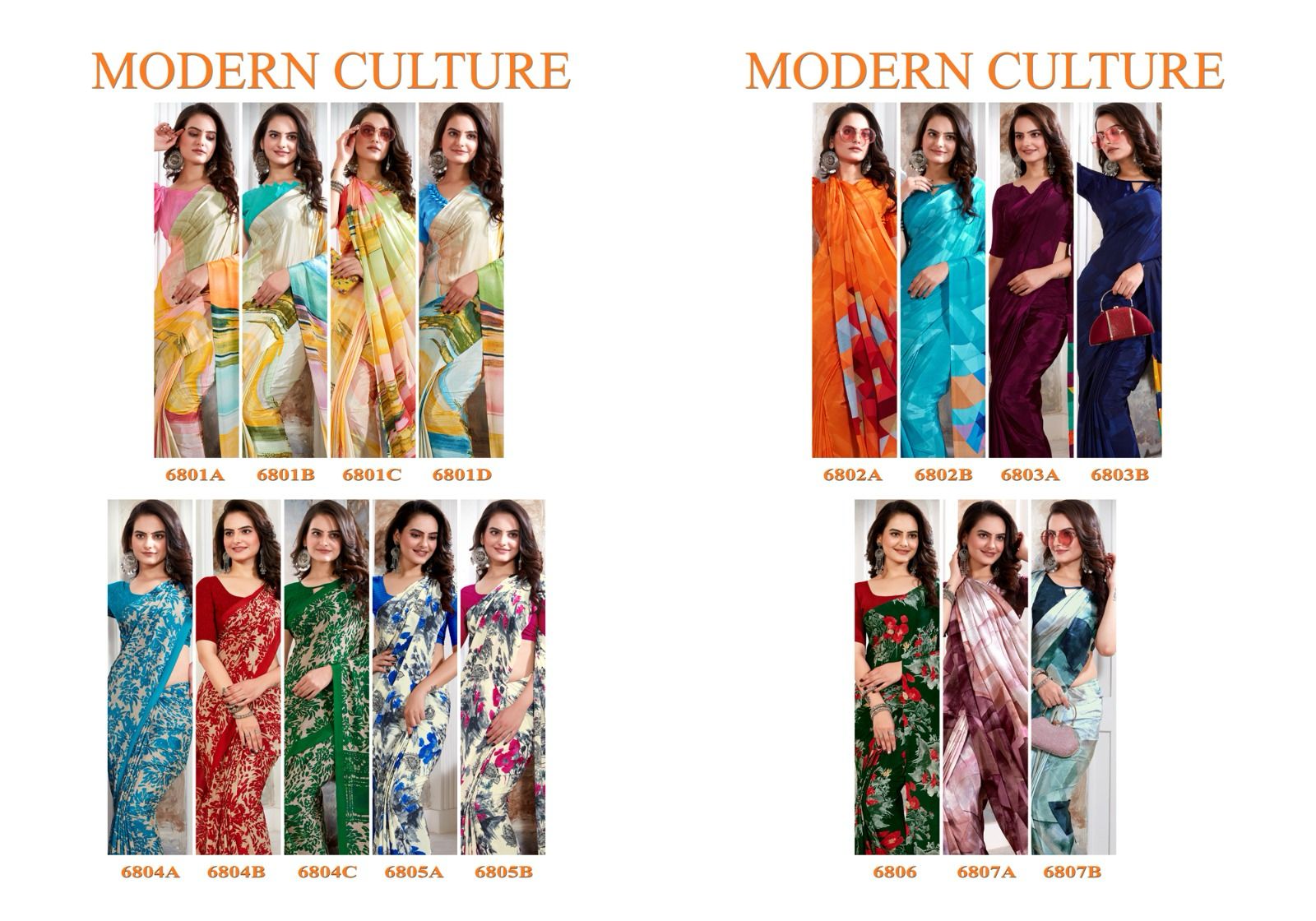 Brand _ Sushma MODERN CULTURE CATALOG (6801 SERIES) FASHION CRAPE (FABRIC : CRAPE SAREES) Price _ 615/- per pcs GST EXTRA 6.30 MTRS 16 SAREES single available 100+ SINGLE |