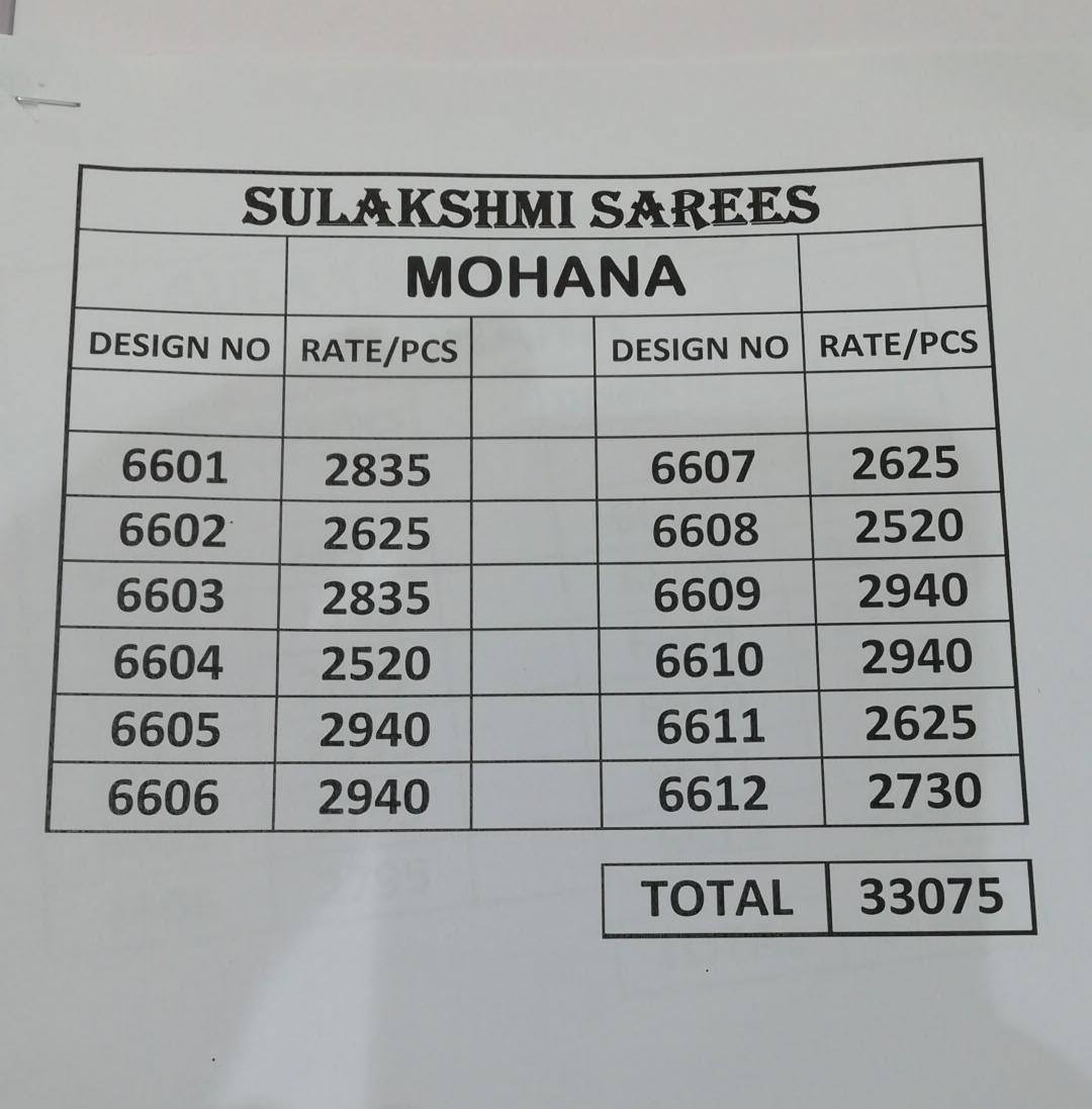 Buy Online Mohana By Sulakshmi Saree Wholesale Suppliers And Dealer From India 12 Pcs of Full Catalogue at Wholesale Price. Looking for Mohana By Sulakshmi Saree Wholesale Suppliers And Dealer From India Full Catalouge at Best Price? Buy Now Mohana By Sulakshmi Saree Wholesale Suppliers And Dealer From India at Wholesale Rate of Rs 0 with Total 12 Pcs from authroized dealer and supplier of Brand. Cost of Each piece is just only Rs 0 which is very low and affordable price to resale the product in your retail store ,This is Surat based Wholesale Supplier & Dealer of Brand. Click on Brand name to Know more about Brand's products.Call or Whatsapp on 9898838984 for booking or enquiry