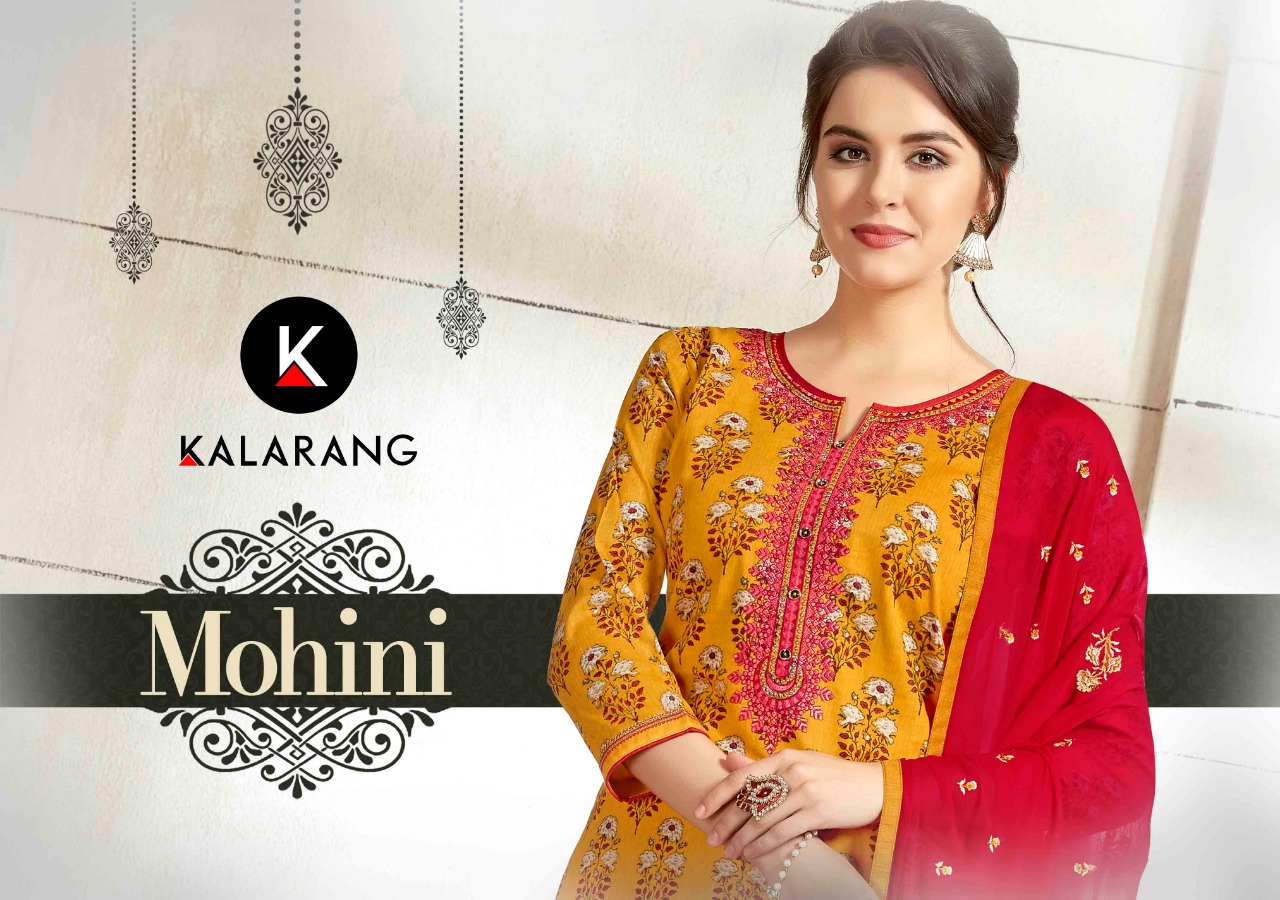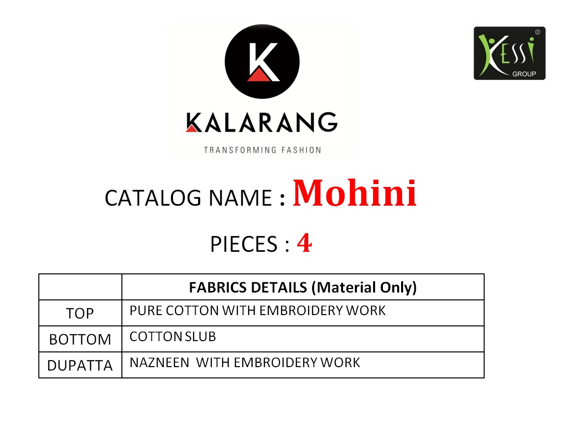 Buy Online Mohini By Kalarang Cotton Embroidered Designer Suits Catalog Wholesale Supplier And Dealer Gujarat 4 Pcs of Full Catalogue at Wholesale Price. Looking for Mohini By Kalarang Cotton Embroidered Designer Suits Catalog Wholesale Supplier And Dealer Gujarat Full Catalouge at Best Price? Buy Now Mohini By Kalarang Cotton Embroidered Designer Suits Catalog Wholesale Supplier And Dealer Gujarat at Wholesale Rate of Rs 2600 with Total 4 Pcs from authroized dealer and supplier of KALARANG Brand. Cost of Each piece is just only Rs 650 which is very low and affordable price to resale the product in your retail store ,This is Surat based Wholesale Supplier & Dealer of KALARANG Brand. Click on Brand name to Know more about KALARANG Brand's products.Call or Whatsapp on 9898838984 for booking or enquiry