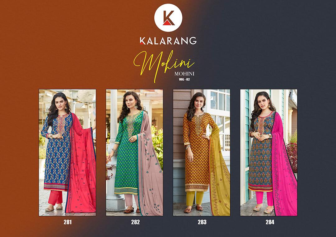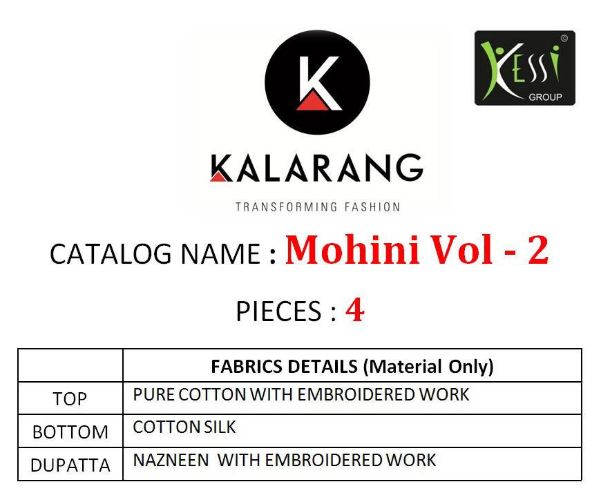 Buy Online Mohini Vol 2 By Kalarang Pure Cotton Embroidered Designer Suits Wholesale Exporter Nd Trader Nitya Nx Surat 4 Pcs of Full Catalogue at Wholesale Price. Looking for Mohini Vol 2 By Kalarang Pure Cotton Embroidered Designer Suits Wholesale Exporter Nd Trader Nitya Nx Surat Full Catalouge at Best Price? Buy Now Mohini Vol 2 By Kalarang Pure Cotton Embroidered Designer Suits Wholesale Exporter Nd Trader Nitya Nx Surat at Wholesale Rate of Rs 2600 with Total 4 Pcs from authroized dealer and supplier of KALARANG Brand. Cost of Each piece is just only Rs 650 which is very low and affordable price to resale the product in your retail store ,This is Surat based Wholesale Supplier & Dealer of KALARANG Brand. Click on Brand name to Know more about KALARANG Brand's products.Call or Whatsapp on 9898838984 for booking or enquiry