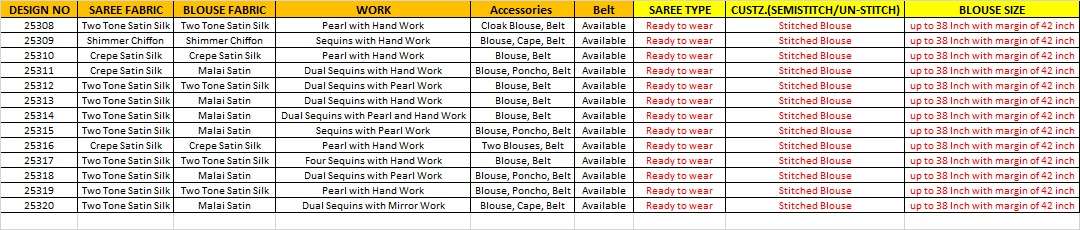 *Additional Details* - *Fabric Details:* Attached (please refer to fabric details) - *Blouse Type:* Stitched (size up to 38 inches with a margin of 42 inches) - *Availability:* Singles and set-wise available - *Shipping Time:* Ready to ship |