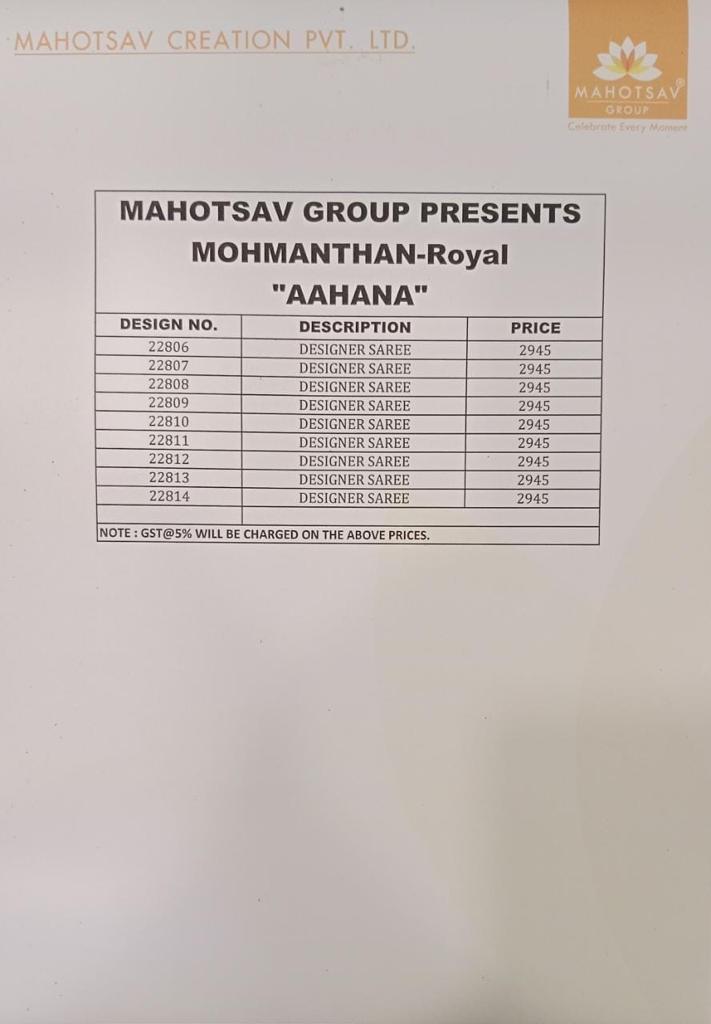 Buy Online Mohmanthan Aahana Series 22800 By Mahotsav Party Wear Collection Manufacturer Surat 9 Pcs of Full Catalogue at Wholesale Price. Looking for Mohmanthan Aahana Series 22800 By Mahotsav Party Wear Collection Manufacturer Surat Full Catalouge at Best Price? Buy Now Mohmanthan Aahana Series 22800 By Mahotsav Party Wear Collection Manufacturer Surat at Wholesale Rate of Rs 26505 with Total 9 Pcs from authroized dealer and supplier of Mahotsav Saree Brand. Cost of Each piece is just only Rs 2945 which is very low and affordable price to resale the product in your retail store ,This is Surat based Wholesale Supplier & Dealer of Mahotsav Saree Brand. Click on Brand name to Know more about Mahotsav Saree Brand's products.Call or Whatsapp on 9898838984 for booking or enquiry