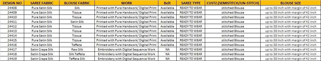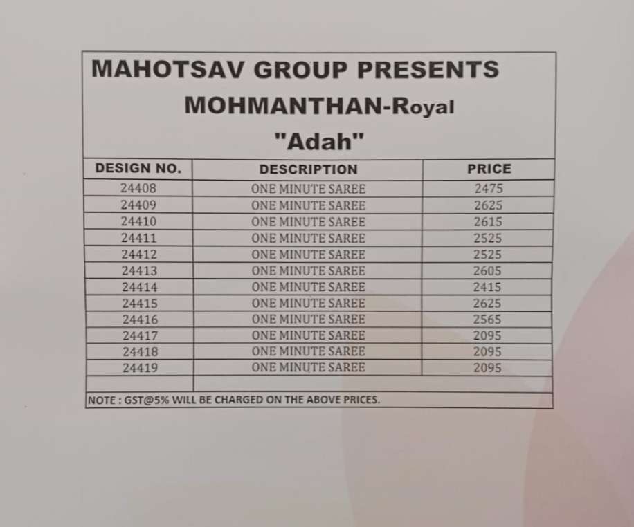Buy Online Mohmanthan Adah Series 24408 To 24419 by Mahotsav Attached saree collection manufacturer surat 12 Pcs of Full Catalogue at Wholesale Price. Looking for Mohmanthan Adah Series 24408 To 24419 by Mahotsav Attached saree collection manufacturer surat Full Catalouge at Best Price? Buy Now Mohmanthan Adah Series 24408 To 24419 by Mahotsav Attached saree collection manufacturer surat at Wholesale Rate of Rs 0 with Total 12 Pcs from authroized dealer and supplier of Mahotsav Saree Brand. Cost of Each piece is just only Rs 0 which is very low and affordable price to resale the product in your retail store ,This is Surat based Wholesale Supplier & Dealer of Mahotsav Saree Brand. Click on Brand name to Know more about Mahotsav Saree Brand's products.Call or Whatsapp on 9898838984 for booking or enquiry