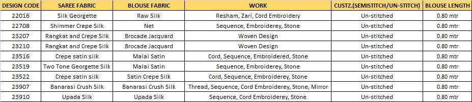| Note | Stitching available on customer Requirment For Sarees , Salwar Kameez, Lehengha.(i.e M,L,XL,XXL). |