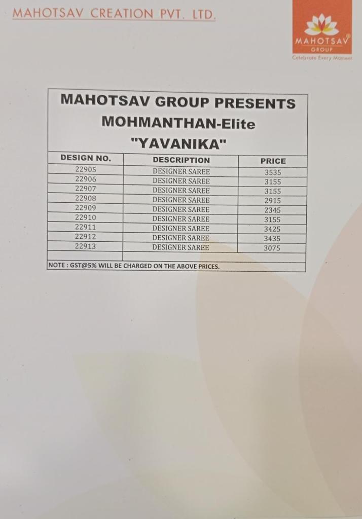Buy Online Mohmanthan Series 22900 Yavanika By Mahotsav Party Wear Saree Collection Manufacturer Surat 9 Pcs of Full Catalogue at Wholesale Price. Looking for Mohmanthan Series 22900 Yavanika By Mahotsav Party Wear Saree Collection Manufacturer Surat Full Catalouge at Best Price? Buy Now Mohmanthan Series 22900 Yavanika By Mahotsav Party Wear Saree Collection Manufacturer Surat at Wholesale Rate of Rs 0 with Total 9 Pcs from authroized dealer and supplier of Mahotsav Saree Brand. Cost of Each piece is just only Rs 0 which is very low and affordable price to resale the product in your retail store ,This is Surat based Wholesale Supplier & Dealer of Mahotsav Saree Brand. Click on Brand name to Know more about Mahotsav Saree Brand's products.Call or Whatsapp on 9898838984 for booking or enquiry