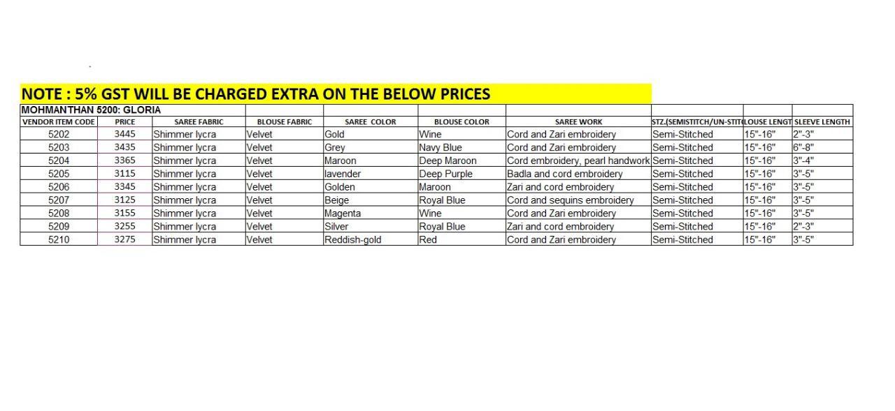 Brand -Mahotsav. Series -5202 to 5210. Set & Loose. Price list attached Single Extra 100 on company price GST 5 Percent Extra. Delivery- Running |