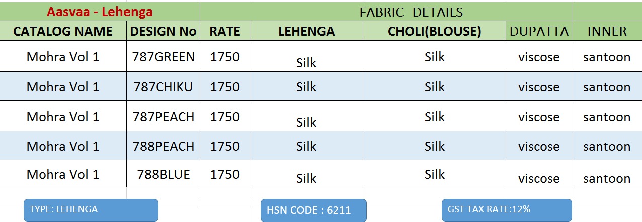 Buy Online Mohra Vol 1 By Aasvaa Silk Fabric Designer Wedding Wear Lehngas Wholesale Supplier And Dealer Nityanx Surat 5 Pcs of Full Catalogue at Wholesale Price. Looking for Mohra Vol 1 By Aasvaa Silk Fabric Designer Wedding Wear Lehngas Wholesale Supplier And Dealer Nityanx Surat Full Catalouge at Best Price? Buy Now Mohra Vol 1 By Aasvaa Silk Fabric Designer Wedding Wear Lehngas Wholesale Supplier And Dealer Nityanx Surat at Wholesale Rate of Rs 8750 with Total 5 Pcs from authroized dealer and supplier of Brand. Cost of Each piece is just only Rs 1750 which is very low and affordable price to resale the product in your retail store ,This is Surat based Wholesale Supplier & Dealer of Brand. Click on Brand name to Know more about Brand's products.Call or Whatsapp on 9898838984 for booking or enquiry