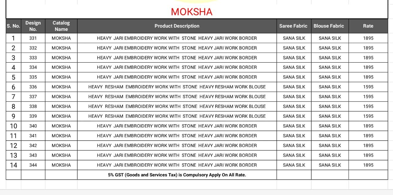 Brand - Naree. Type - Saree. Series - 331 to 344. GST 5 Percent Extra. Delivery- Running Full set and single also Rate list atteched in pics Book now |
