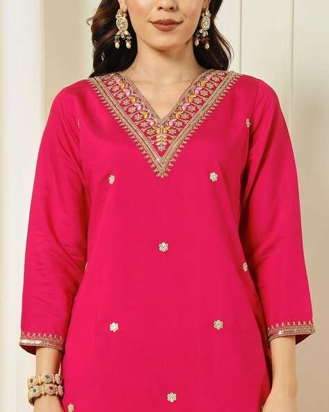 *Kurti Details* - *Material:* Chanderi - *Length:* 45 inches - *Work:* Embroidery - *Bust Size:* Up to 44 inches