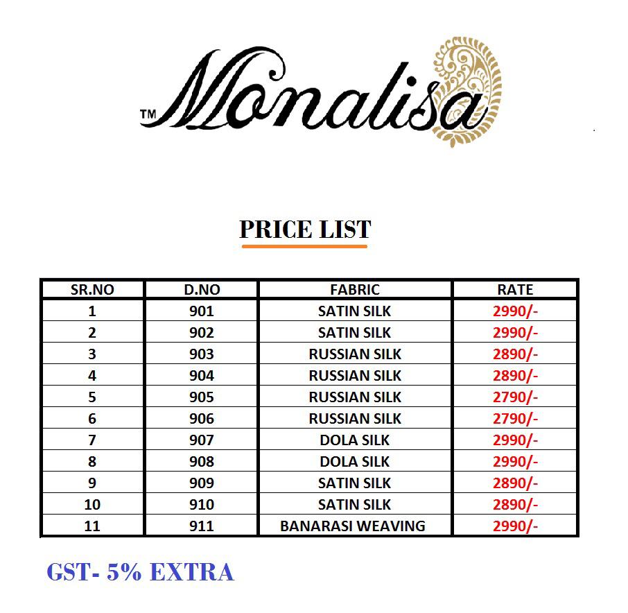 Buy Online Monalisa 901 Series Fancy Heavy Bridal Party Wear Saree Collection Wholesaler Surat 11 Pcs of Full Catalogue at Wholesale Price. Looking for Monalisa 901 Series Fancy Heavy Bridal Party Wear Saree Collection Wholesaler Surat Full Catalouge at Best Price? Buy Now Monalisa 901 Series Fancy Heavy Bridal Party Wear Saree Collection Wholesaler Surat at Wholesale Rate of Rs 0 with Total 11 Pcs from authroized dealer and supplier of Brand. Cost of Each piece is just only Rs 0 which is very low and affordable price to resale the product in your retail store ,This is Surat based Wholesale Supplier & Dealer of Brand. Click on Brand name to Know more about Brand's products.Call or Whatsapp on 9898838984 for booking or enquiry