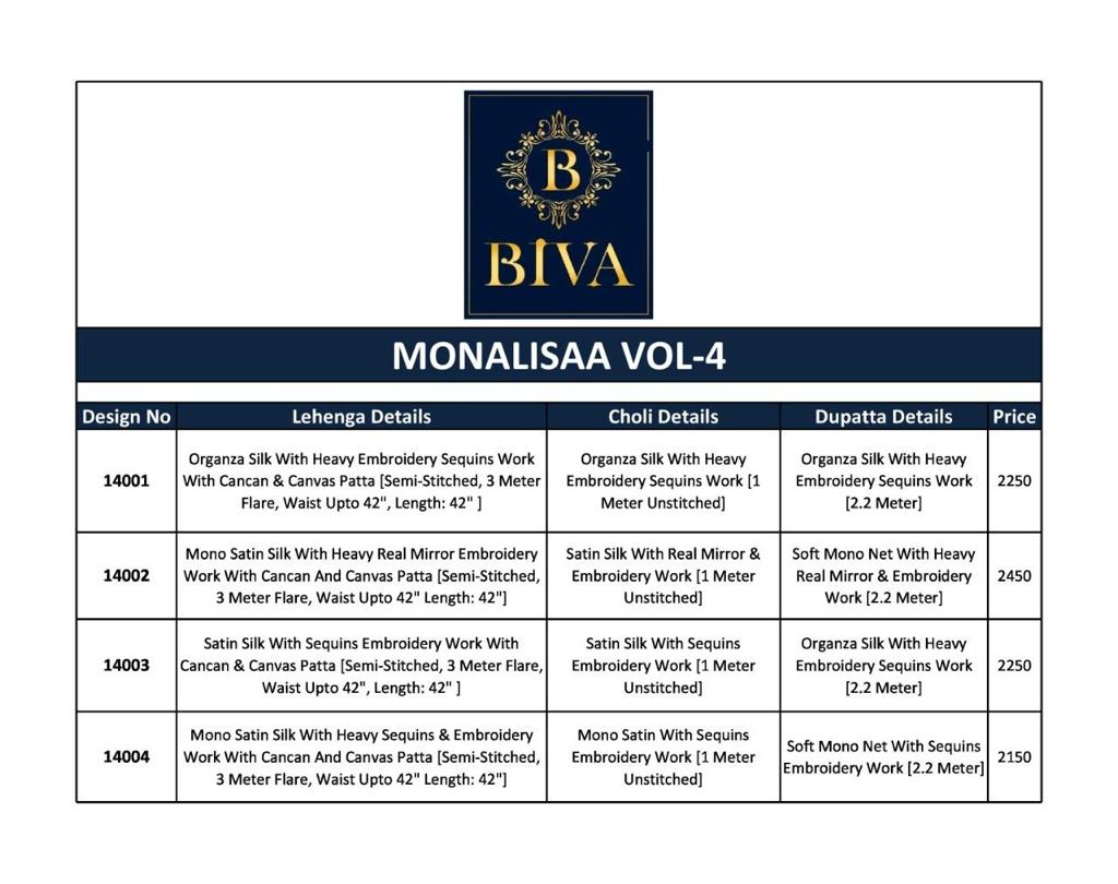 Buy Online Monalisa Vol 4 Series 14001 To 14004 By Biva Haldi Ceremony Special Designer Lehenga Choli Collection 4 Pcs of Full Catalogue at Wholesale Price. Looking for Monalisa Vol 4 Series 14001 To 14004 By Biva Haldi Ceremony Special Designer Lehenga Choli Collection Full Catalouge at Best Price? Buy Now Monalisa Vol 4 Series 14001 To 14004 By Biva Haldi Ceremony Special Designer Lehenga Choli Collection at Wholesale Rate of Rs 0 with Total 4 Pcs from authroized dealer and supplier of Brand. Cost of Each piece is just only Rs 0 which is very low and affordable price to resale the product in your retail store ,This is Surat based Wholesale Supplier & Dealer of Brand. Click on Brand name to Know more about Brand's products.Call or Whatsapp on 9898838984 for booking or enquiry