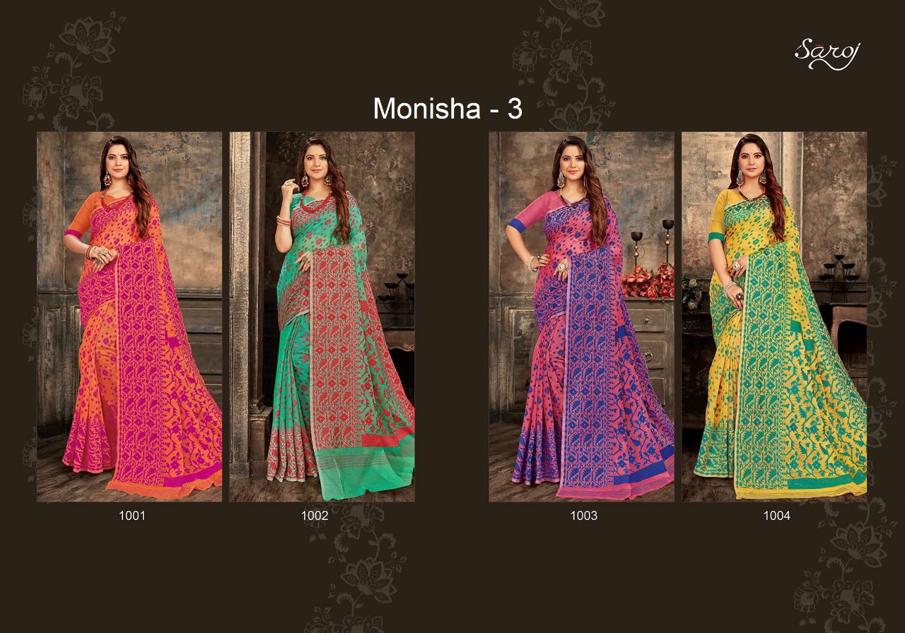 Buy Online Monisha 3 By Saroj Saree Manufacturer Traders Surat Gujrat 4 Pcs of Full Catalogue at Wholesale Price. Looking for Monisha 3 By Saroj Saree Manufacturer Traders Surat Gujrat Full Catalouge at Best Price? Buy Now Monisha 3 By Saroj Saree Manufacturer Traders Surat Gujrat at Wholesale Rate of Rs 2300 with Total 4 Pcs from authroized dealer and supplier of SAROJ SAREE Brand. Cost of Each piece is just only Rs 575 which is very low and affordable price to resale the product in your retail store ,This is Surat based Wholesale Supplier & Dealer of SAROJ SAREE Brand. Click on Brand name to Know more about SAROJ SAREE Brand's products.Call or Whatsapp on 9898838984 for booking or enquiry