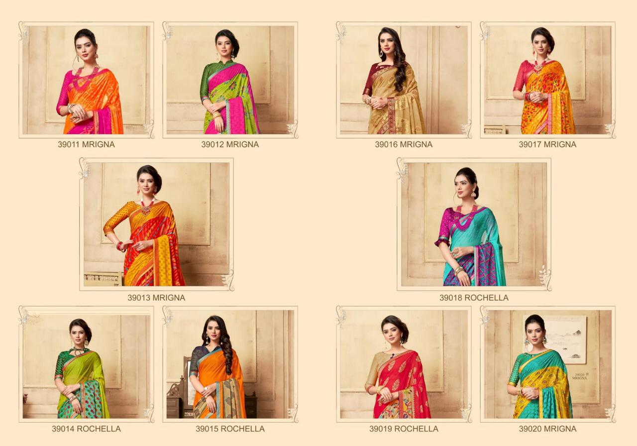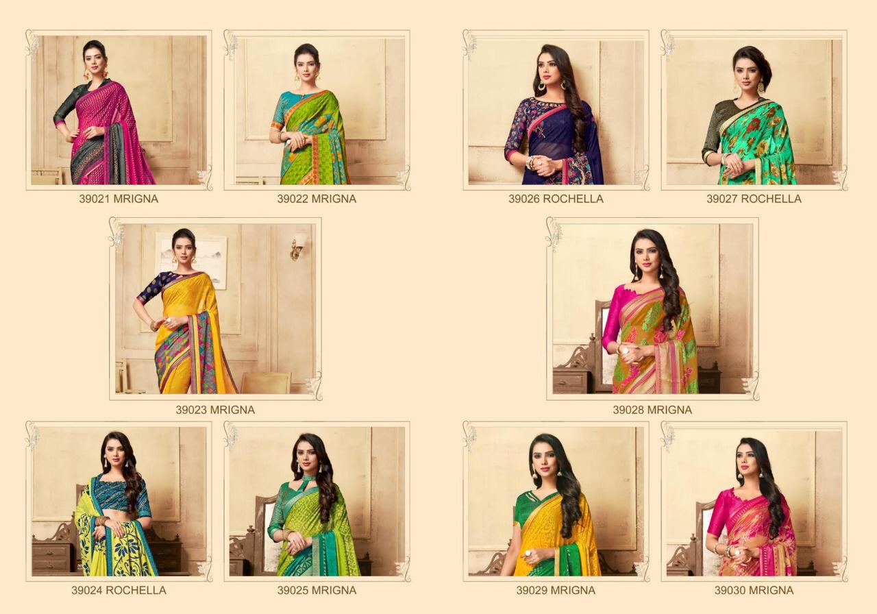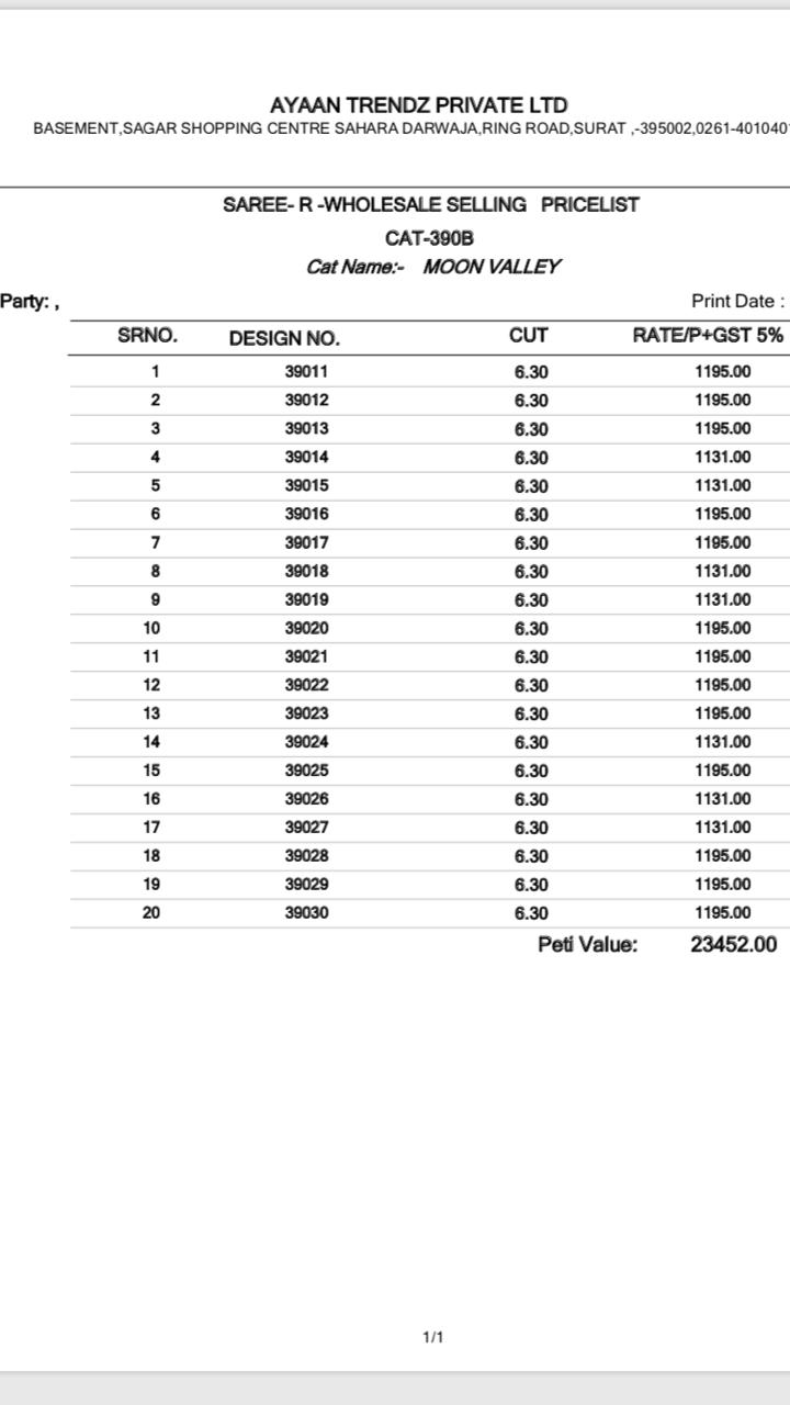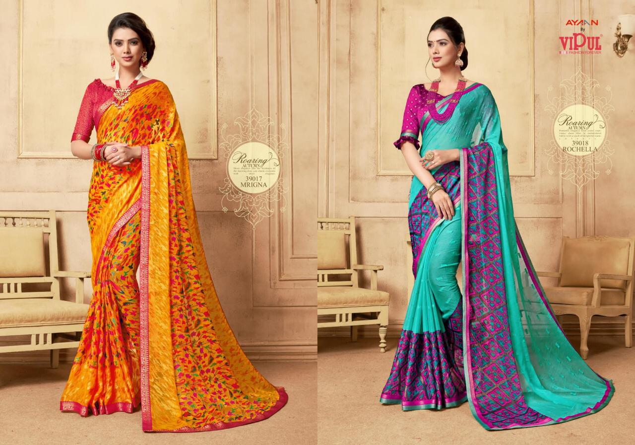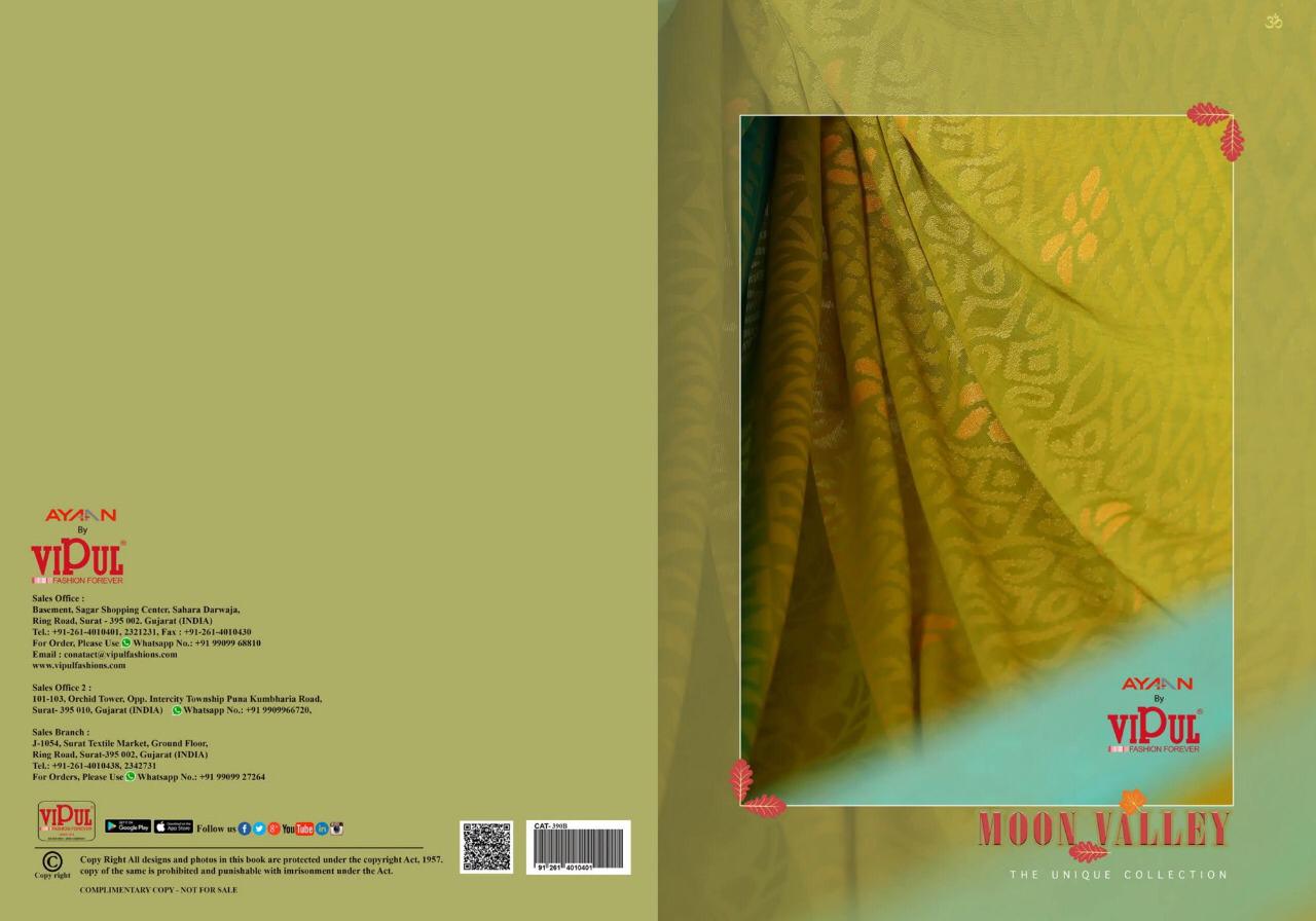 *VIPUL* (AYAAN TRENDZ PVT LTD) *CAT-390 B * *MOON VALLEY * THE UNIQUE COLLECTION FASHION EXOTIC BRIGHT COLORS IS ONE OF THE STRONGEST FASHION STATEMENT OF THE SEASON & BOLD PRINT'S. _ALL CHIFFON BRASSO WITH EXCLUSIVE FOIL AND SUPAP FANCY BORDER_ *13 DESIGNS-1195?* *7 DESIGN -1131?* *AVERAGE RATE - 1173?* 20 DESIGNS IN ONE SET BOX PACKING SET TO SET 5%GST MONDAY DESPATCHING |