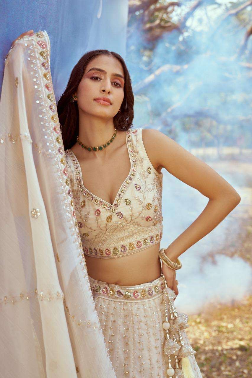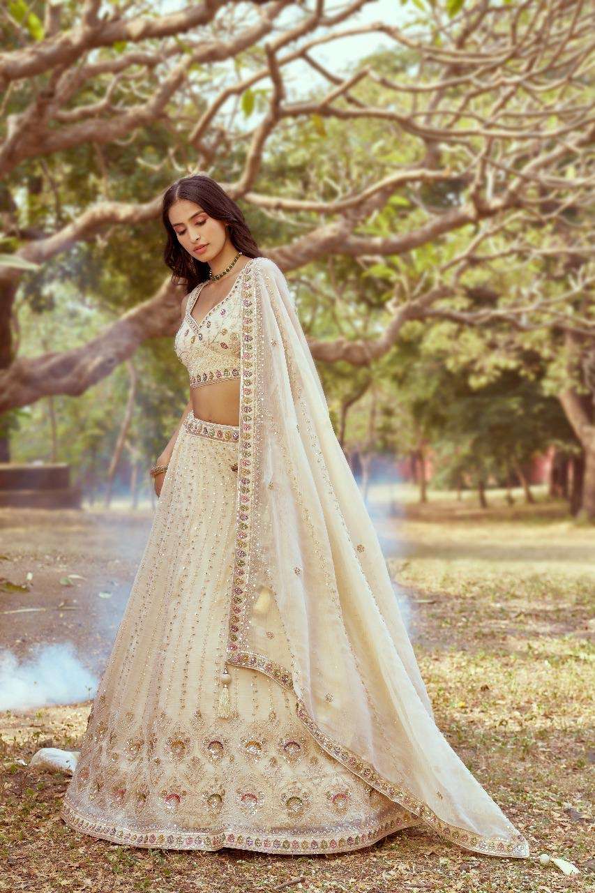 Moti hand work cream gold crushed tissue fabric lehenga choli dupatta for wedding collection manufactur surat