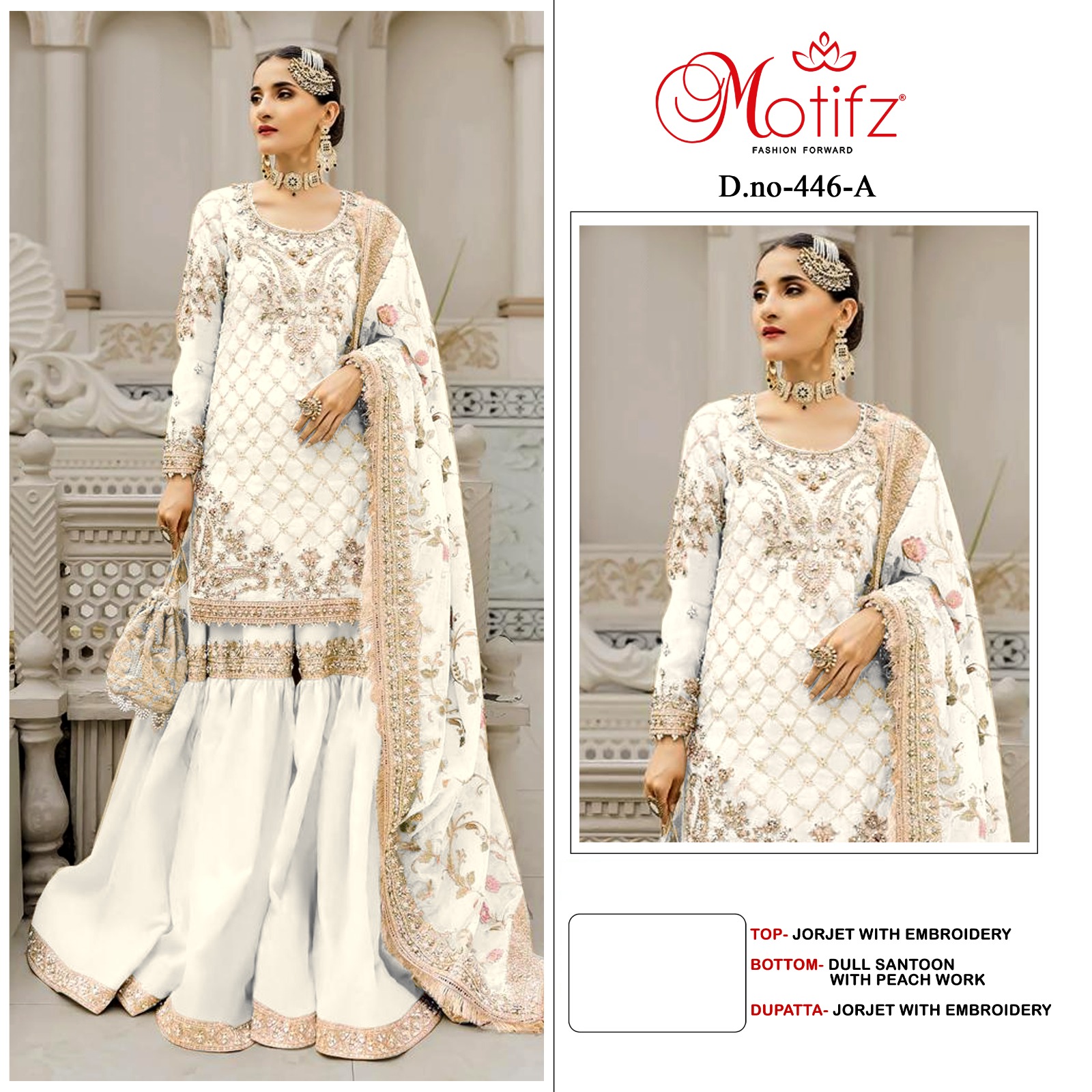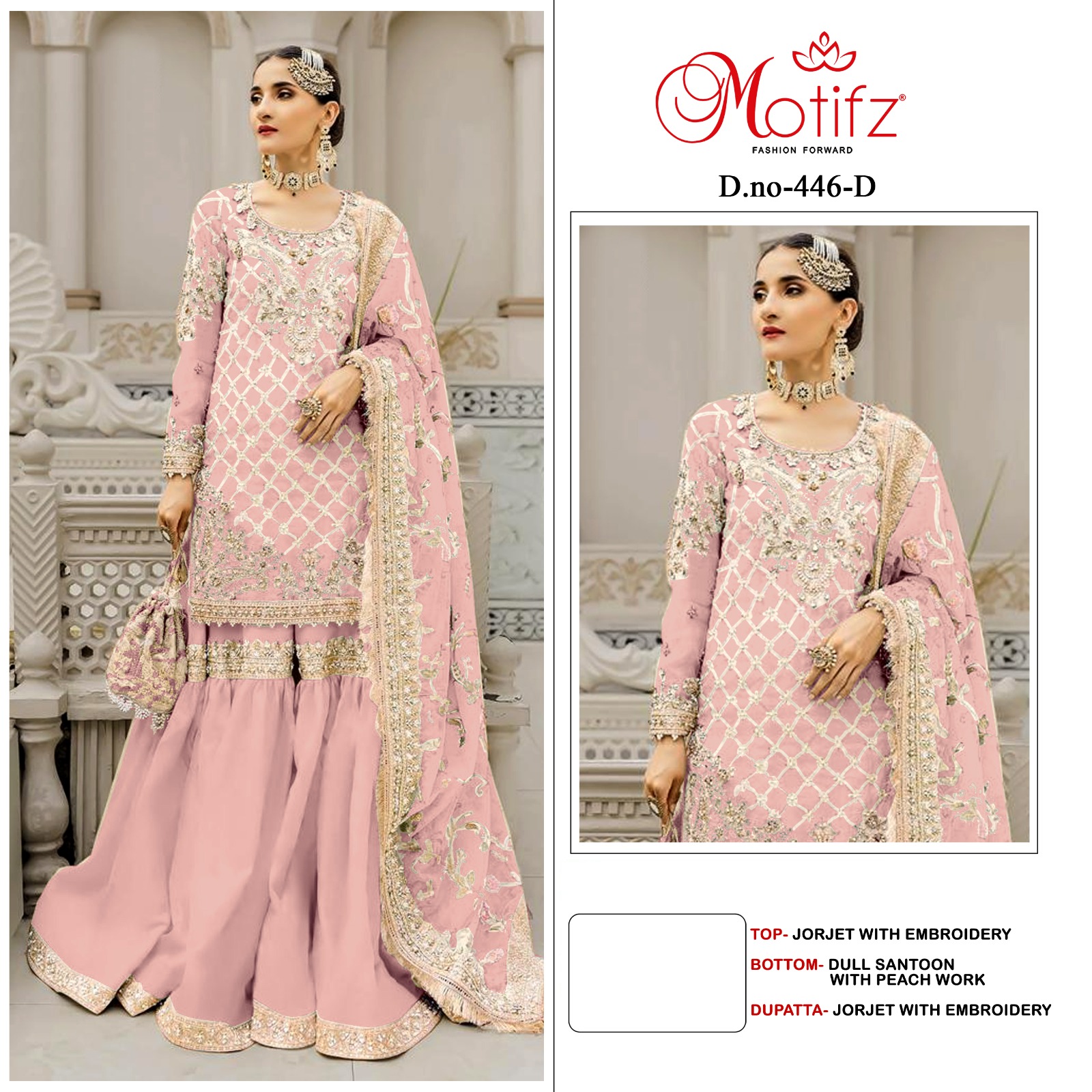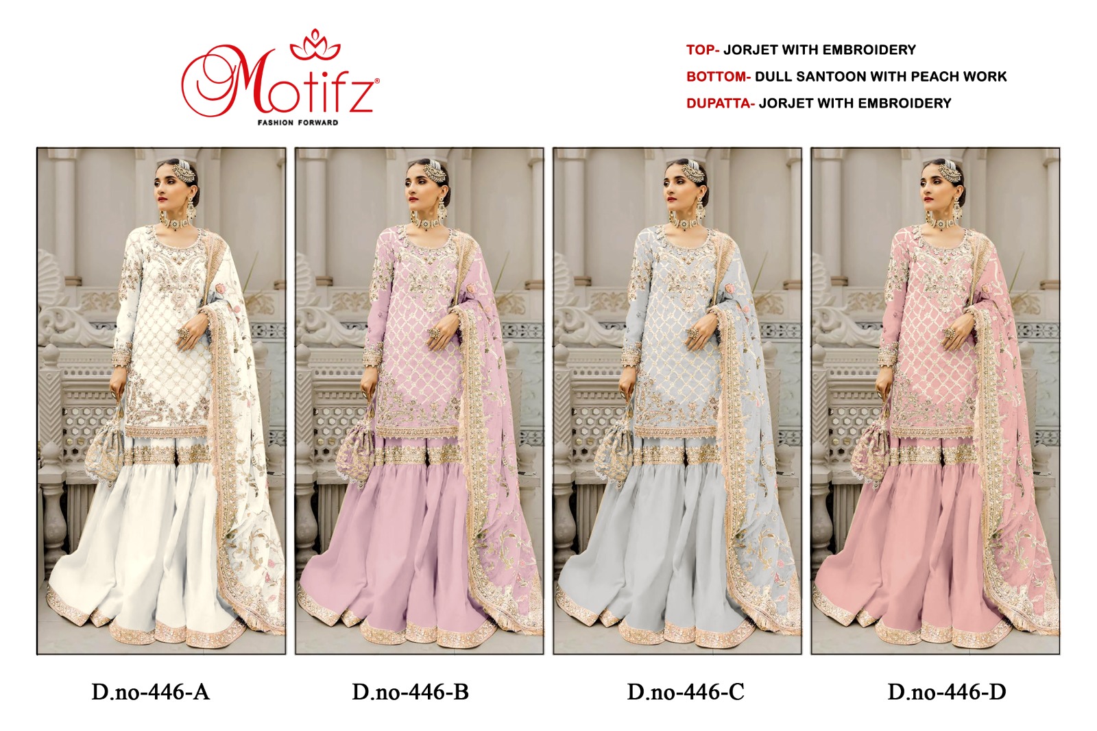 Buy Online Motifz Design 446 Abcd Georgette Embroidered Pakistani Eid Collection Manufacturer Surat 4 Pcs of Full Catalogue at Wholesale Price. Looking for Motifz Design 446 Abcd Georgette Embroidered Pakistani Eid Collection Manufacturer Surat Full Catalouge at Best Price? Buy Now Motifz Design 446 Abcd Georgette Embroidered Pakistani Eid Collection Manufacturer Surat at Wholesale Rate of Rs 4900 with Total 4 Pcs from authroized dealer and supplier of Brand. Cost of Each piece is just only Rs 1225 which is very low and affordable price to resale the product in your retail store ,This is Surat based Wholesale Supplier & Dealer of Brand. Click on Brand name to Know more about Brand's products.Call or Whatsapp on 9898838984 for booking or enquiry